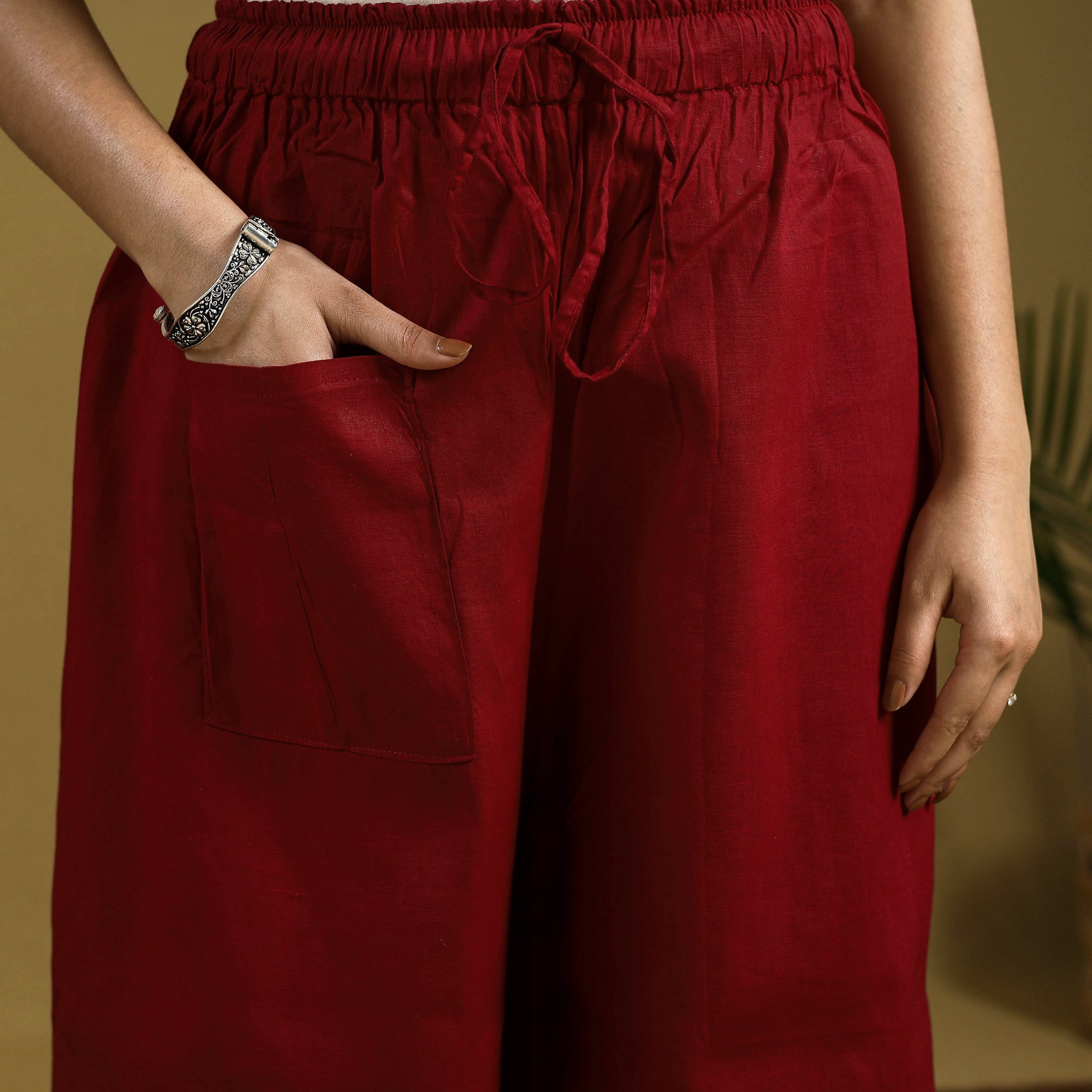 Infuse tradition into your wardrobe with this red cotton palazzo featuring kantha embroidery from Bengal. The delicate hand-stitching on lightweight cotton creates a beautiful fusion of comfort and artistry. Its roomy wide-leg cut ensures day-long ease, ideal for relaxed outings, friendly gatherings, or weekend vibes.