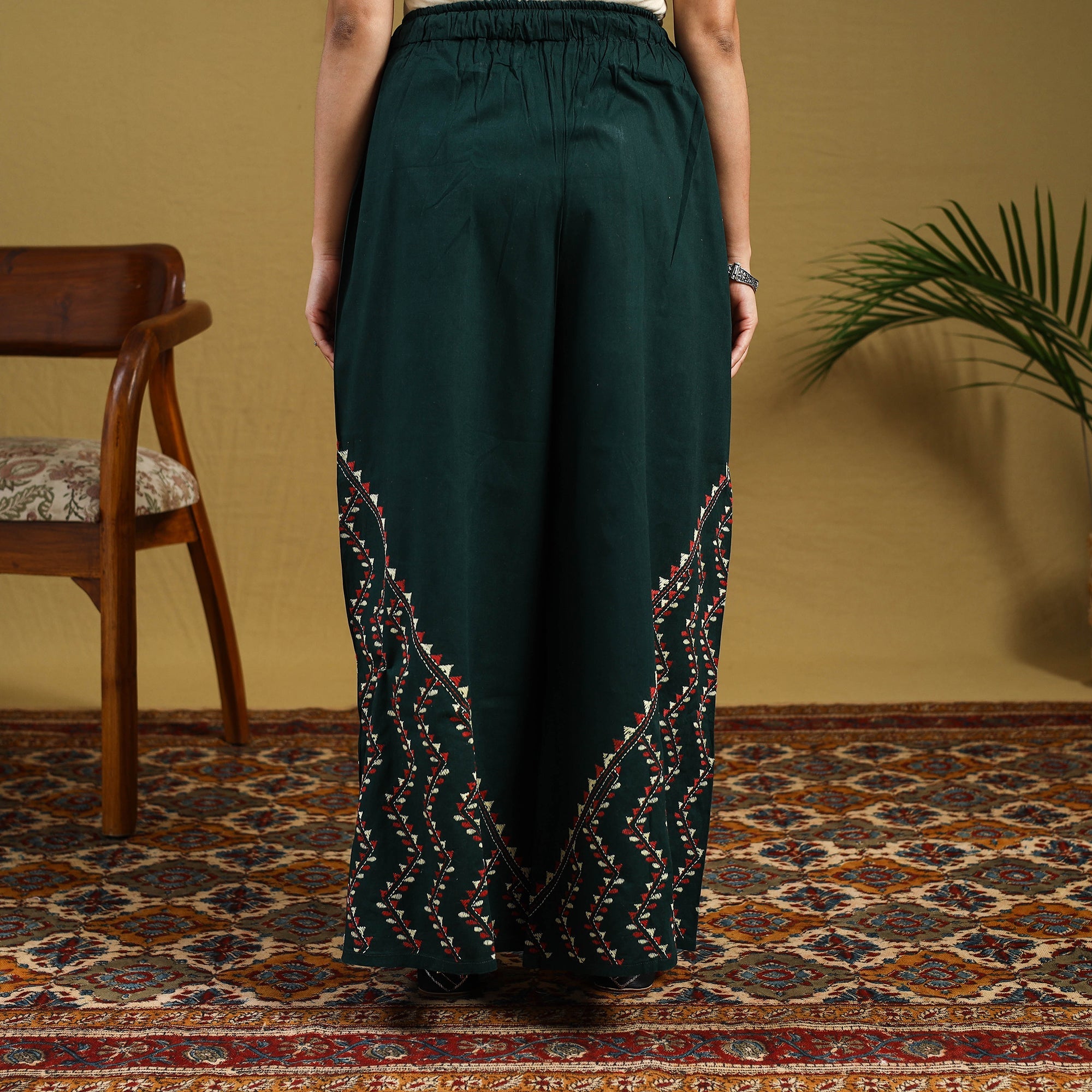 Infuse tradition into your wardrobe with this green cotton palazzo featuring kantha embroidery from Bengal. The delicate hand-stitching on lightweight cotton creates a beautiful fusion of comfort and artistry. Its roomy wide-leg cut ensures day-long ease, ideal for relaxed outings, friendly gatherings, or weekend vibes.
