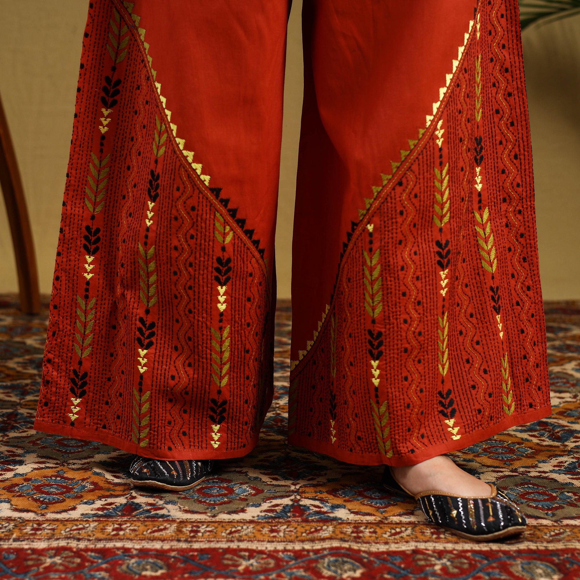 Orange - Cotton Bengal Kantha Hand Embroidery Palazzo 54