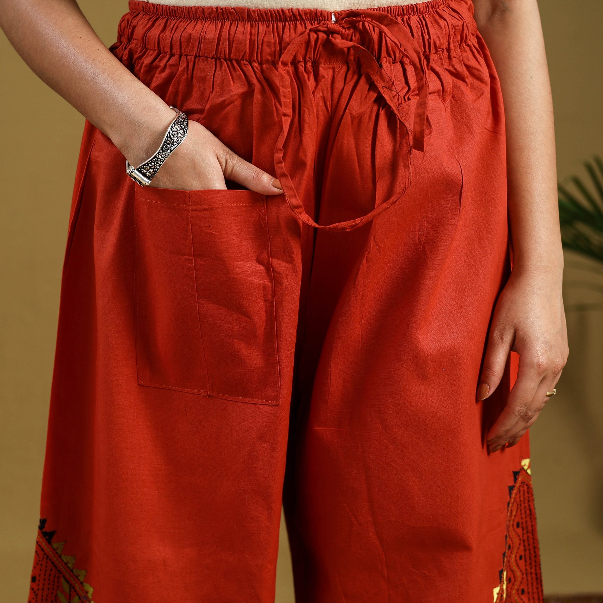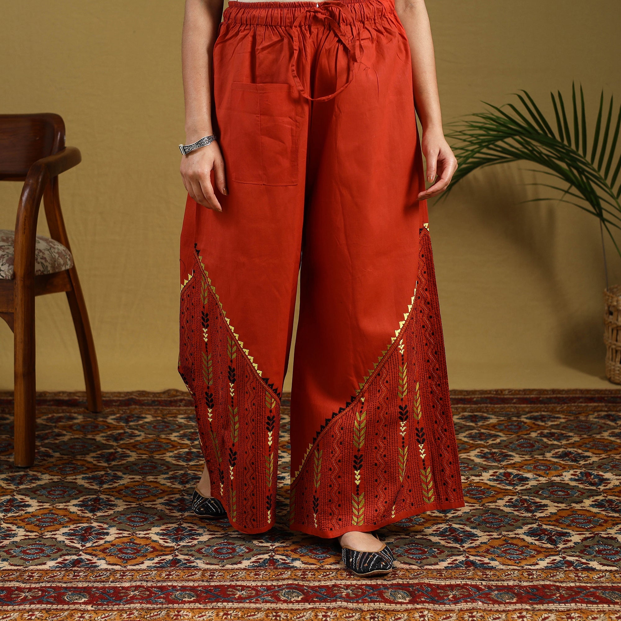 • Buy Orange Cotton Bengal Kantha Hand Embroidery Palazzo
