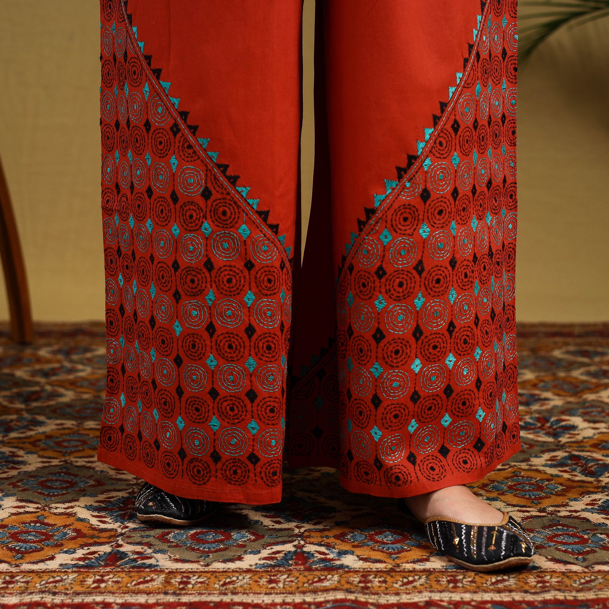 • Buy Orange Cotton Bengal Kantha Hand Embroidery Palazzo