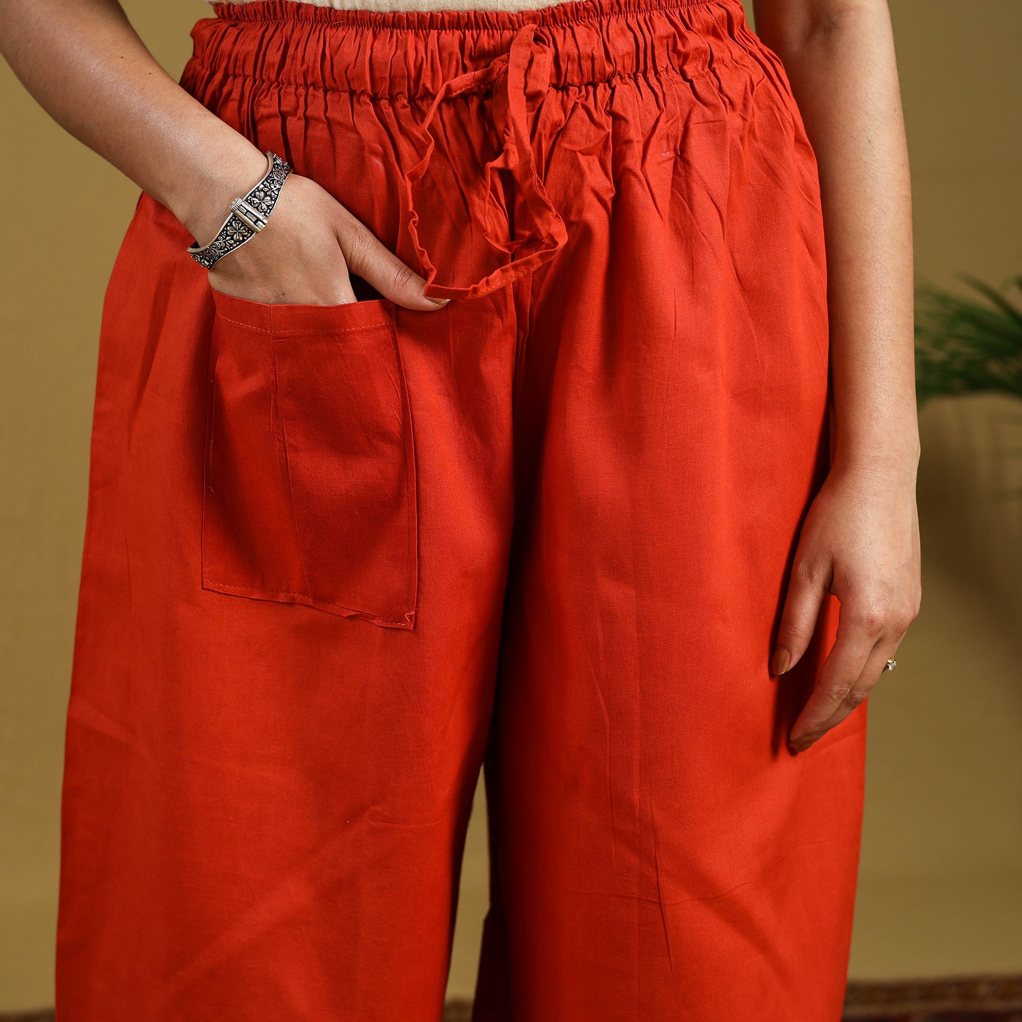 Infuse tradition into your wardrobe with this orange cotton palazzo featuring kantha embroidery from Bengal. The delicate hand-stitching on lightweight cotton creates a beautiful fusion of comfort and artistry. Its roomy wide-leg cut ensures day-long ease, ideal for relaxed outings, friendly gatherings, or weekend vibes.