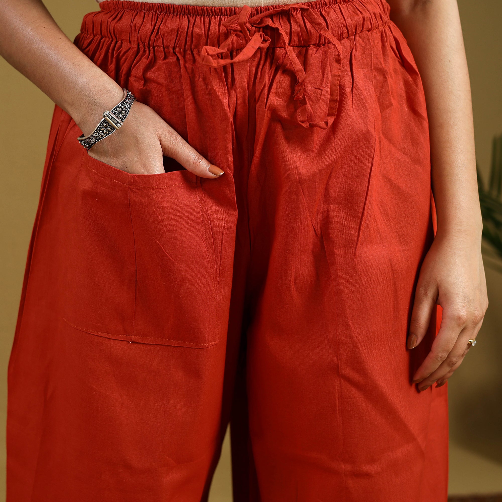 Infuse tradition into your wardrobe with this orange cotton palazzo featuring kantha embroidery from Bengal. The delicate hand-stitching on lightweight cotton creates a beautiful fusion of comfort and artistry. Its roomy wide-leg cut ensures day-long ease, ideal for relaxed outings, friendly gatherings, or weekend vibes.