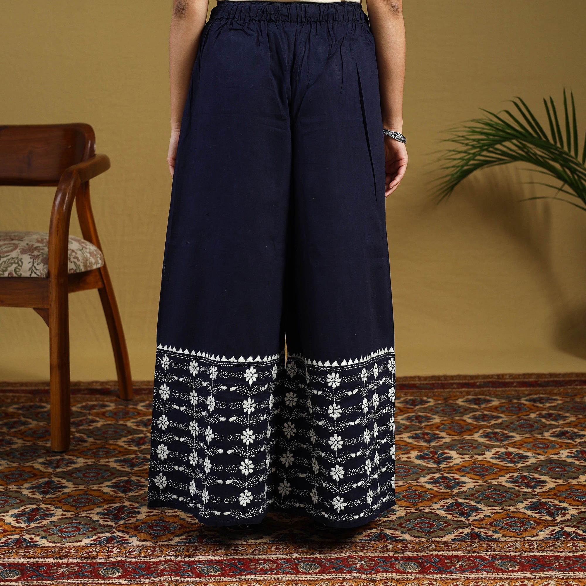 Infuse tradition into your wardrobe with this blue cotton palazzo featuring kantha embroidery from Bengal. The delicate hand-stitching on lightweight cotton creates a beautiful fusion of comfort and artistry. Its roomy wide-leg cut ensures day-long ease, ideal for relaxed outings, friendly gatherings, or weekend vibes.