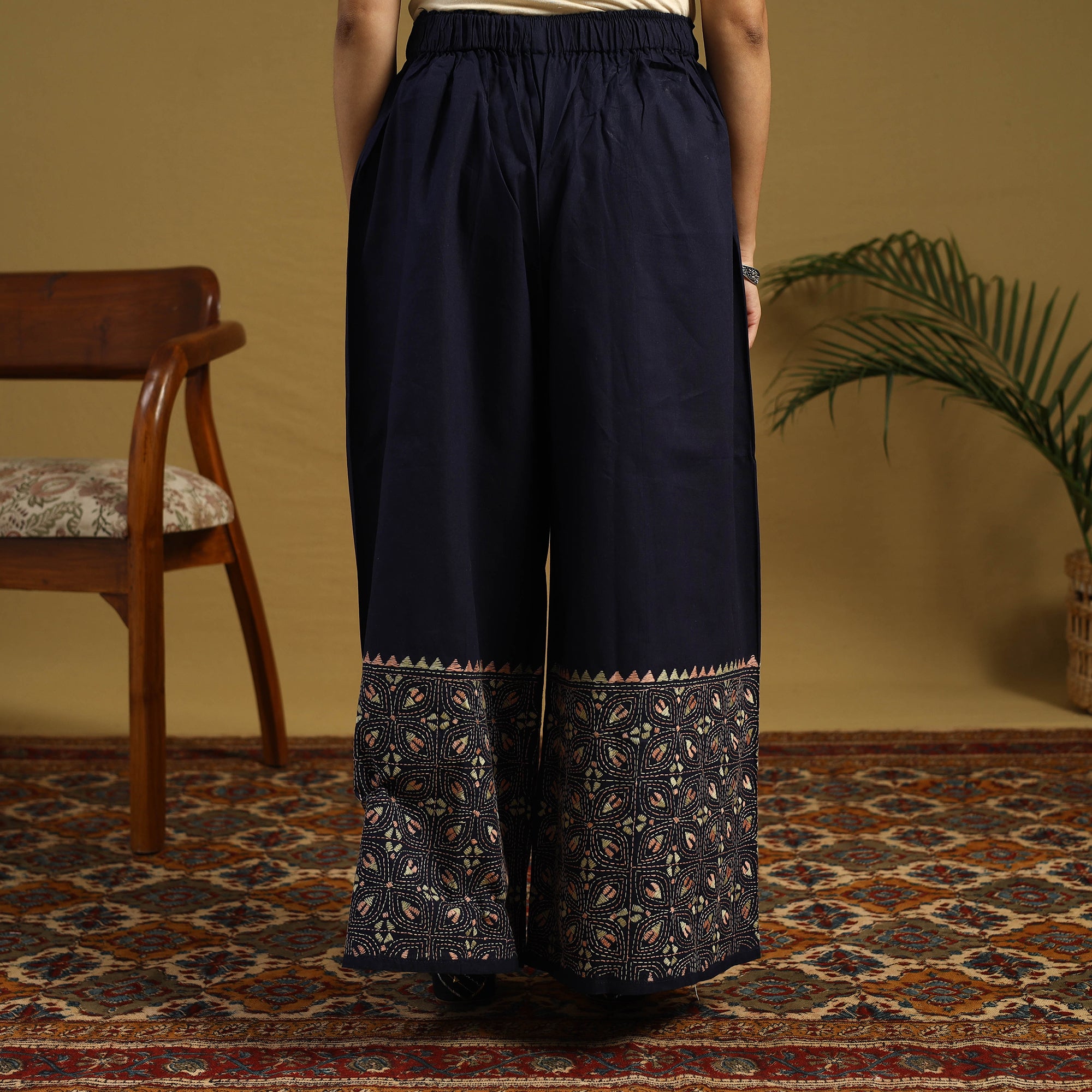 Infuse tradition into your wardrobe with this blue cotton palazzo featuring kantha embroidery from Bengal. The delicate hand-stitching on lightweight cotton creates a beautiful fusion of comfort and artistry. Its roomy wide-leg cut ensures day-long ease, ideal for relaxed outings, friendly gatherings, or weekend vibes.
