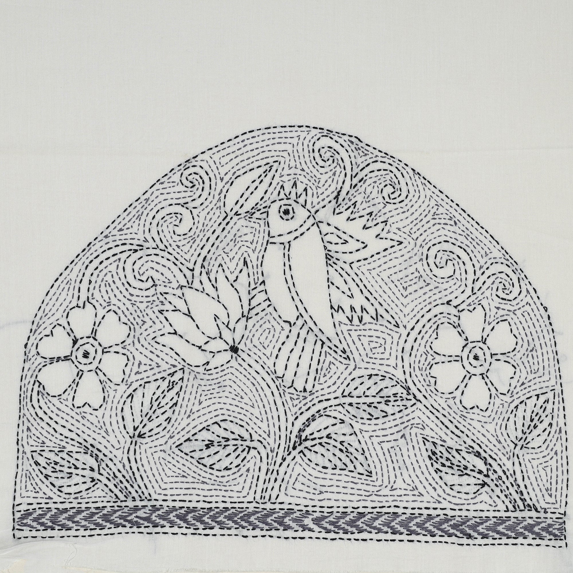 This white cotton bengal kantha stitch blouse piece showcases intricate hand embroidery inspired by the traditional kantha art of West Bengal. Each motif is carefully crafted by skilled artisans, turning it into a wearable piece of heritage. Style it your way with your favourite sarees to add a refined, handcrafted touch, perfect for both festive occasions and everyday elegance.