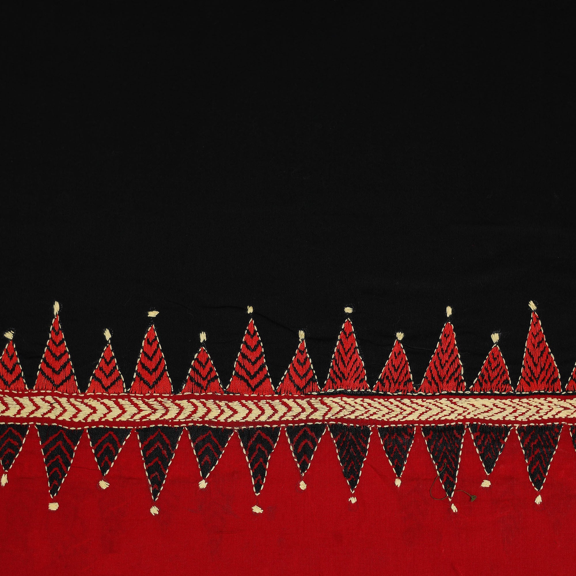 This black cotton bengal kantha stitch blouse piece showcases intricate hand embroidery inspired by the traditional kantha art of West Bengal. Each motif is carefully crafted by skilled artisans, turning it into a wearable piece of heritage. Style it your way with your favourite sarees to add a refined, handcrafted touch, perfect for both festive occasions and everyday elegance.