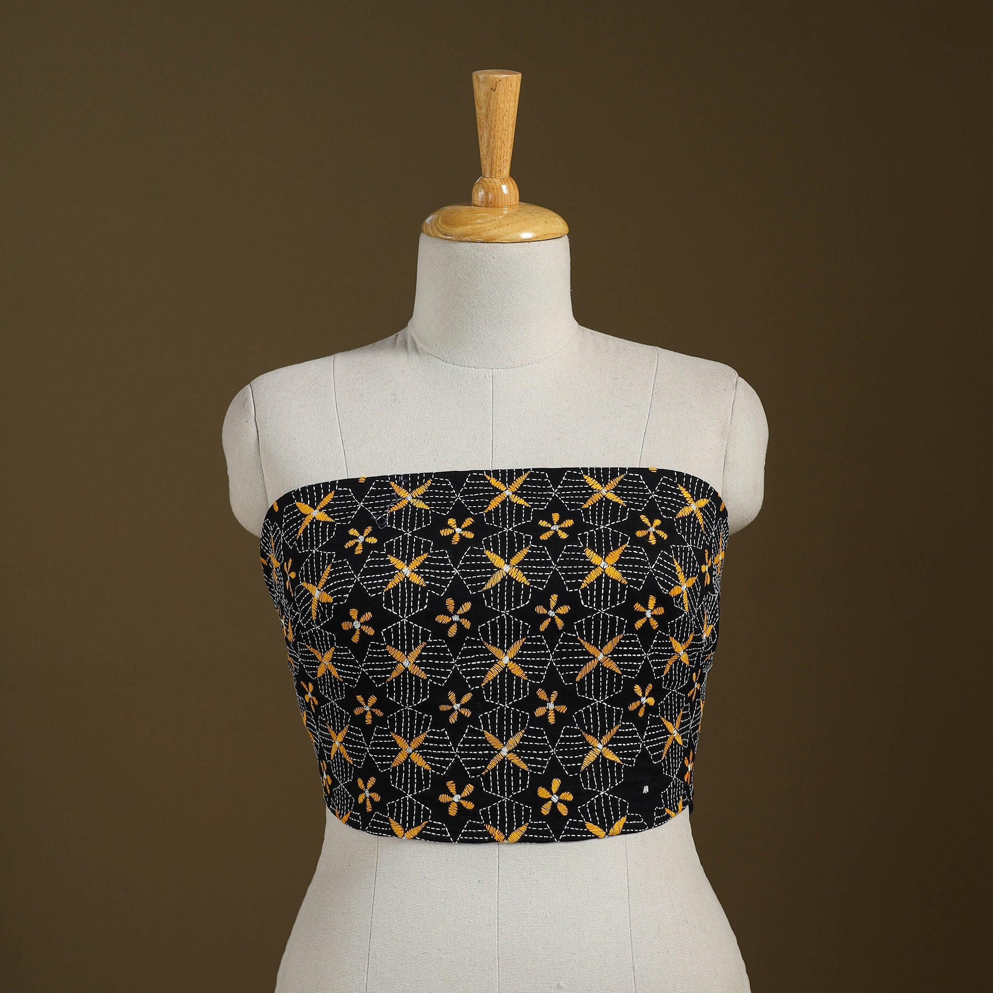 This black cotton bengal kantha stitch blouse piece showcases intricate hand embroidery inspired by the traditional kantha art of West Bengal. Each motif is carefully crafted by skilled artisans, turning it into a wearable piece of heritage. Style it your way with your favourite sarees to add a refined, handcrafted touch, perfect for both festive occasions and everyday elegance.