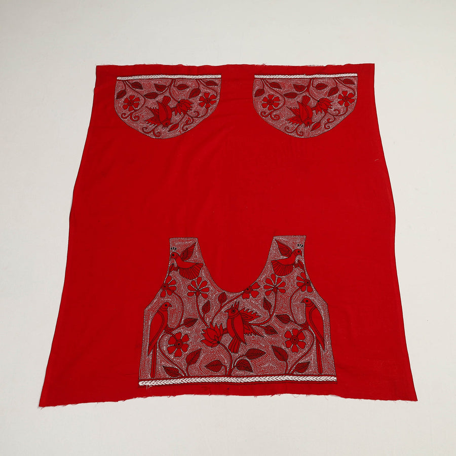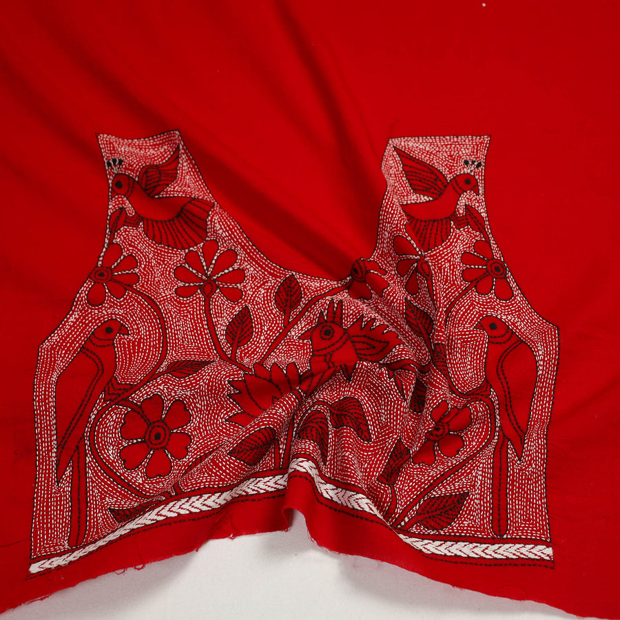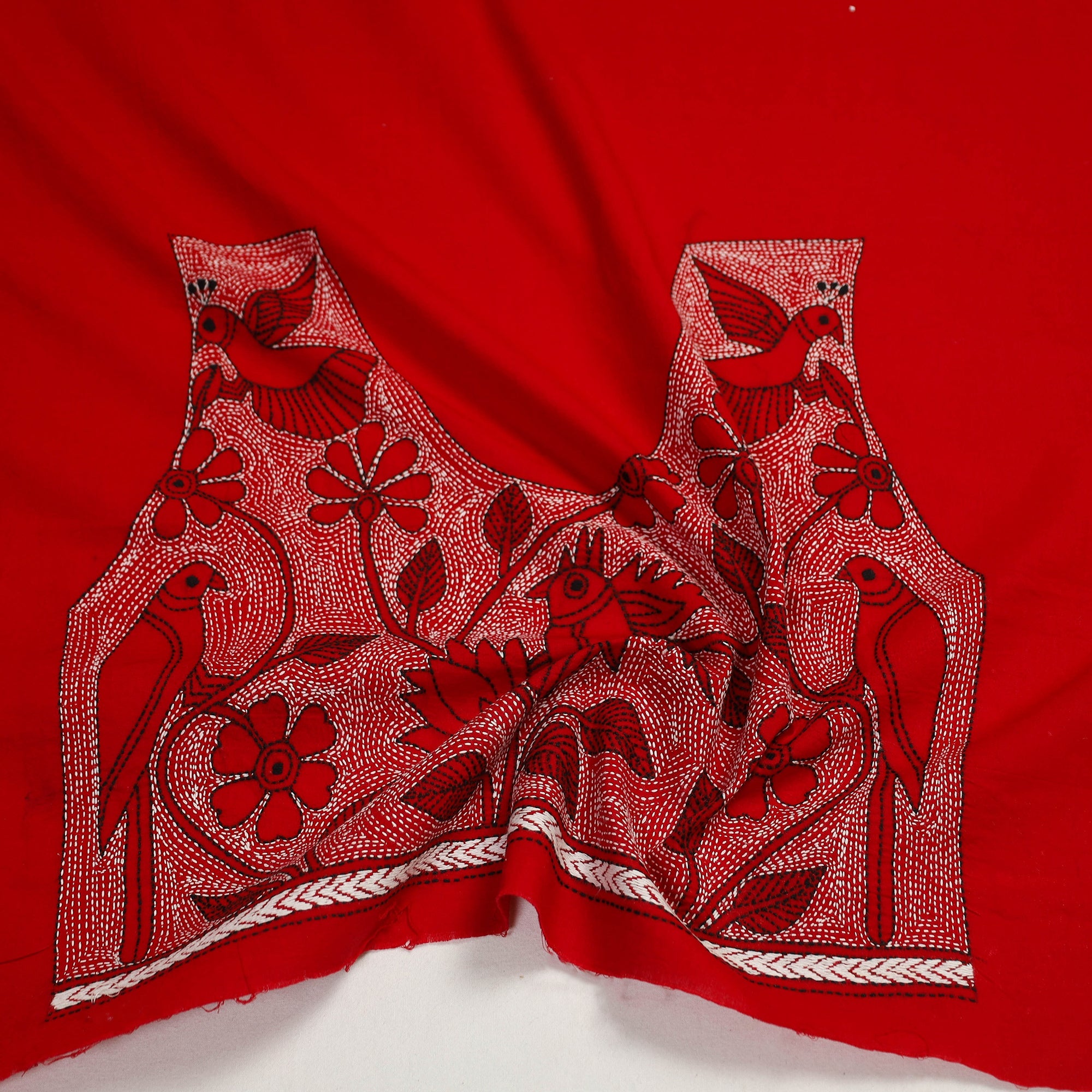 Cotton red bengal kantha work blouse piece, featuring intricate embroidery by skilled artisans of West Bengal. The fine cotton fabric is lightweight, breathable, adding cultural richness. A perfect blend of comfort and heritage, making it an elegant choice for sarees and ethnic wear.