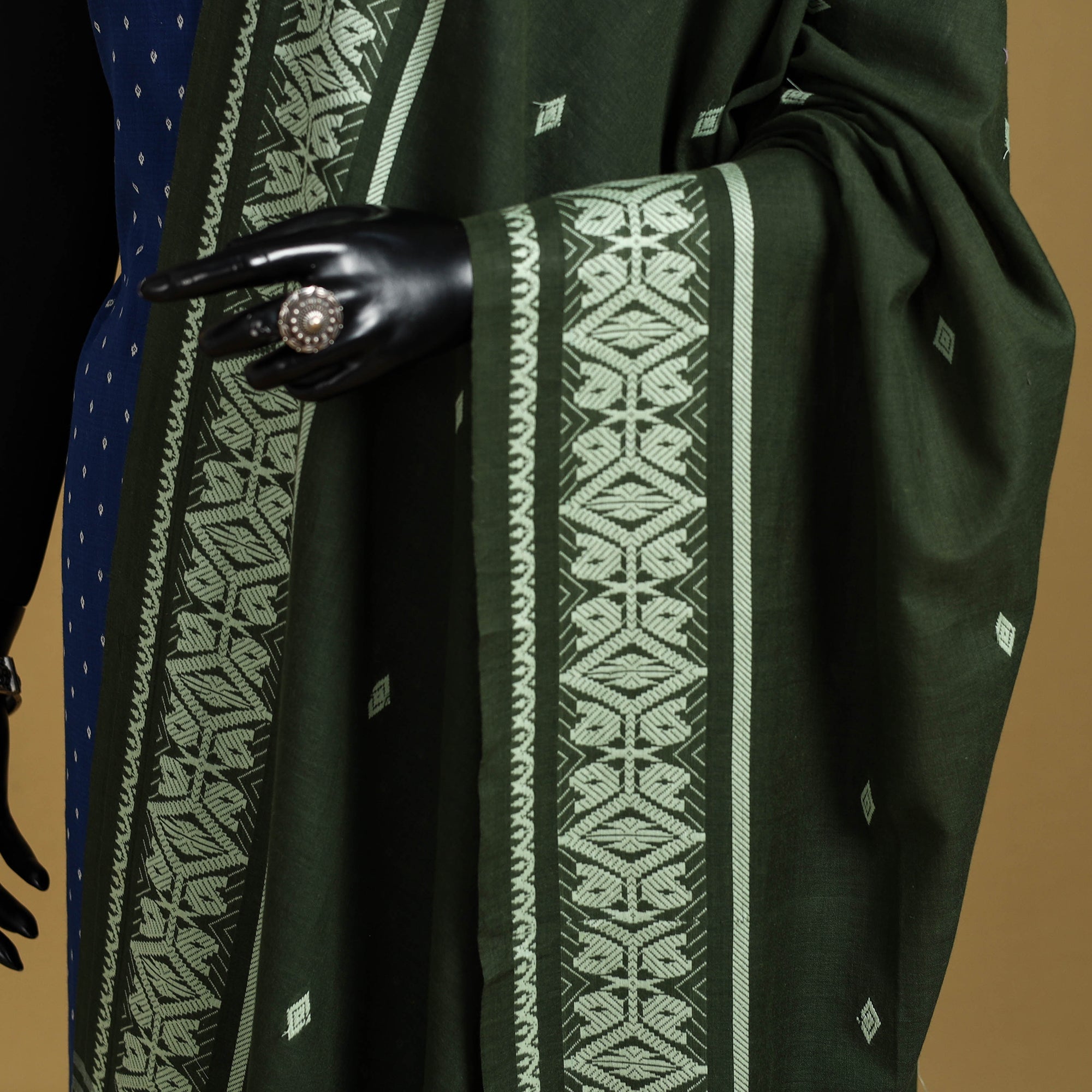 This green cotton jacquard dupatta with thread buti motifs beautifully blends tradition with everyday elegance. Woven on jacquard looms, the fabric displays intricate thread buti patterns across its surface, showcasing the finesse of this weaving technique. A finely detailed thread border enhances the design, adding subtle charm and durability. Lightweight yet graceful, this dupatta pairs effortlessly with both ethnic and contemporary outfits, making it a versatile addition to your wardrobe.