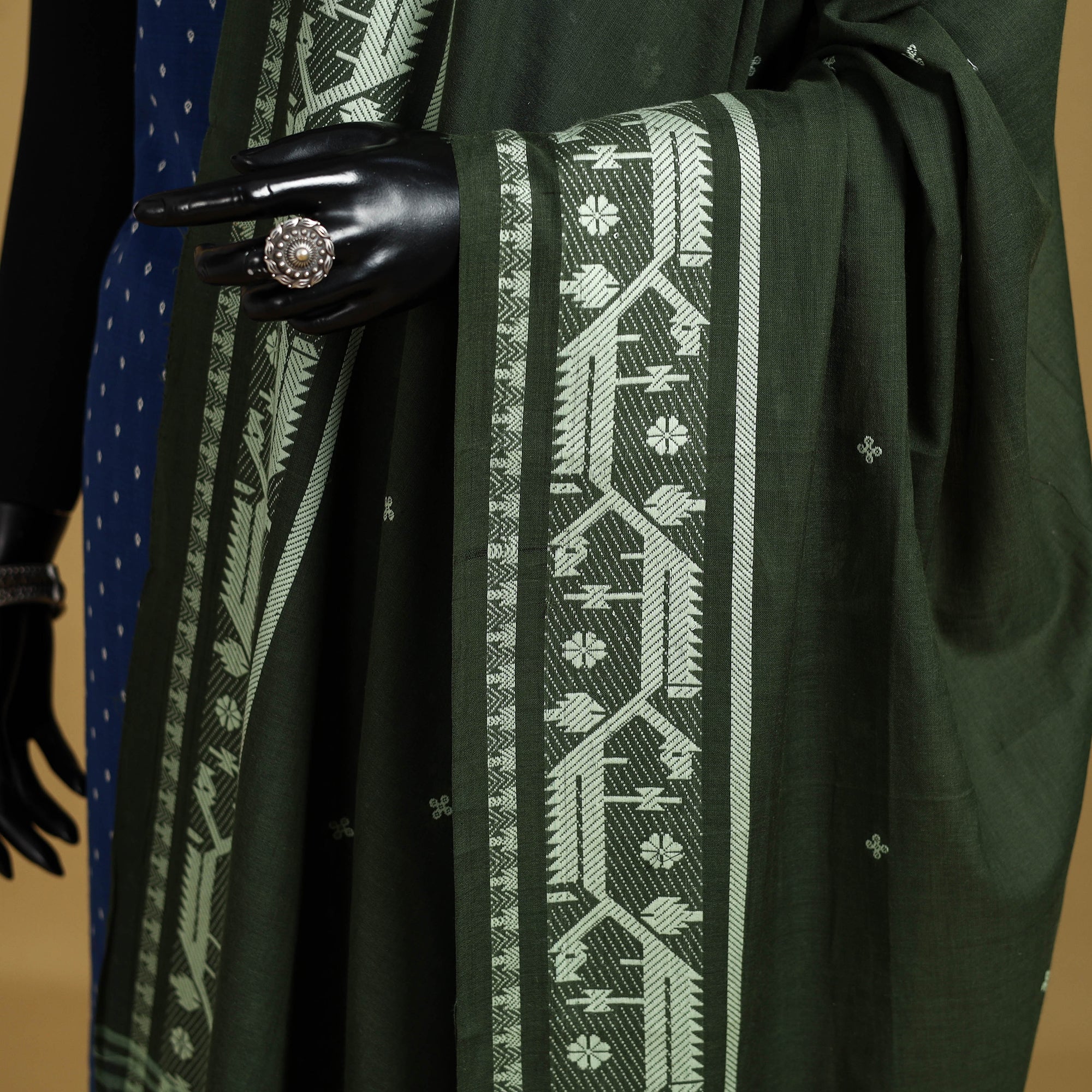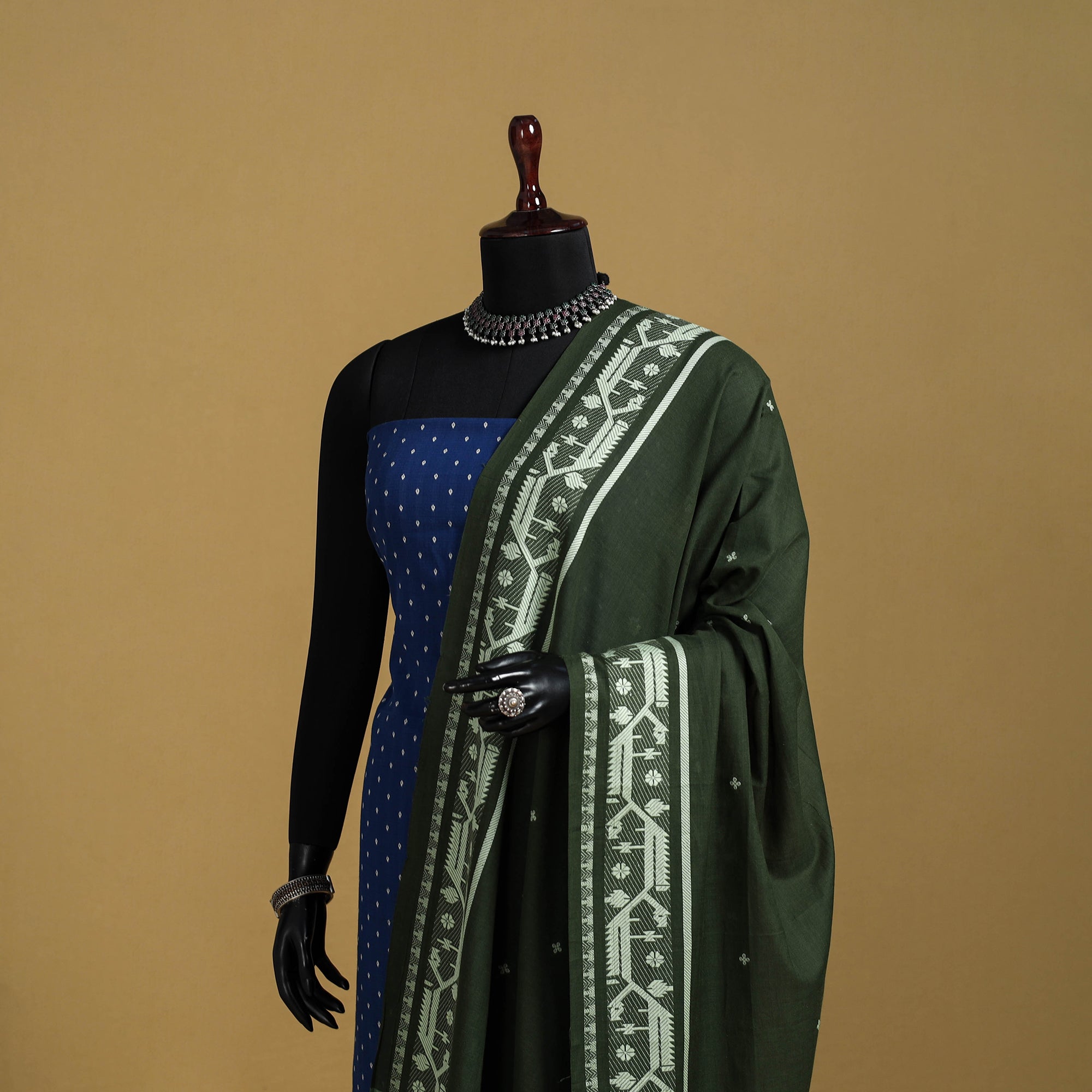 This green cotton jacquard dupatta with thread buti motifs beautifully blends tradition with everyday elegance. Woven on jacquard looms, the fabric displays intricate thread buti patterns across its surface, showcasing the finesse of this weaving technique. A finely detailed thread border enhances the design, adding subtle charm and durability. Lightweight yet graceful, this dupatta pairs effortlessly with both ethnic and contemporary outfits, making it a versatile addition to your wardrobe.