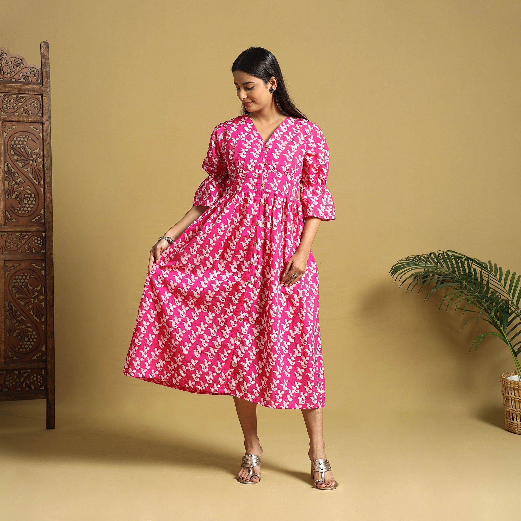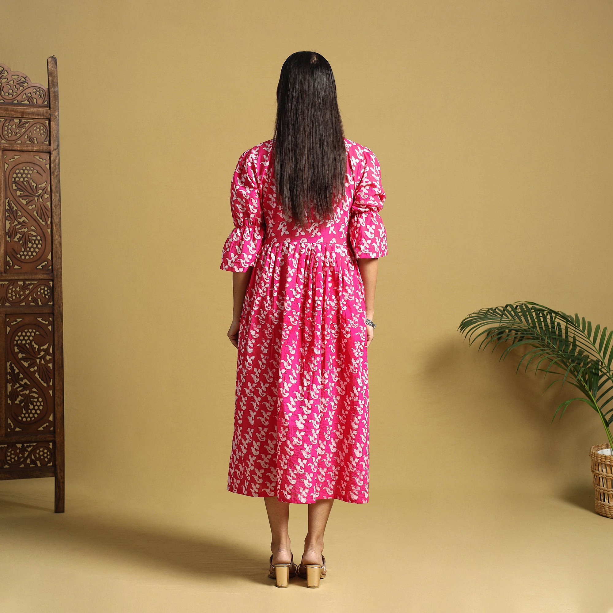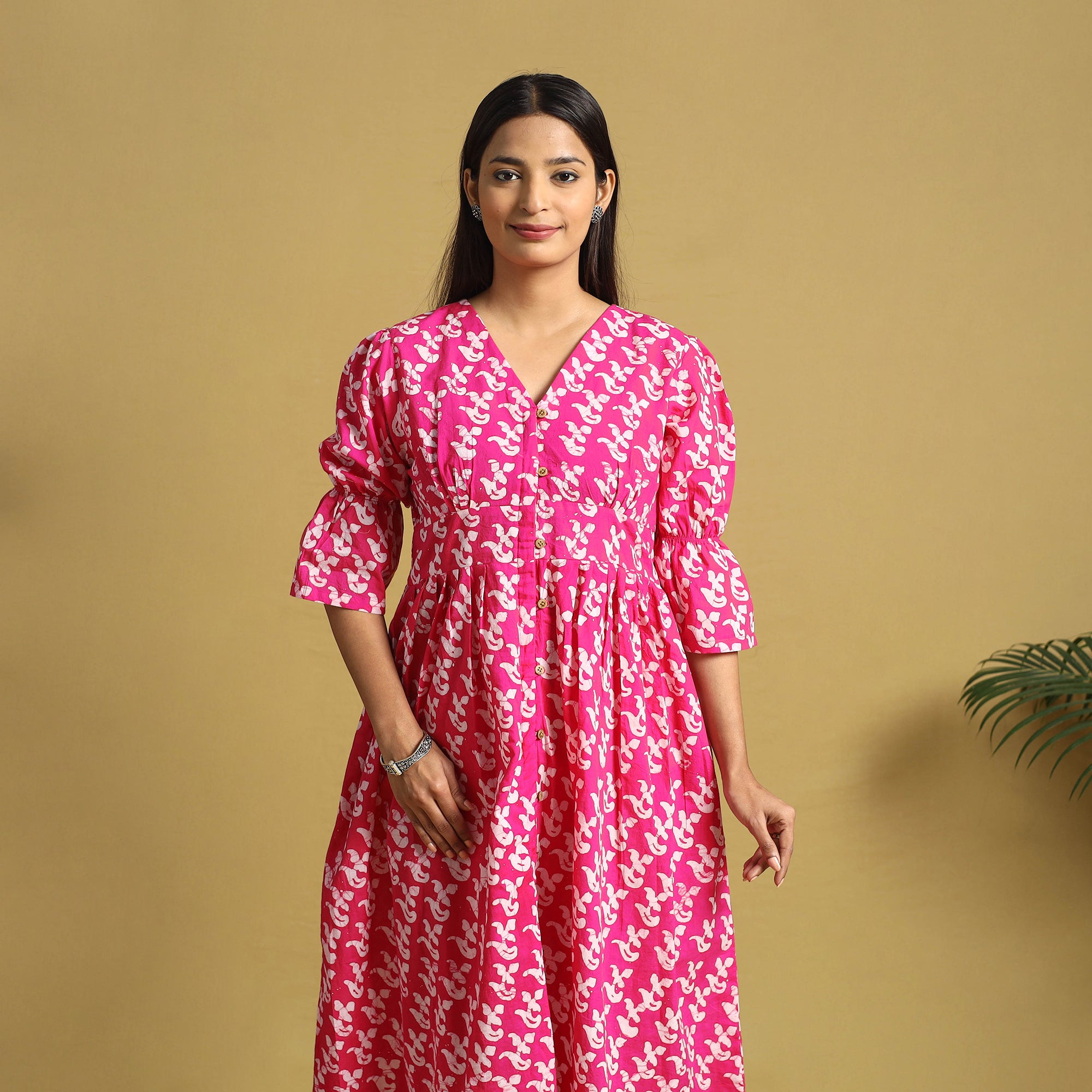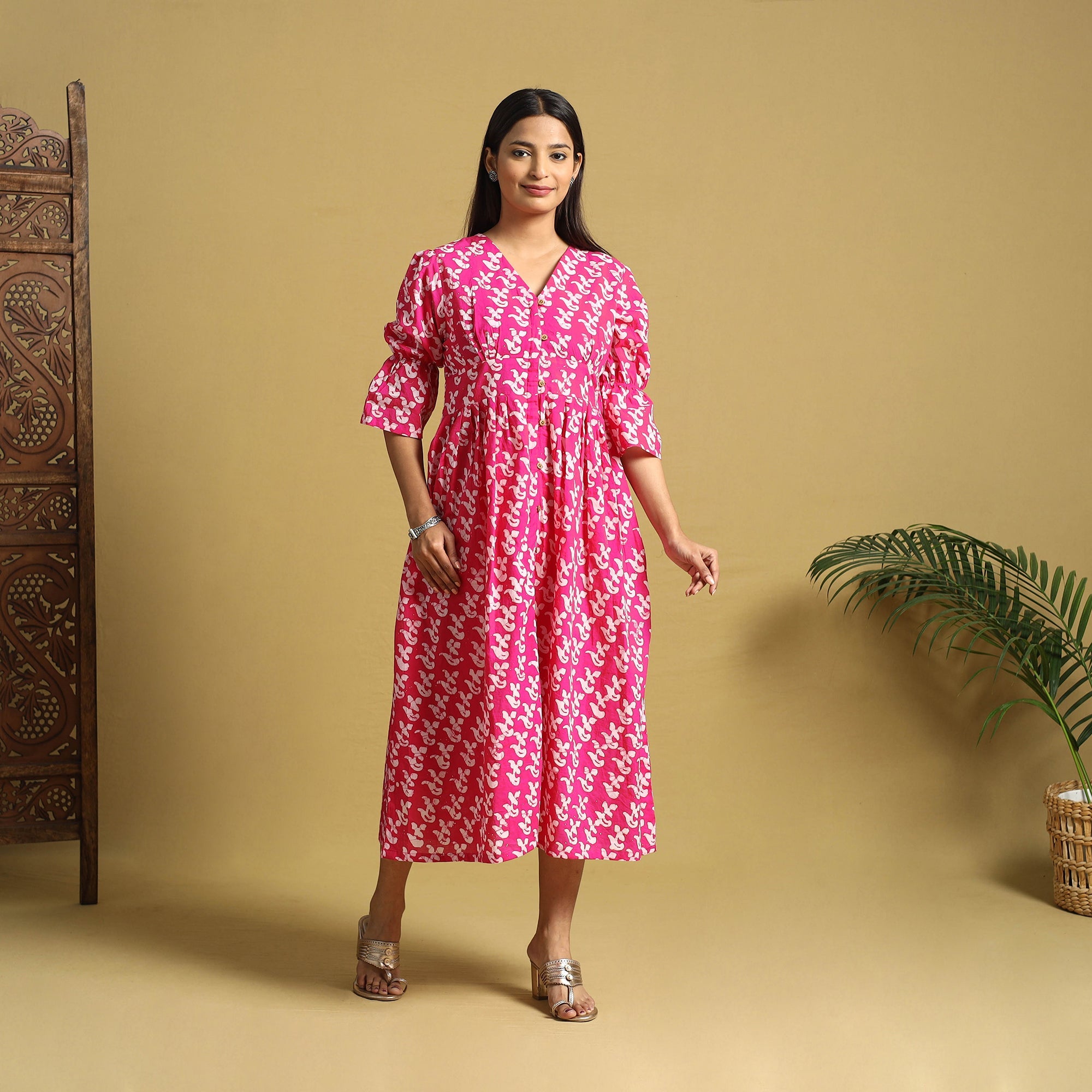 This pink cotton button-down dress features hand batik using a traditional resist-dye technique, creating vibrant and enduring patterns. The breathable fabric offers all-day comfort, while the front button closure makes it perfect for both casual outings and office wear. It can also be effortlessly styled for small get-togethers.