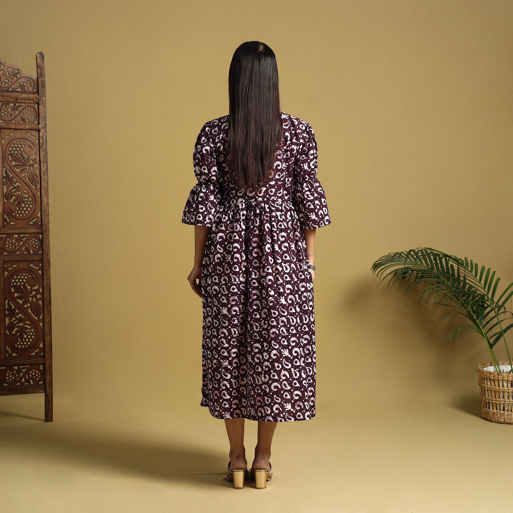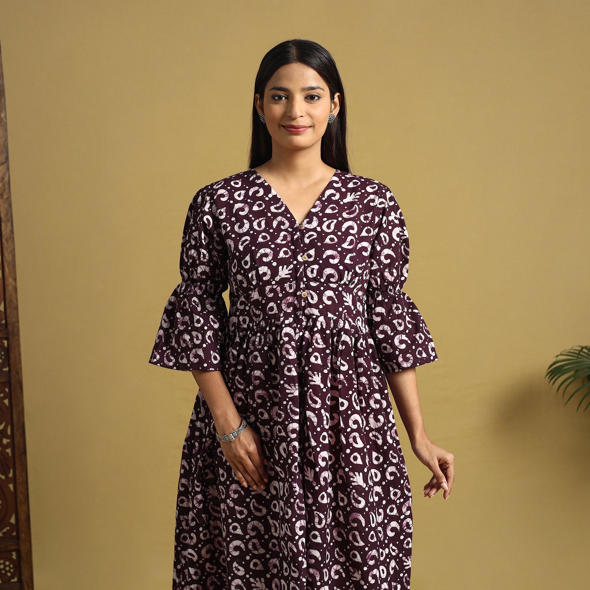This purple cotton button-down dress features hand batik using a traditional resist-dye technique, creating vibrant and enduring patterns. The breathable fabric offers all-day comfort, while the front button closure makes it perfect for both casual outings and office wear. It can also be effortlessly styled for small get-togethers.