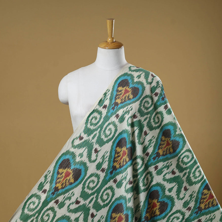 This green cotton central asian pochampally ikat fabric from Telangana shows a mix of tradition and beauty. Made with the central asian ikat technique, the threads are tied and dyed before weaving to create colorful and unique patterns. Soft and beautifully patterned, this fabric is perfect for making sarees, kurtas, or home decor items, adding a touch of charm and culture to any project.