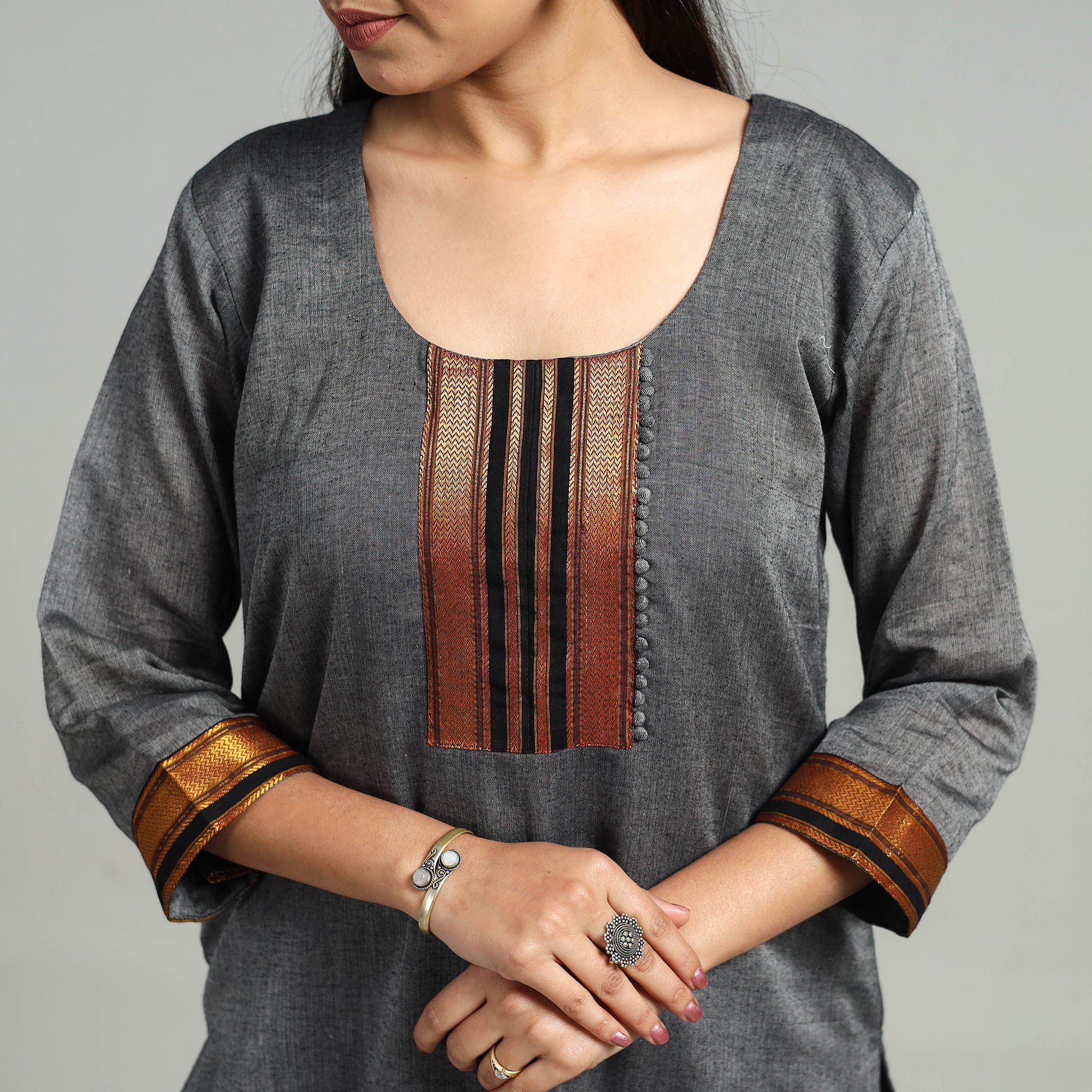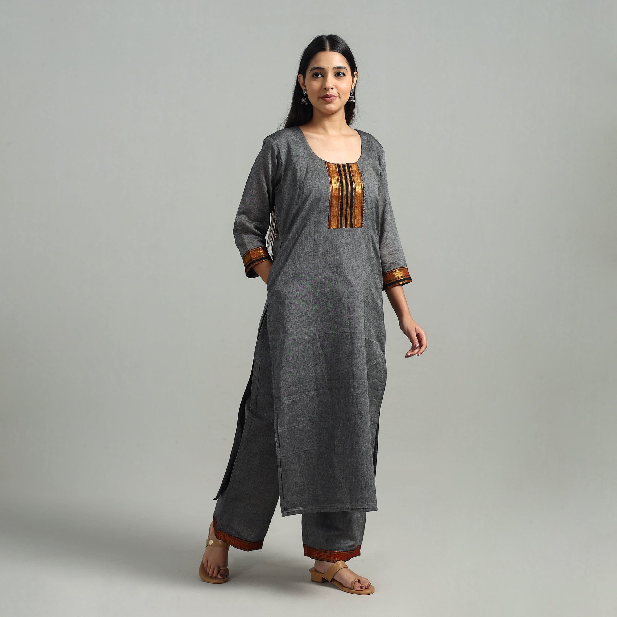 Step into timeless style with this cotton grey dharwad kurta set with palazzo & dupatta, a blend of tradition and modern design. This handcrafted set includes a comfortable long kurta, elasticized palazzo with pockets, and a dupatta adorned with a beautiful border. Perfect for casual outings or festive events, this set brings elegance, comfort, and sustainability together effortlessly.