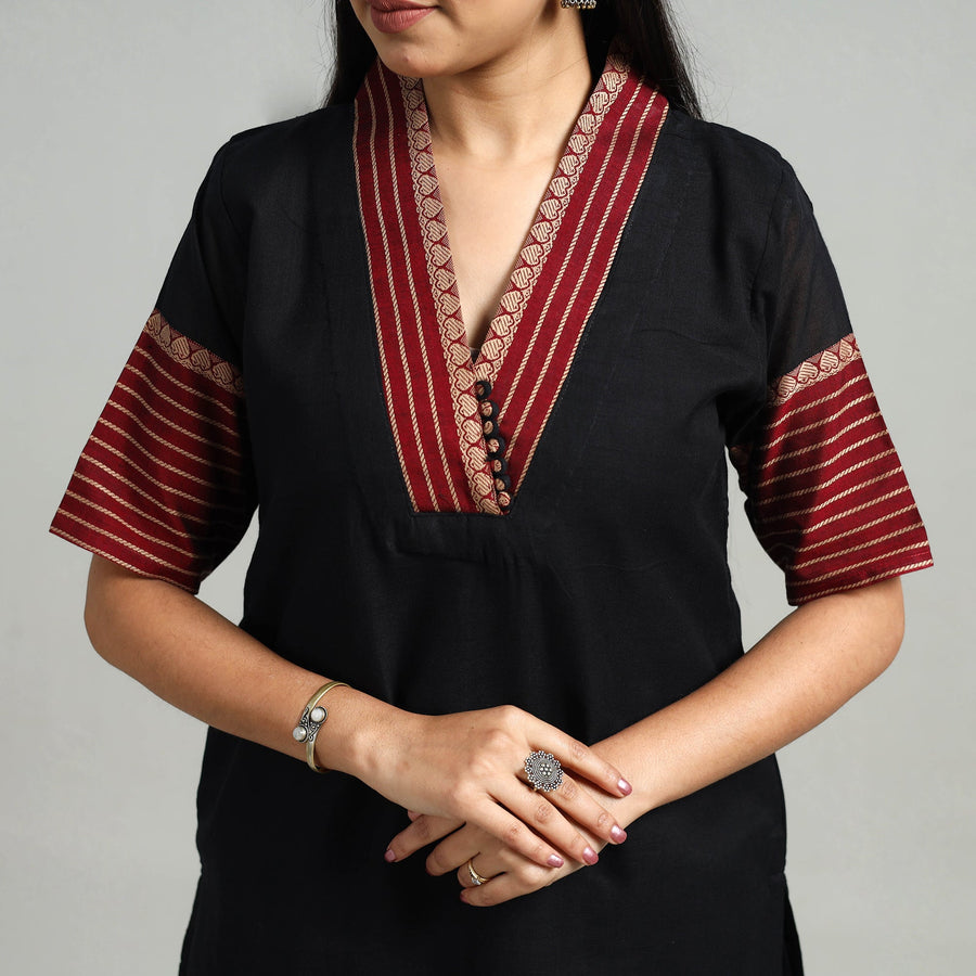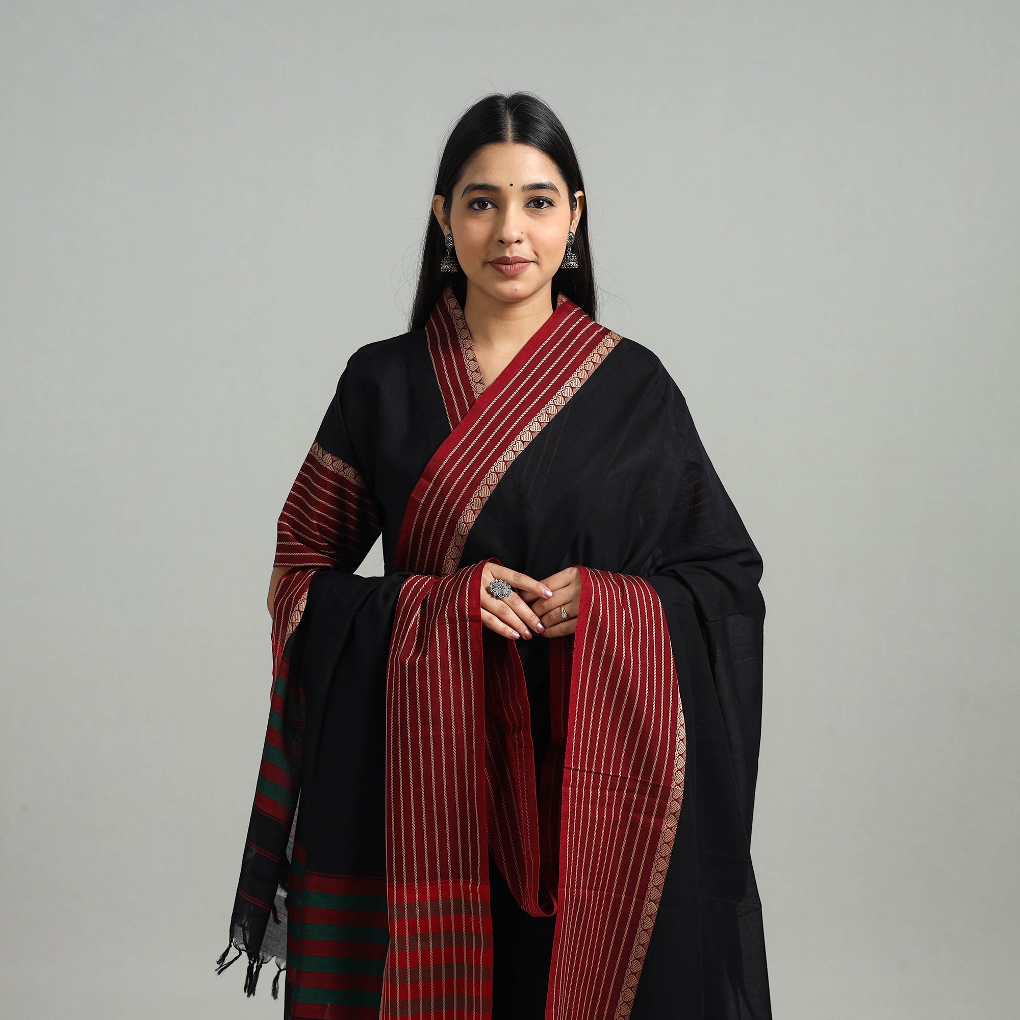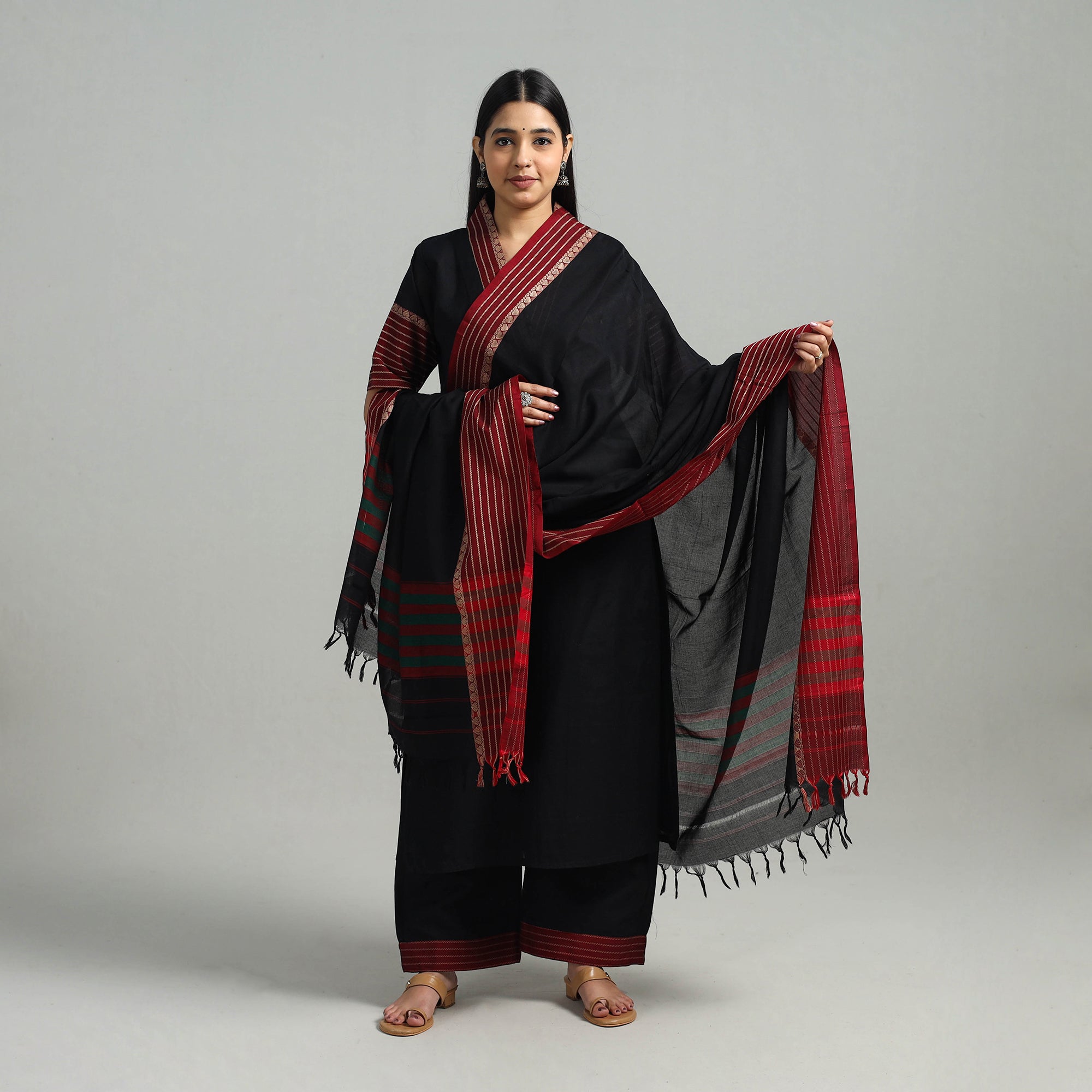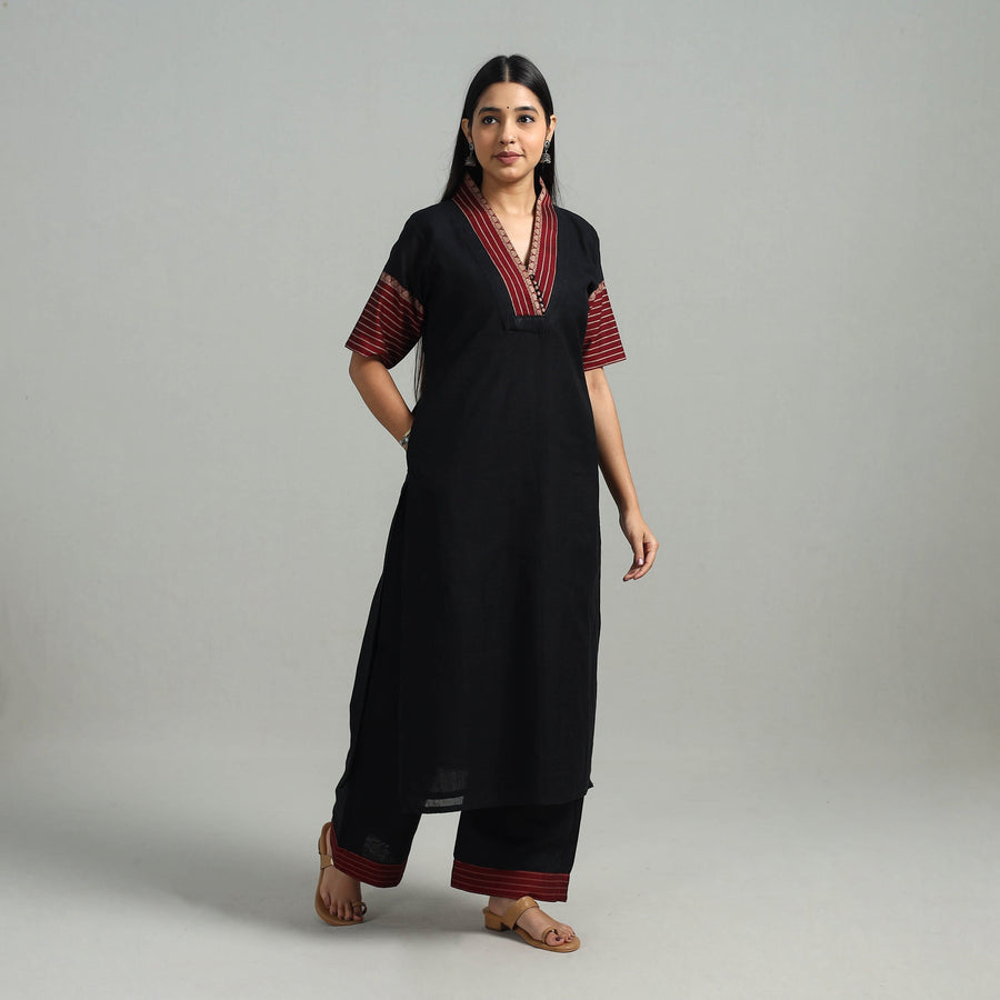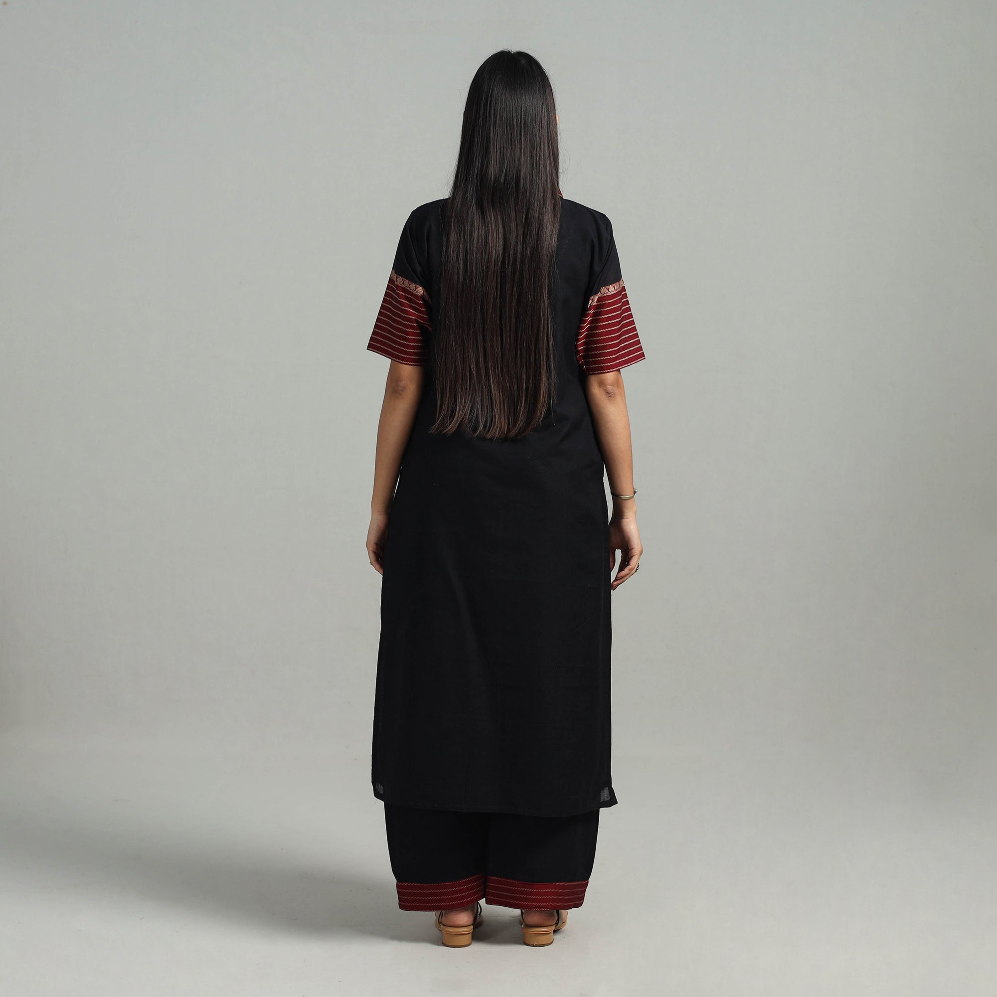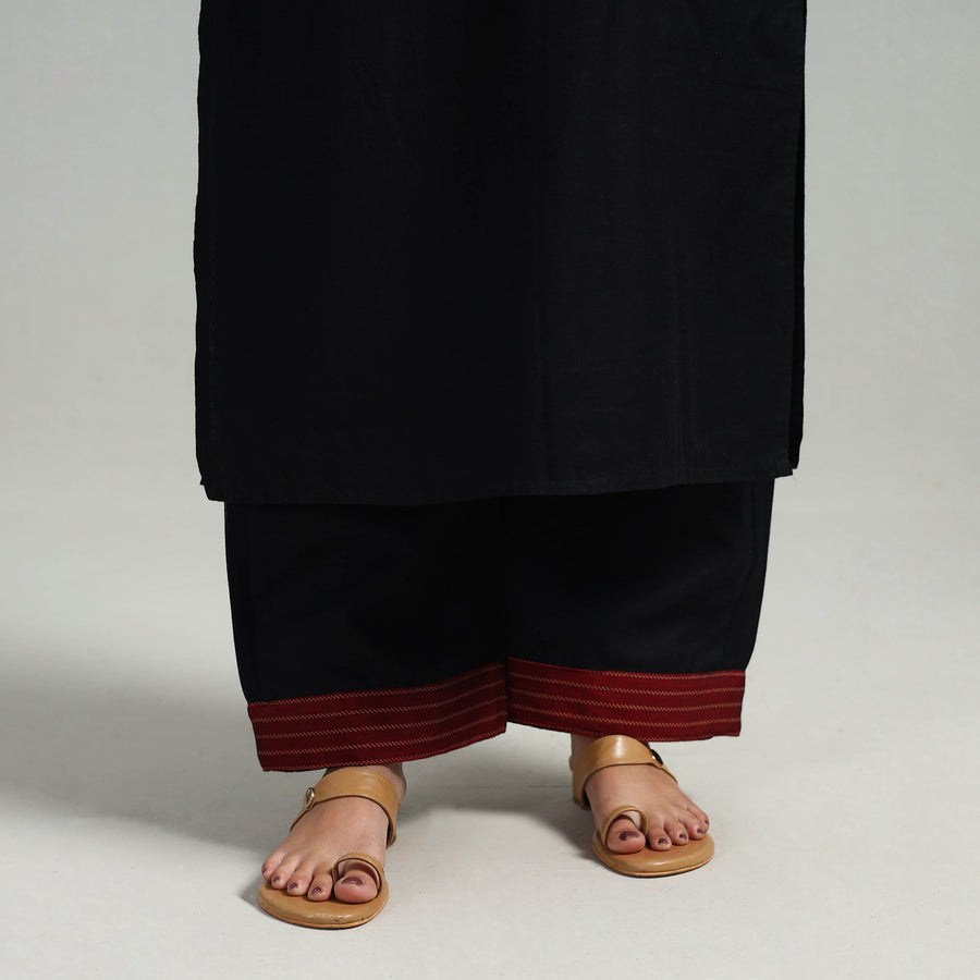 Step into timeless style with this black cotton dharwad kurta set with palazzo & dupatta, a blend of tradition and modern design. This handcrafted set includes a comfortable long kurta, elasticized palazzo with pockets, and a dupatta adorned with a beautiful border. Perfect for casual outings or festive events, this set brings elegance, comfort, and sustainability together effortlessly.