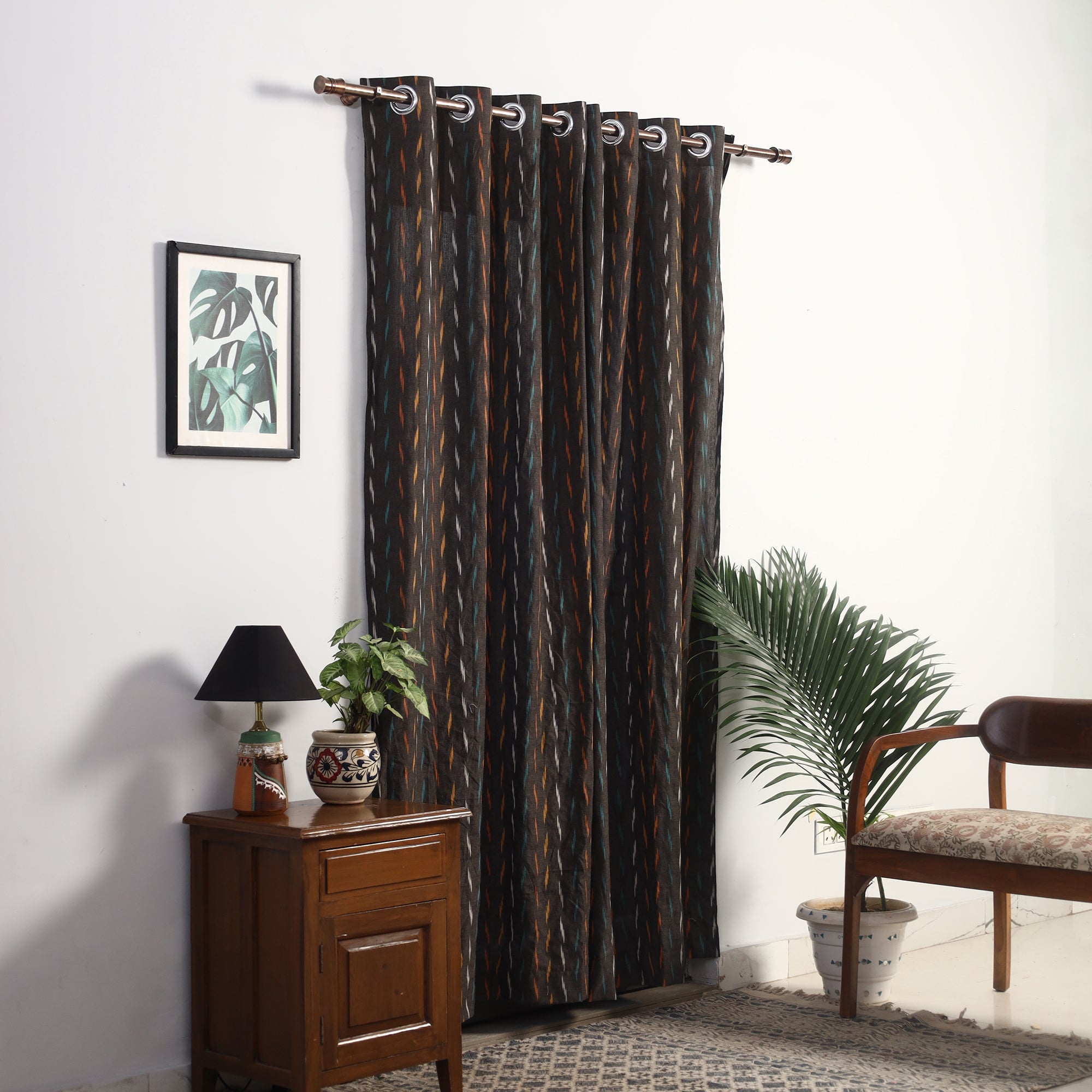 Let your home tell a story with this brown pochampally Ikat cotton door curtain. Each thread speaks of heritage, woven using a resist dyeing technique that brings geometric patterns to life. Light enough to sway with the breeze, yet textured enough to make a statement it's a subtle nod to Indian craftsmanship, fitting effortlessly into both classic and contemporary spaces.