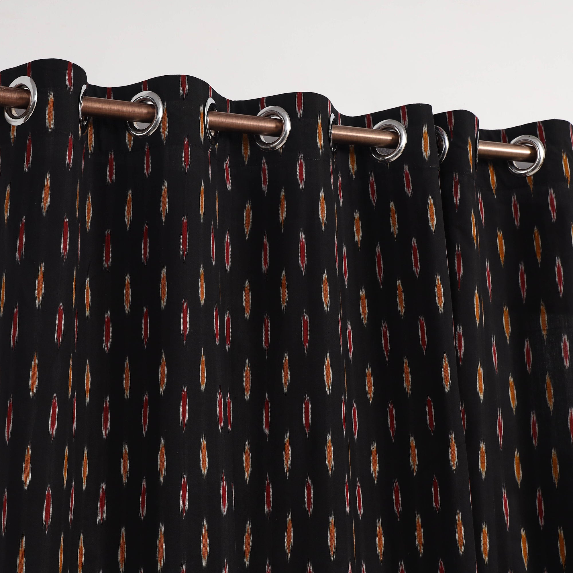 This black pochampally ikat woven cotton door curtain adds an ethnic touch to any room, making it a perfect addition to your home decor collection. Originating from Telangana, the Ikat craft is renowned for its vibrant geometric patterns. Before weaving, the threads are carefully dyed to create these intricate designs. Indian Ikat is a fabric admired by fashion designers worldwide for its artistry and elegance.