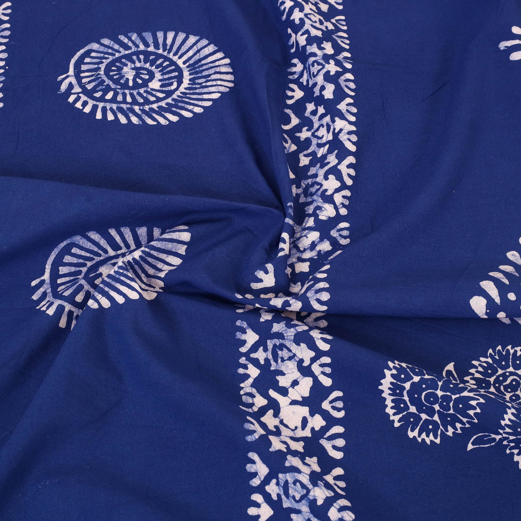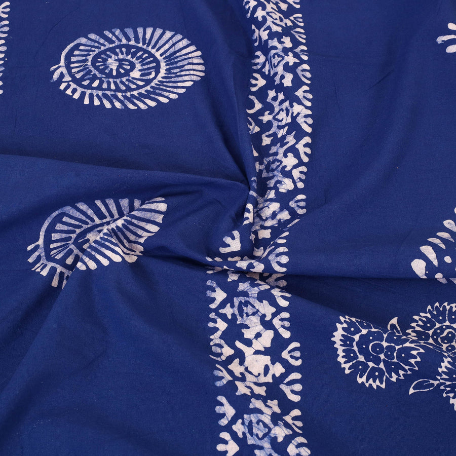 Fine-quality cotton double hand batik print blue bed sheet set with matching pillow covers from Ujjain, Madhya Pradesh. Batik is a technique of wax-resist dyeing applied to whole cloth, or cloth made using this technique. This batik cotton bed sheet ensures comfort while adding a touch of cultural elegance to your decor.