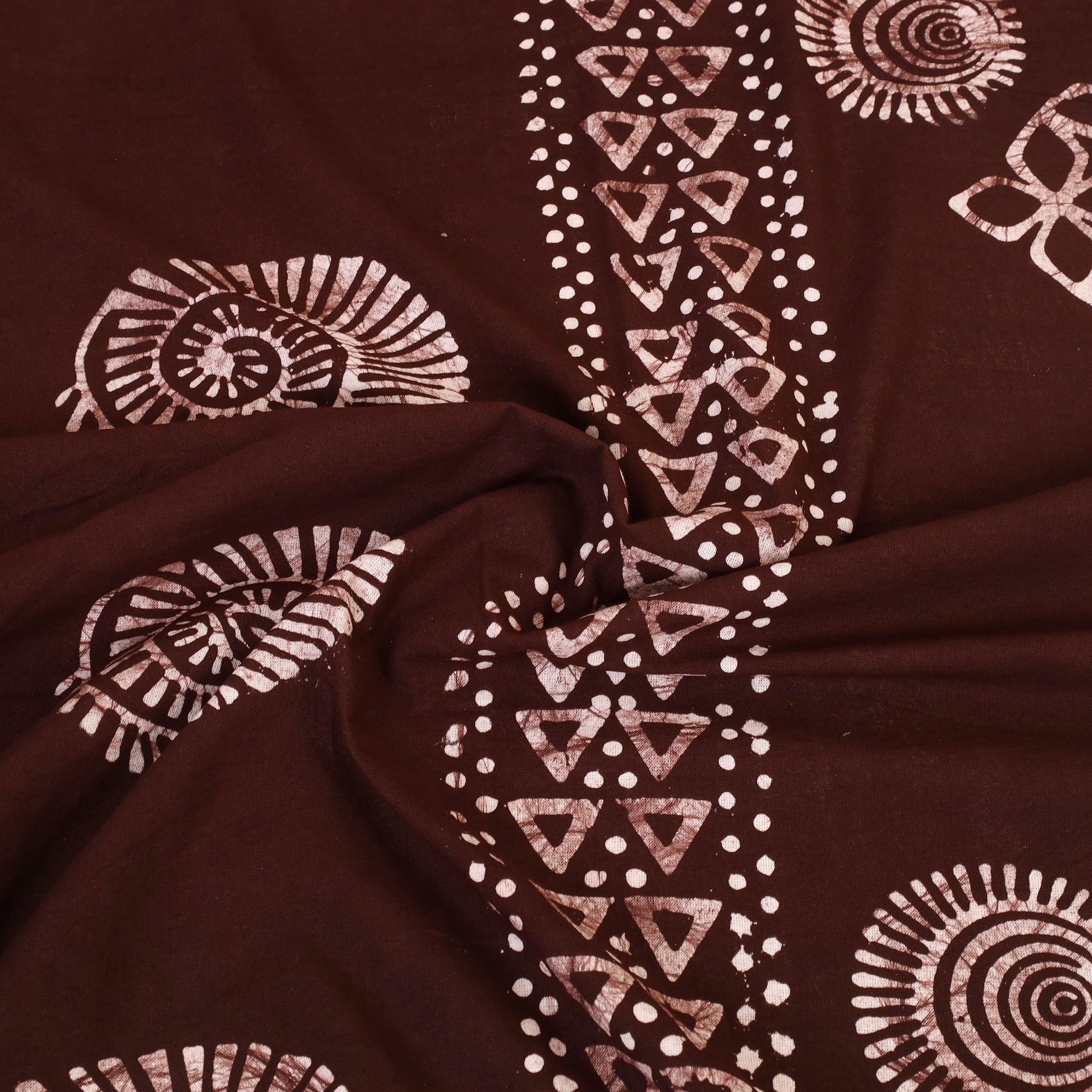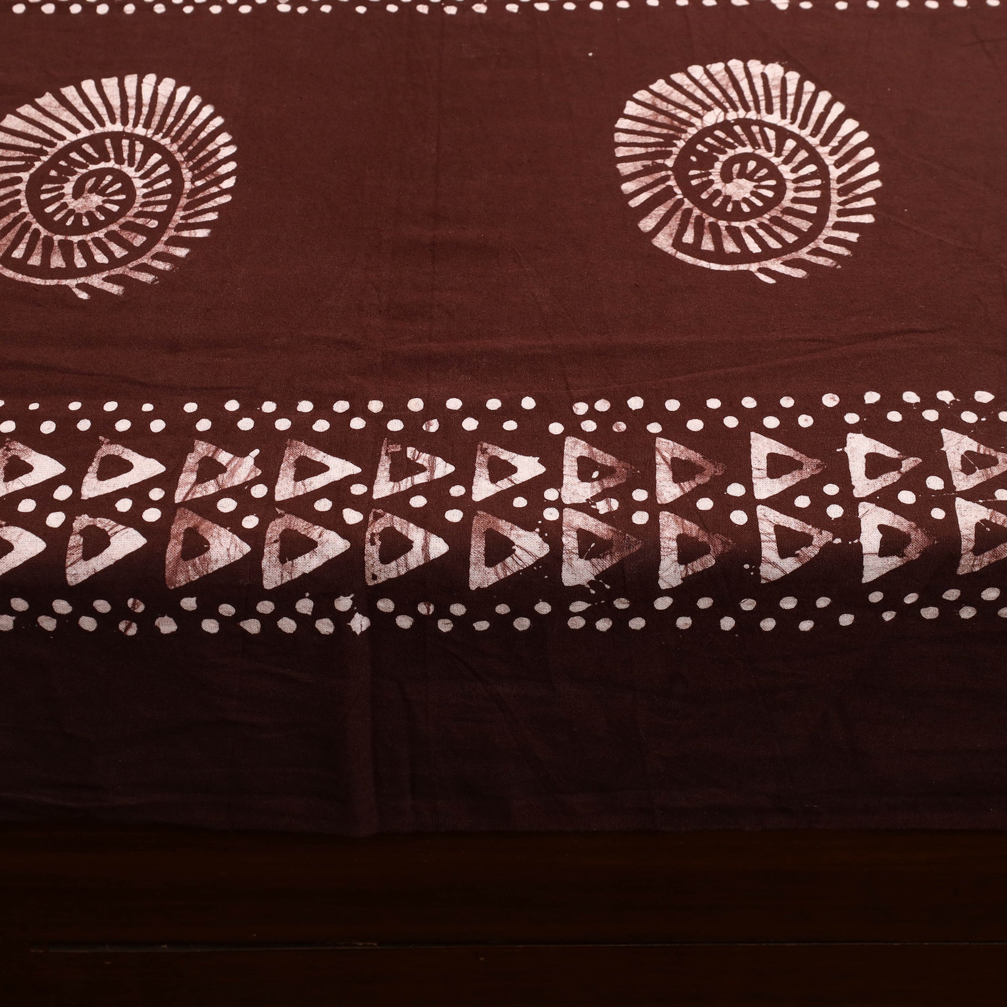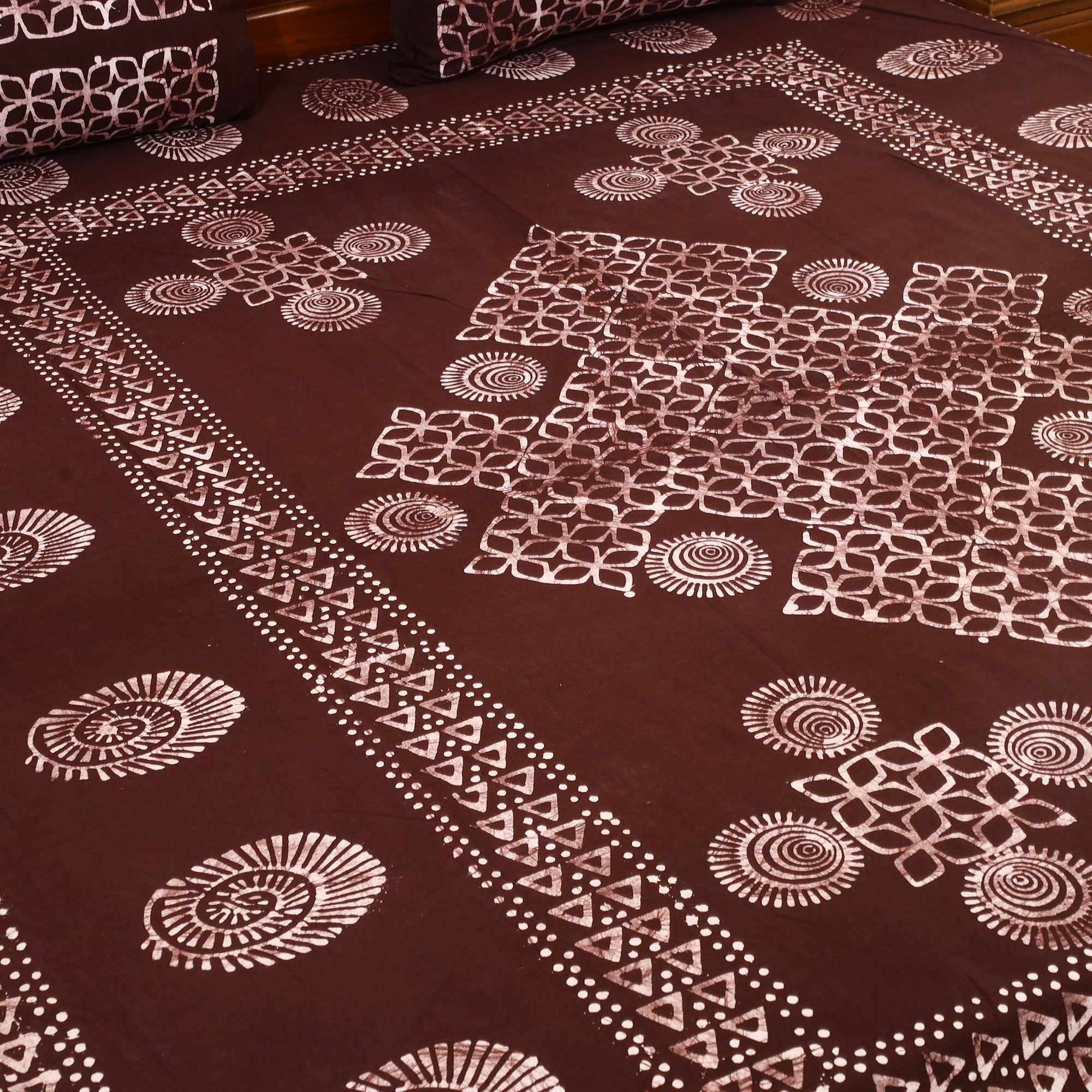 Fine-quality cotton double hand batik print brown bed sheet set with matching pillow covers from Ujjain, Madhya Pradesh. Batik is a technique of wax-resist dyeing applied to whole cloth, or cloth made using this technique. This batik cotton bed sheet ensures comfort while adding a touch of cultural elegance to your decor.