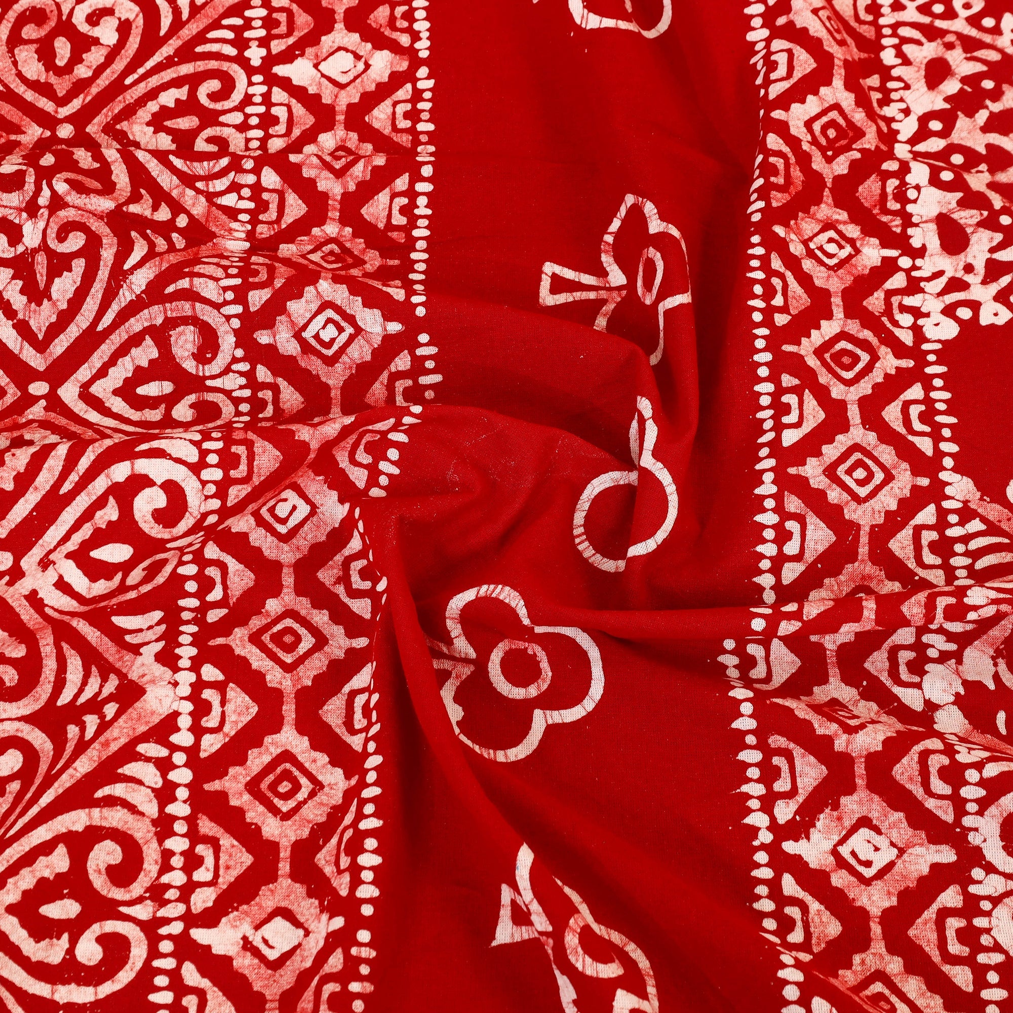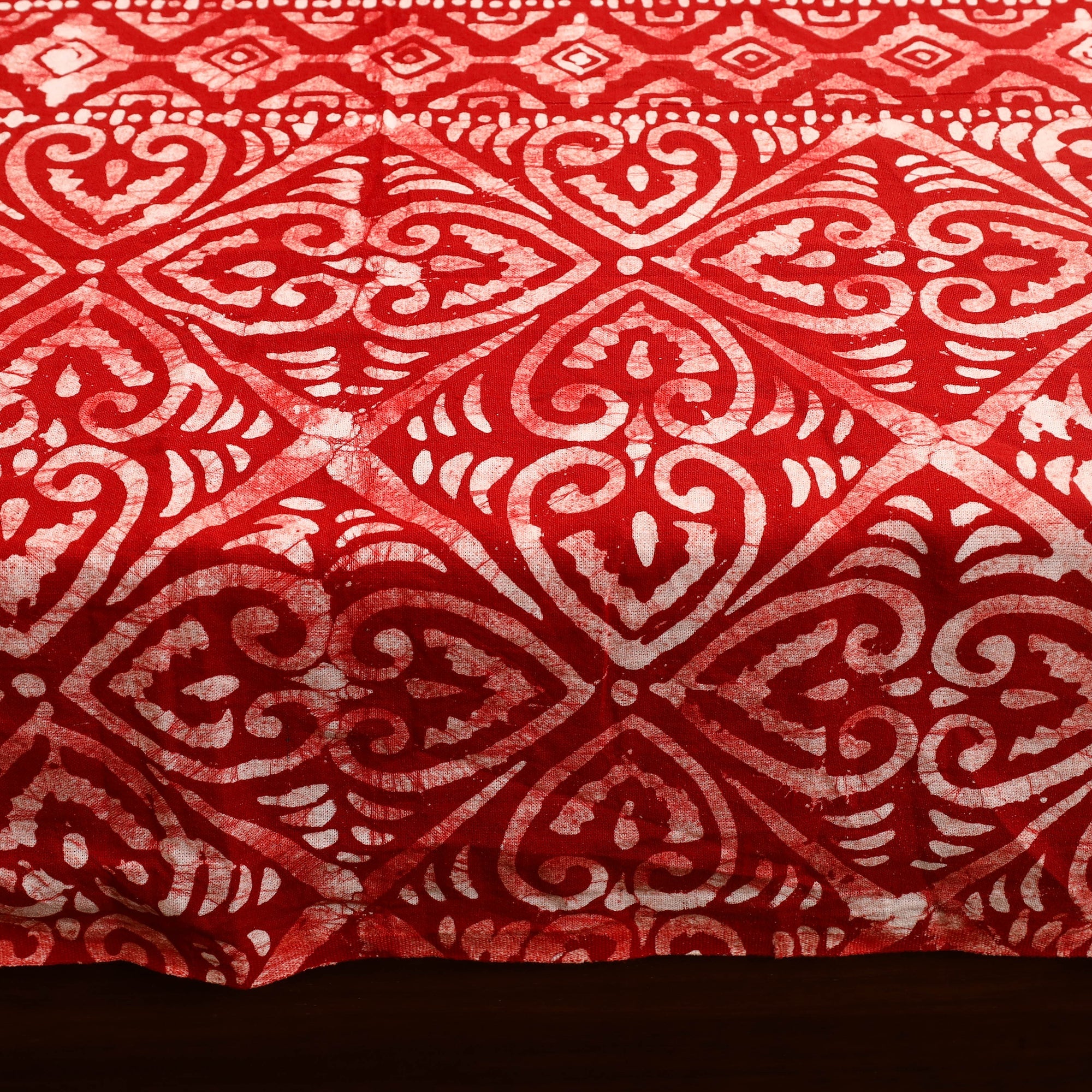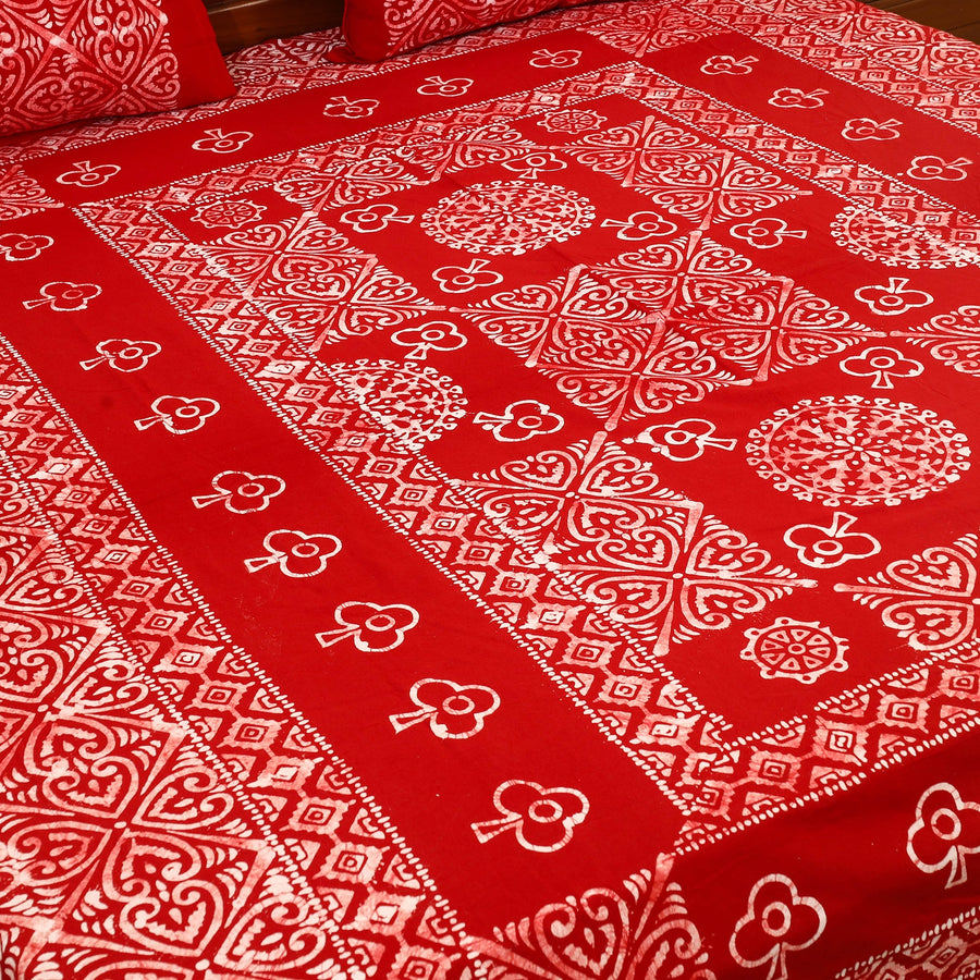 Fine-quality cotton double hand batik print red bed sheet set with matching pillow covers from Ujjain, Madhya Pradesh. Batik is a technique of wax-resist dyeing applied to whole cloth, or cloth made using this technique. This batik cotton bed sheet ensures comfort while adding a touch of cultural elegance to your decor.