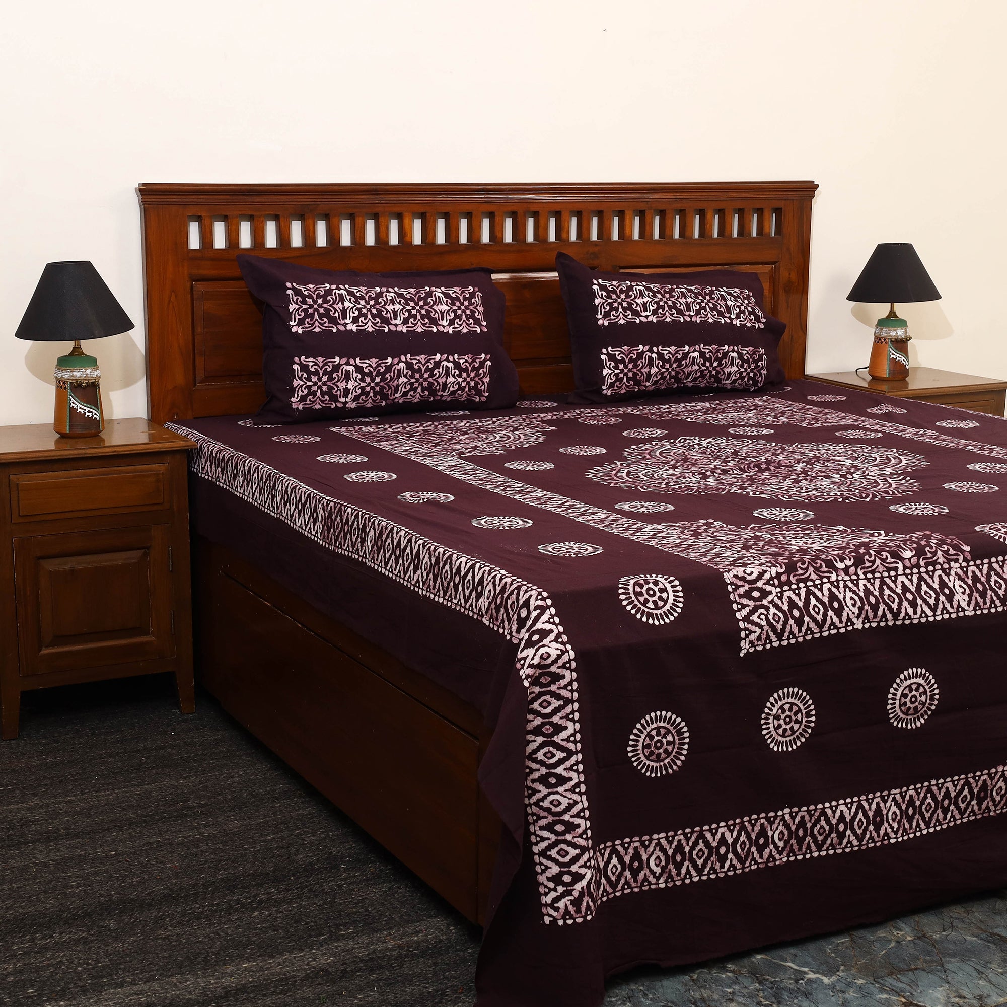 Fine-quality cotton double hand batik print brown bed sheet set with matching pillow covers from Ujjain, Madhya Pradesh. Batik is a technique of wax-resist dyeing applied to whole cloth, or cloth made using this technique. This batik cotton bed sheet ensures comfort while adding a touch of cultural elegance to your decor.