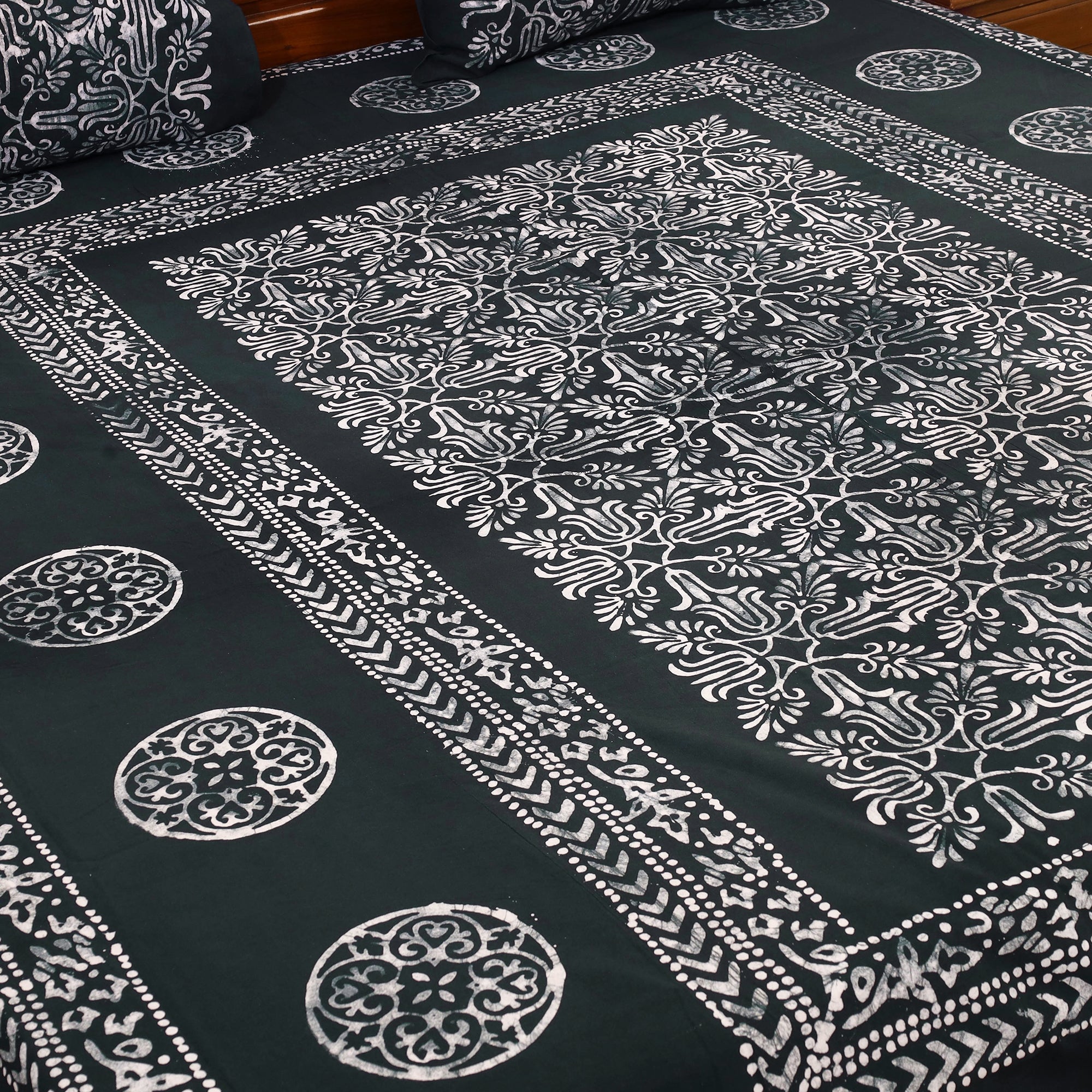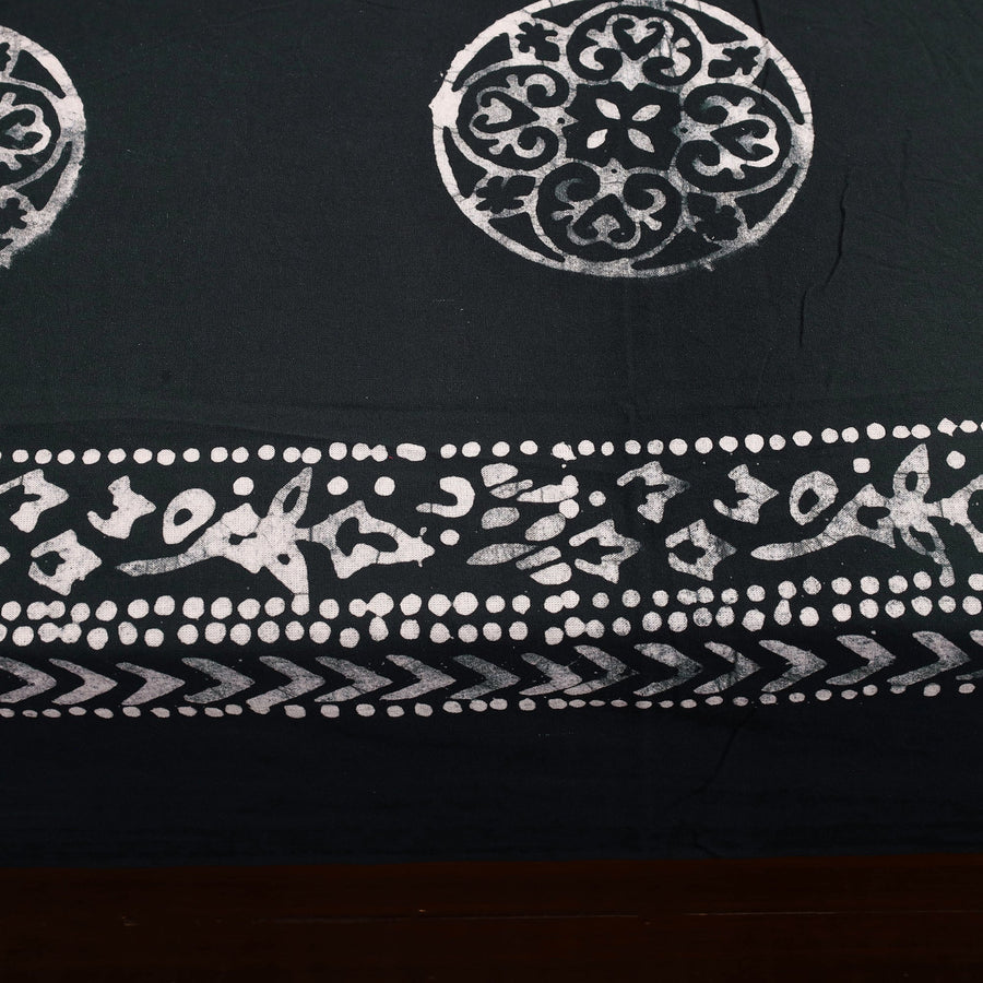 Fine-quality cotton double hand batik print black bed sheet set with matching pillow covers from Ujjain, Madhya Pradesh. Batik is a technique of wax-resist dyeing applied to whole cloth, or cloth made using this technique. This batik cotton bed sheet ensures comfort while adding a touch of cultural elegance to your decor.