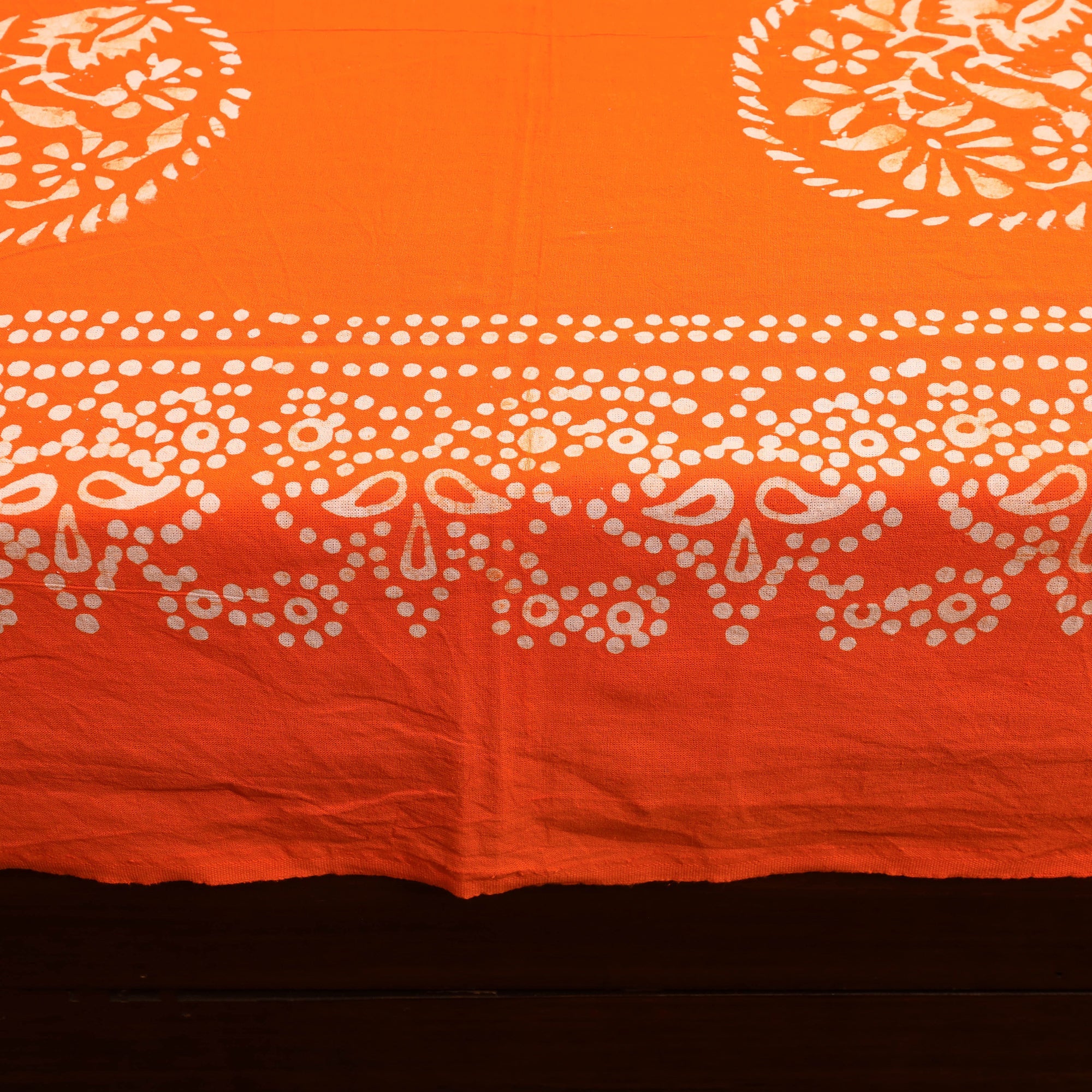 Fine-quality cotton double hand batik print orange bed sheet set with matching pillow covers from Ujjain, Madhya Pradesh. Batik is a technique of wax-resist dyeing applied to whole cloth, or cloth made using this technique. This batik cotton bed sheet ensures comfort while adding a touch of cultural elegance to your decor.