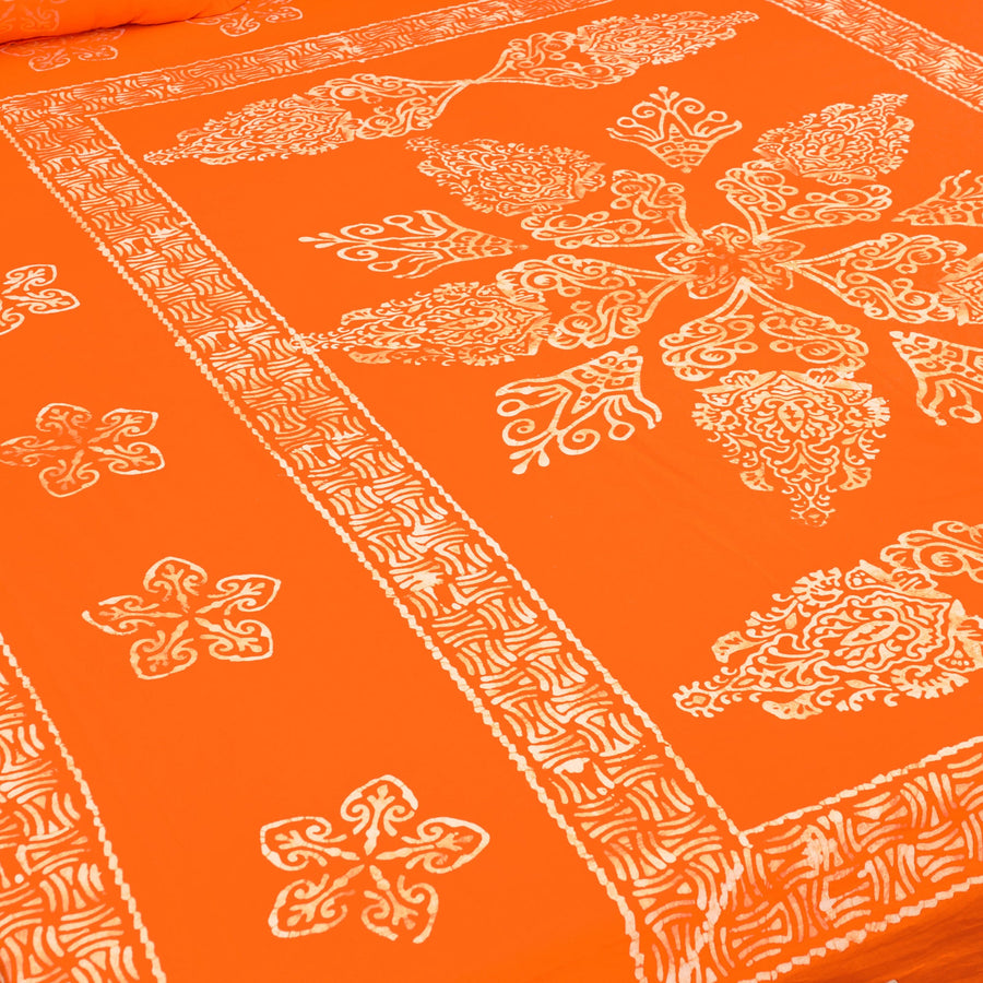 Fine-quality cotton double hand batik print orange bed sheet set with matching pillow covers from Ujjain, Madhya Pradesh. Batik is a technique of wax-resist dyeing applied to whole cloth, or cloth made using this technique. This batik cotton bed sheet ensures comfort while adding a touch of cultural elegance to your decor.
