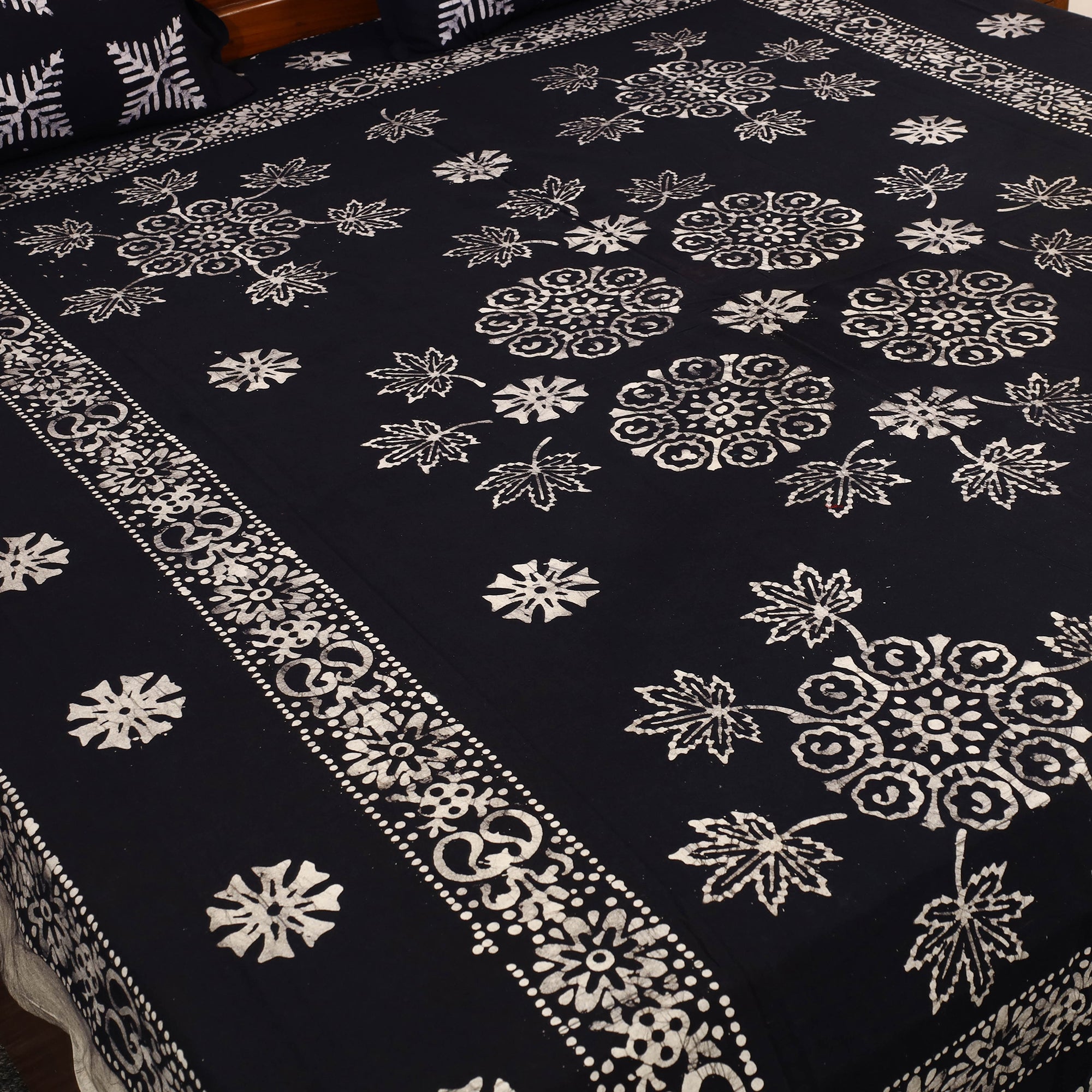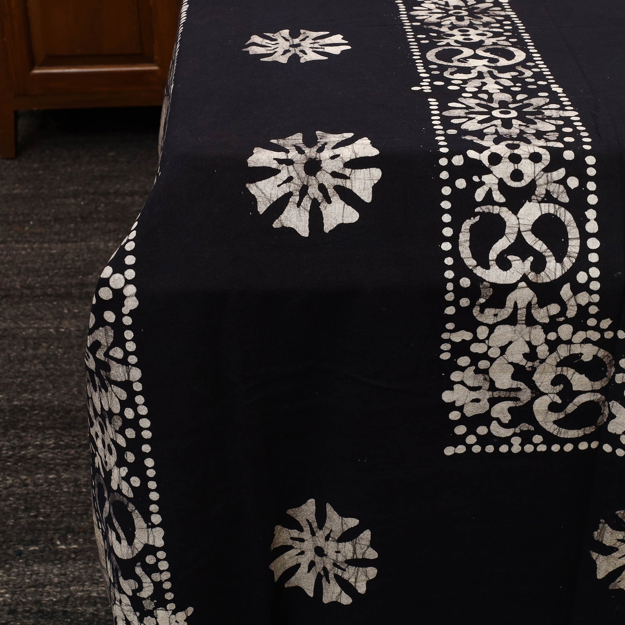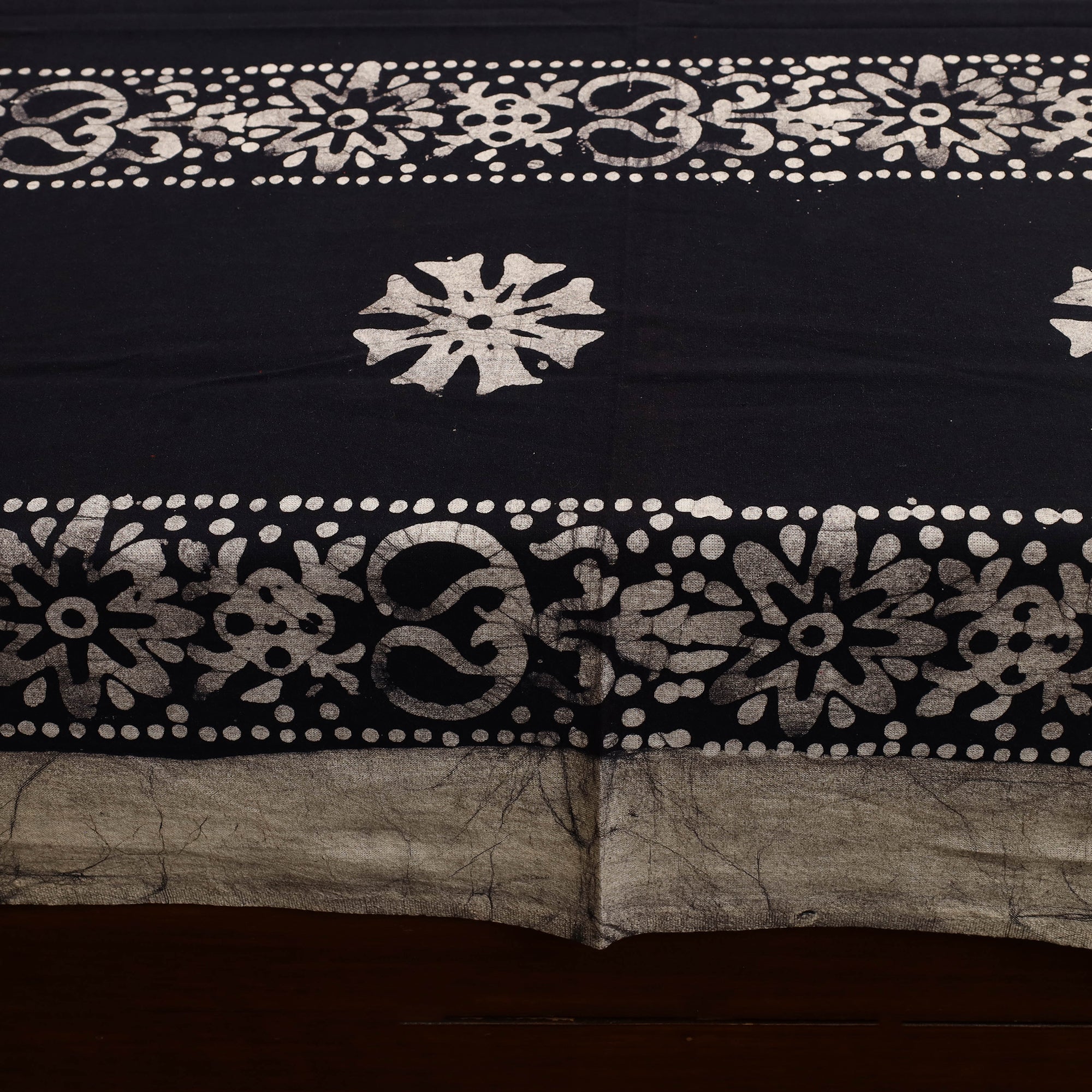 Fine-quality cotton double hand batik print black bed sheet set with matching pillow covers from Ujjain, Madhya Pradesh. Batik is a technique of wax-resist dyeing applied to whole cloth, or cloth made using this technique. This batik cotton bed sheet ensures comfort while adding a touch of cultural elegance to your decor.