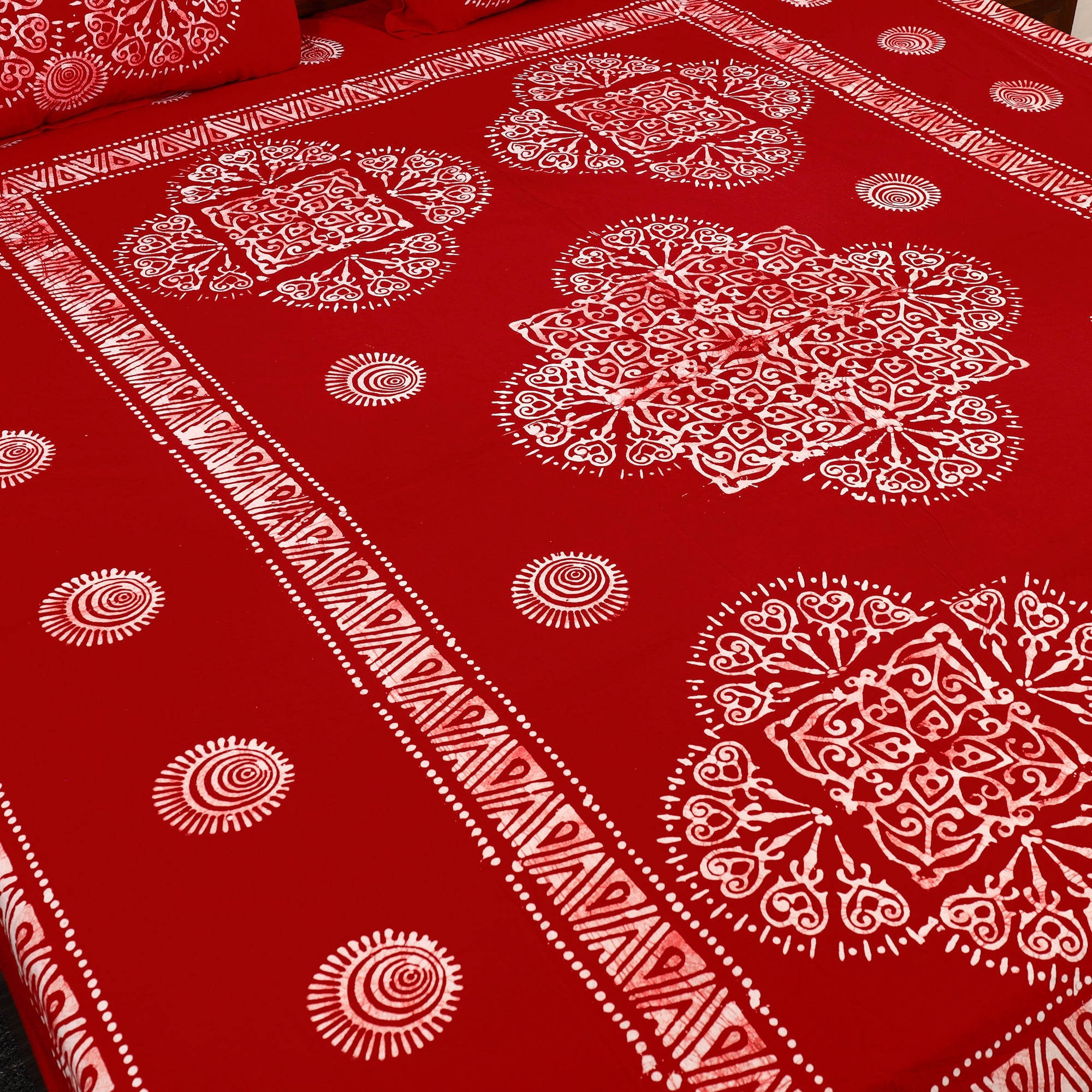 Fine-quality cotton double hand batik print green bed sheet set with matching pillow covers from Ujjain, Madhya Pradesh. Batik is a technique of wax-resist dyeing applied to whole cloth, or cloth made using this technique. This batik cotton bed sheet ensures comfort while adding a touch of cultural elegance to your decor.