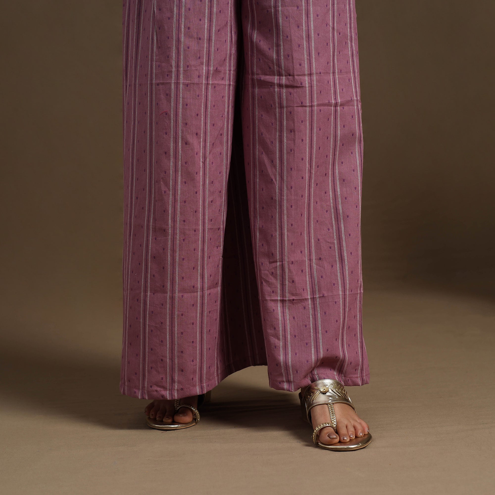 Elevate your everyday style with this cotton purple flared jacquard palazzo. Designed with an elasticated waistband for a comfortable fit, its breathable fabric and flowy silhouette ensure all-day ease. This versatile wardrobe essential effortlessly combines comfort and style, making it perfect to pair with your favorite tops and accessories. This piece carries tiny knots, thread pulls, or uneven lines — not flaws, but fingerprints. Every irregularity is a whisper from the hands that made it. It’s what happens when tradition weaves through time, not machines. If you’re looking for perfection, this isn’t it. But if you’re looking for soul — you’ve found it.