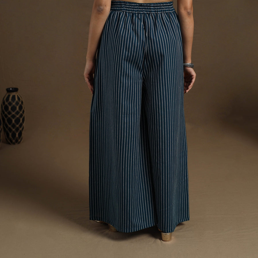 Elevate your everyday style with this cotton teal blue flared jacquard palazzo. Designed with an elasticated waistband for a comfortable fit, its breathable fabric and flowy silhouette ensure all-day ease. This versatile wardrobe essential effortlessly combines comfort and style, making it perfect to pair with your favorite tops and accessories. This piece carries tiny knots, thread pulls, or uneven lines — not flaws, but fingerprints. Every irregularity is a whisper from the hands that made it. It’s what happens when tradition weaves through time, not machines. If you’re looking for perfection, this isn’t it. But if you’re looking for soul — you’ve found it.