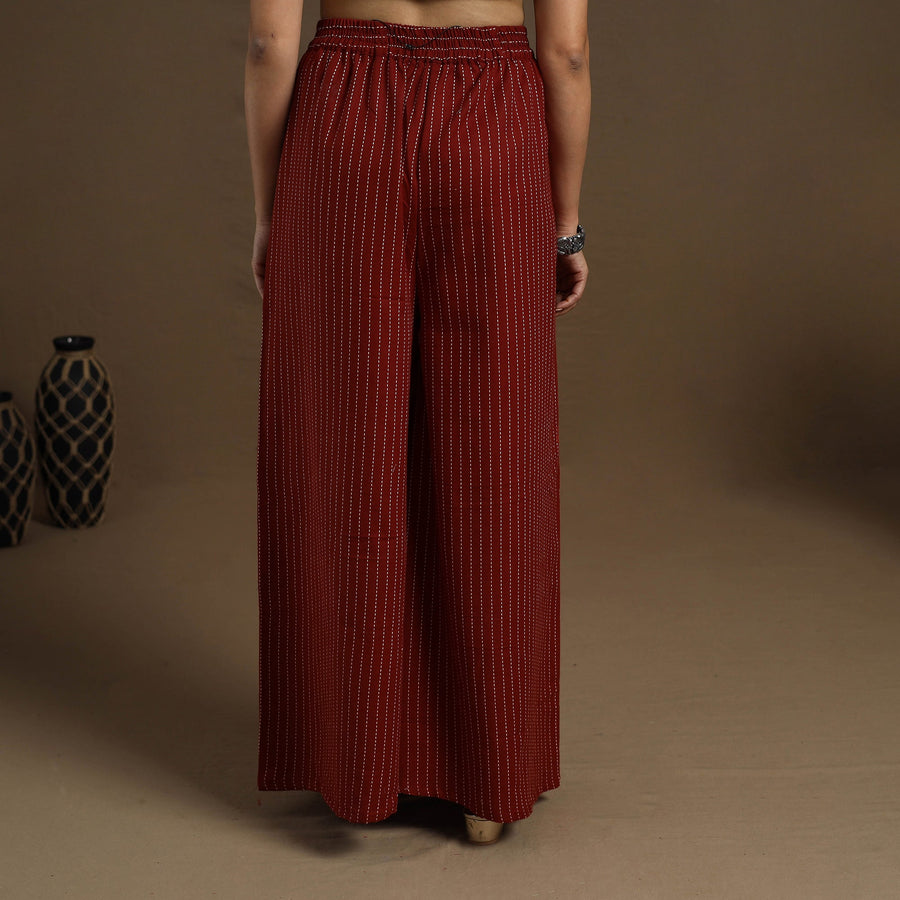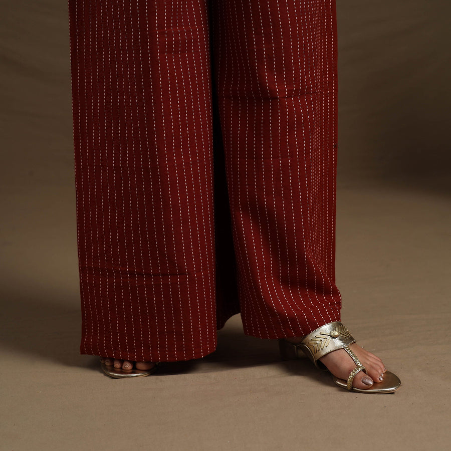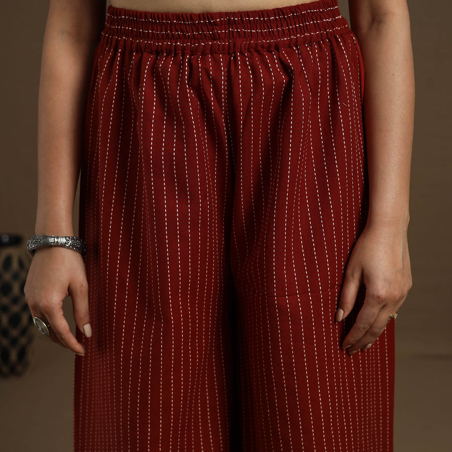 Elevate your everyday style with this cotton maroon flared jacquard palazzo. Designed with an elasticated waistband for a comfortable fit, its breathable fabric and flowy silhouette ensure all-day ease. This versatile wardrobe essential effortlessly combines comfort and style, making it perfect to pair with your favorite tops and accessories. This piece carries tiny knots, thread pulls, or uneven lines — not flaws, but fingerprints. Every irregularity is a whisper from the hands that made it. It’s what happens when tradition weaves through time, not machines. If you’re looking for perfection, this isn’t it. But if you’re looking for soul — you’ve found it.