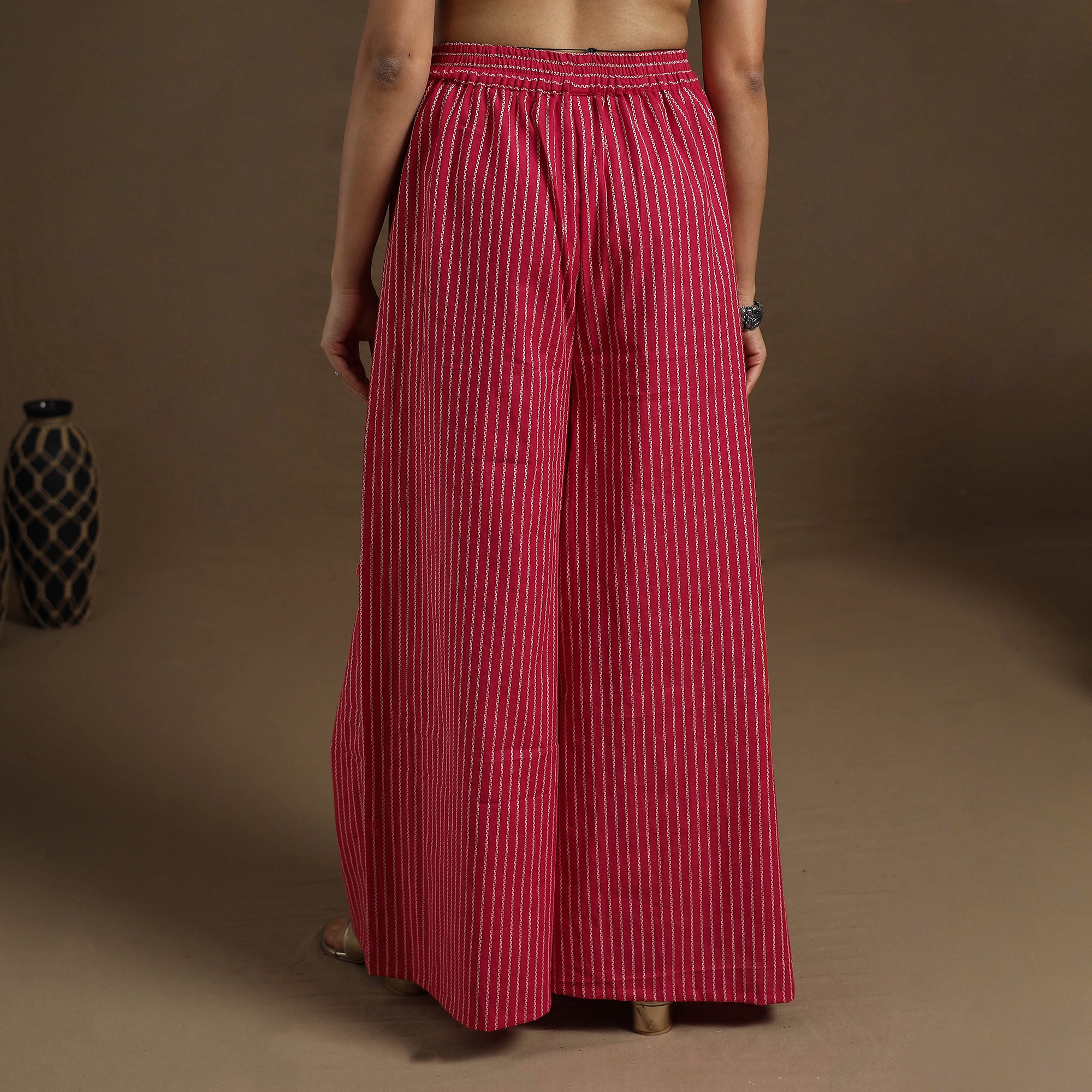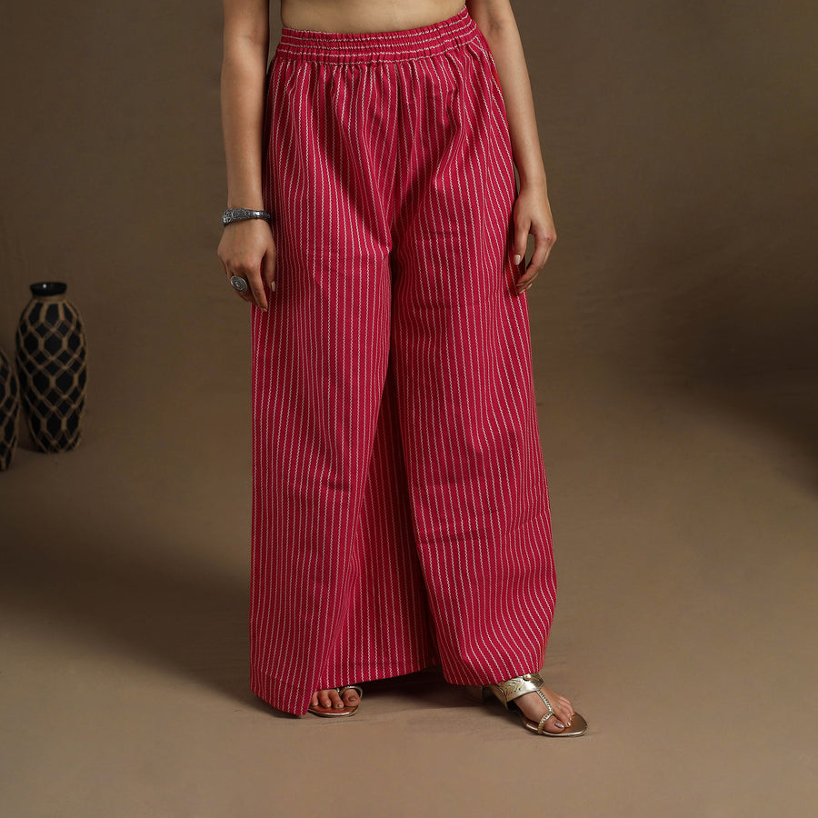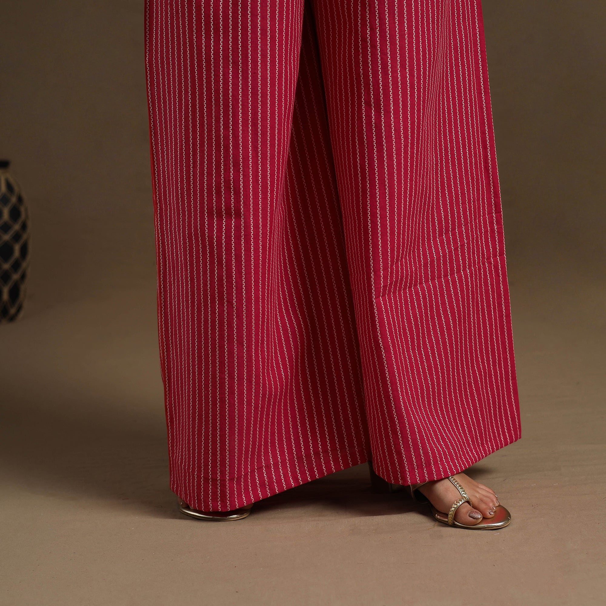 Elevate your everyday style with this cotton red flared jacquard palazzo. Designed with an elasticated waistband for a comfortable fit, its breathable fabric and flowy silhouette ensure all-day ease. This versatile wardrobe essential effortlessly combines comfort and style, making it perfect to pair with your favorite tops and accessories. This piece carries tiny knots, thread pulls, or uneven lines — not flaws, but fingerprints. Every irregularity is a whisper from the hands that made it. It’s what happens when tradition weaves through time, not machines. If you’re looking for perfection, this isn’t it. But if you’re looking for soul — you’ve found it.