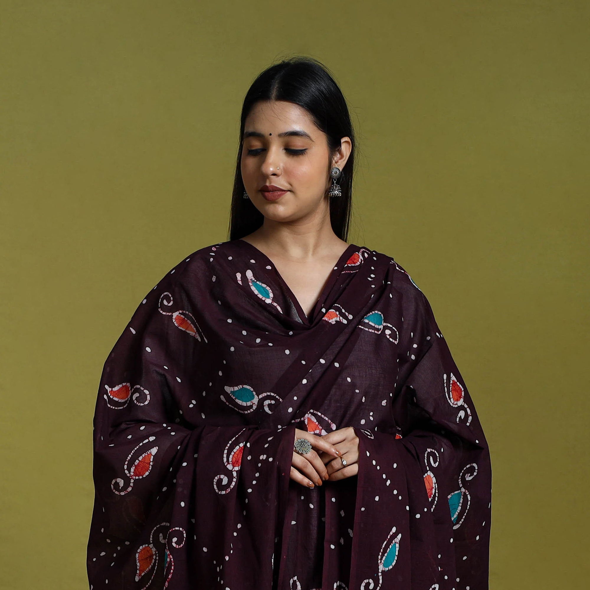 This brown hand batik block-printed cotton dupatta is crafted by skilled artisans, Madhya Pradesh, using the wax-resist dyeing technique. Batik prints are created by applying wax to the fabric before dyeing, resulting in distinct patterns. A craft passed down through generations, batik embodies traditional Indian textile artistry. Lightweight and breathable, this dupatta is ideal for daily wear or pairing with ethnic outfits.