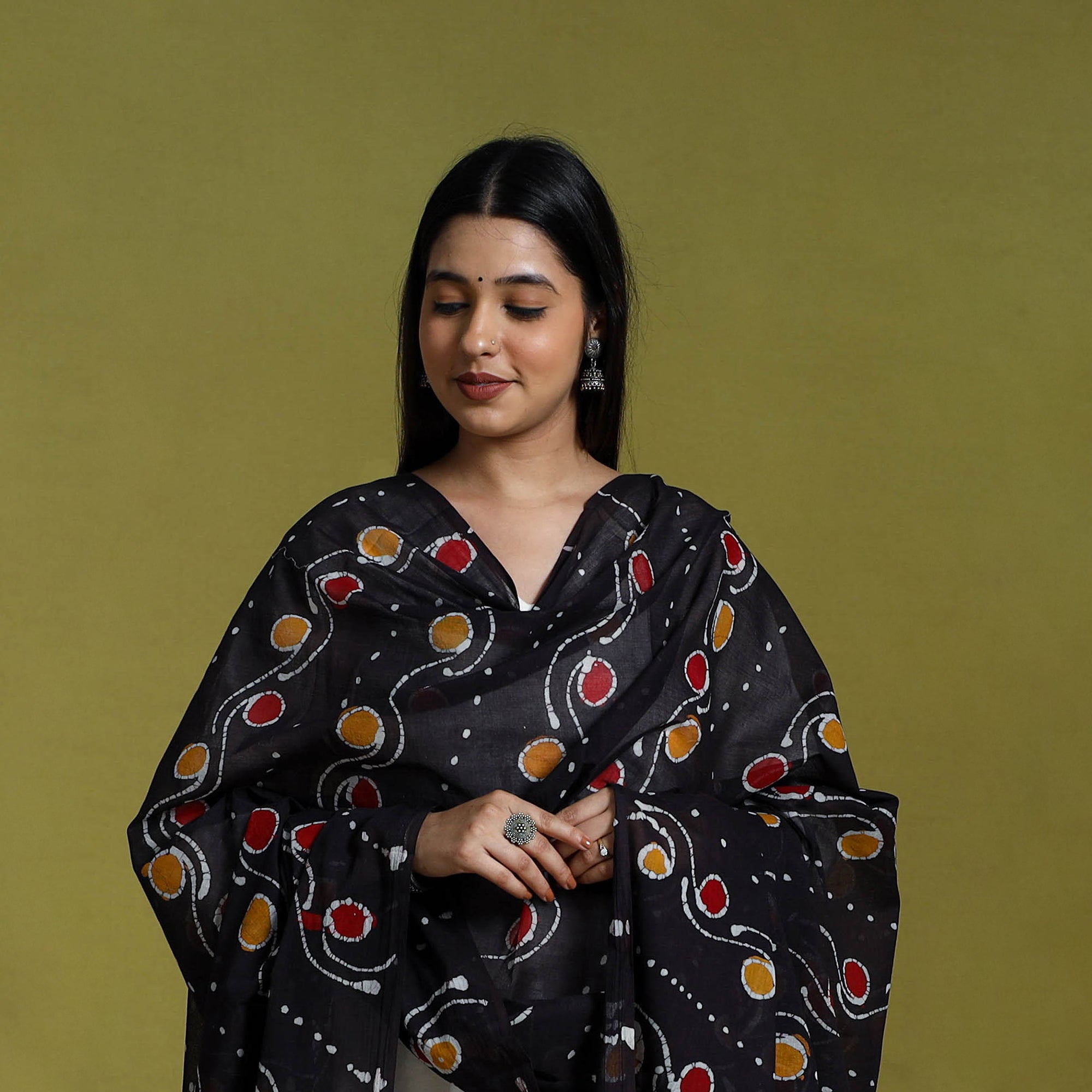 This black hand batik block-printed cotton dupatta is crafted by skilled artisans, Madhya Pradesh, using the wax-resist dyeing technique. Batik prints are created by applying wax to the fabric before dyeing, resulting in distinct patterns. A craft passed down through generations, batik embodies traditional Indian textile artistry. Lightweight and breathable, this dupatta is ideal for daily wear or pairing with ethnic outfits.
