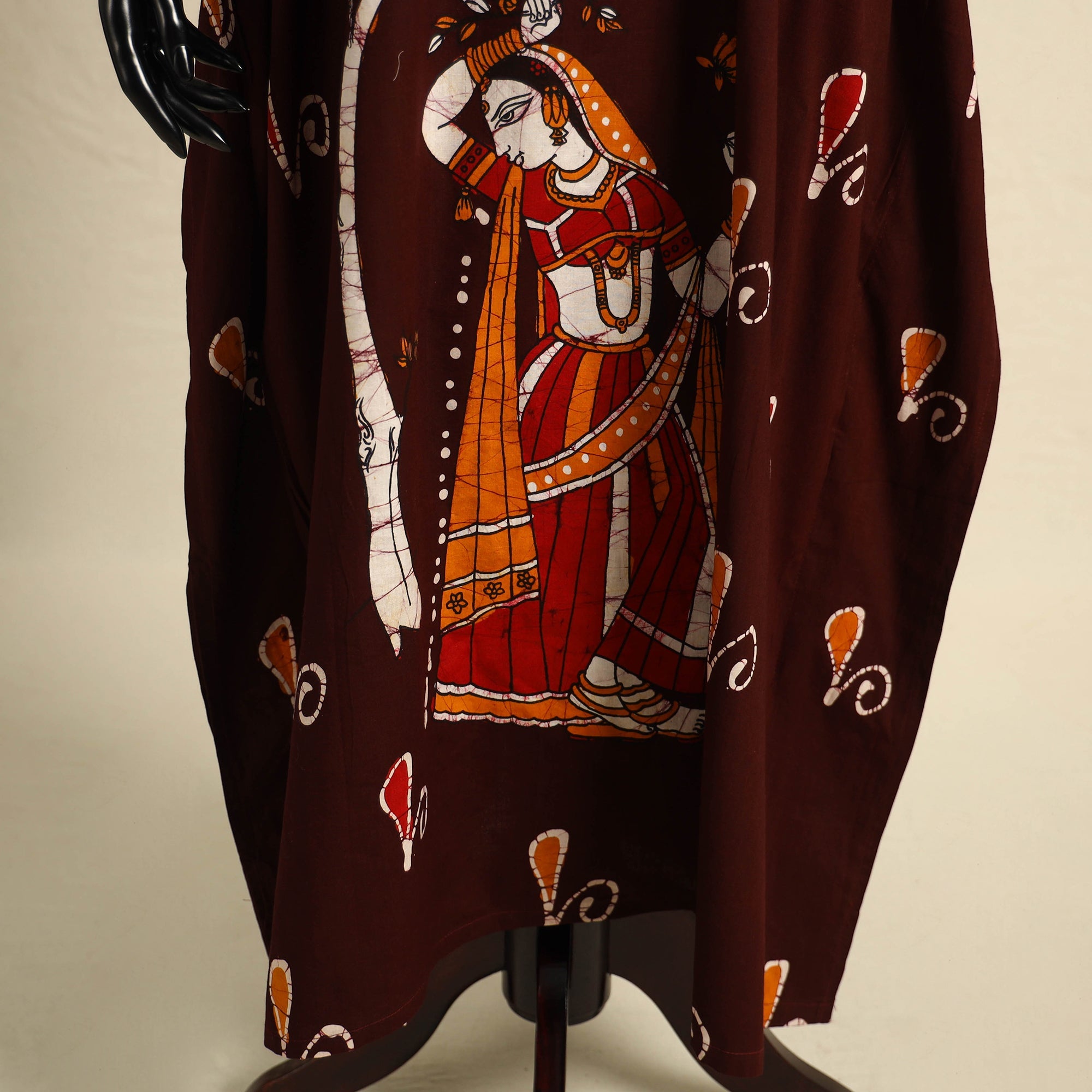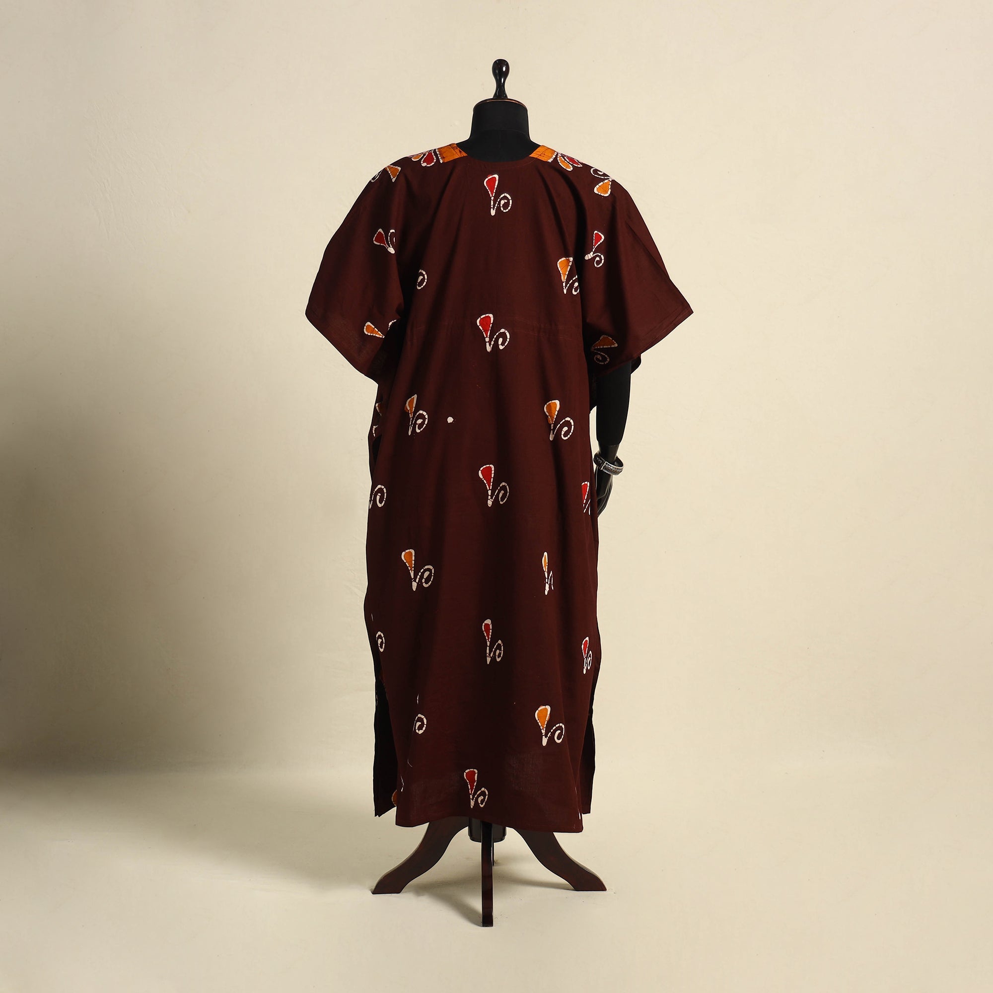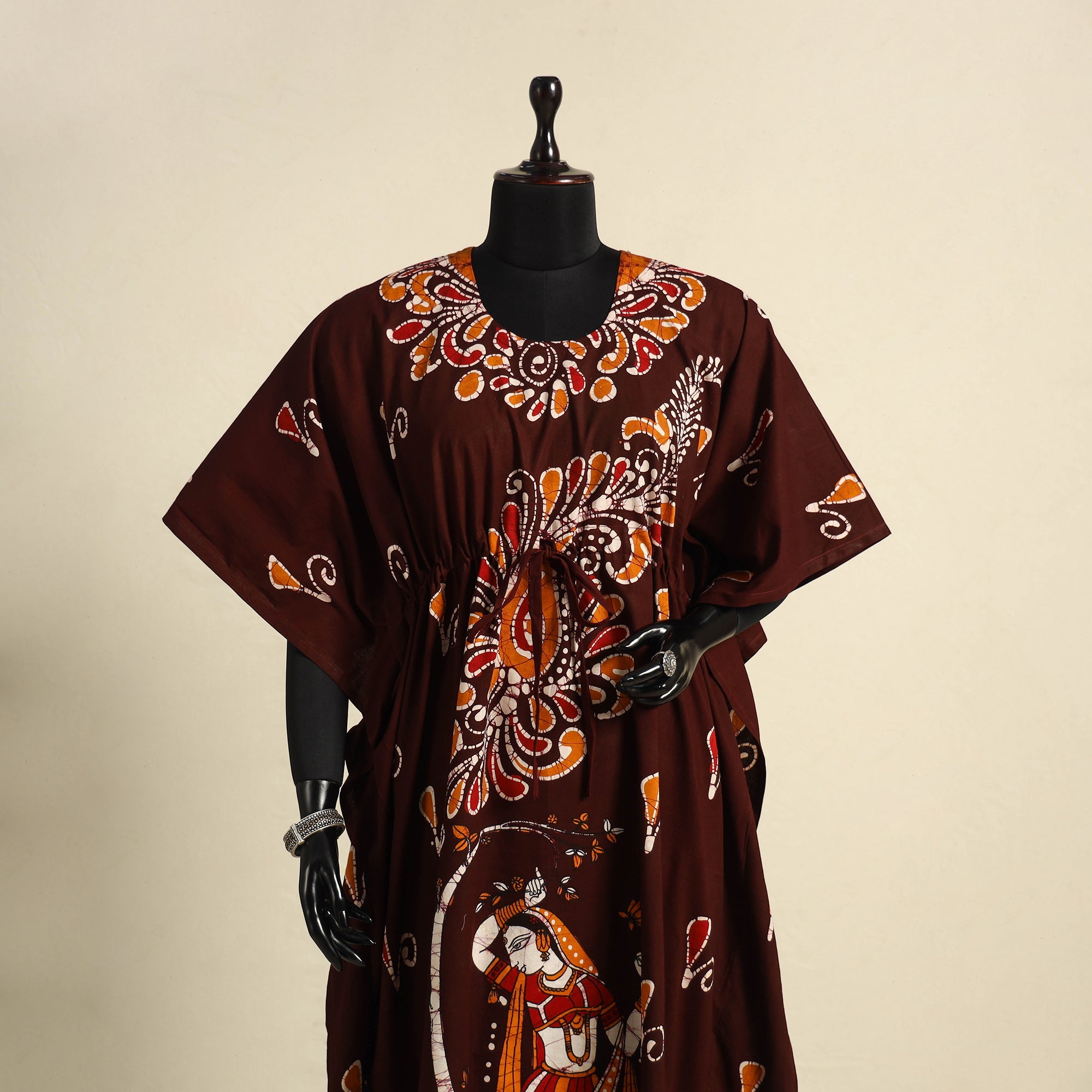 This brown cotton long kaftan features batik block print, created with the traditional wax-resist dyeing technique. Designed with flowing sleeves and an adjustable drawstring waist, it combines comfort with timeless style. The loose fit allows easy movement, while the soft cotton fabric keeps it breathable and lightweight. A perfect blend of tradition and ease, this kaftan is ideal for relaxed wear, offering a customized fit and a graceful look.