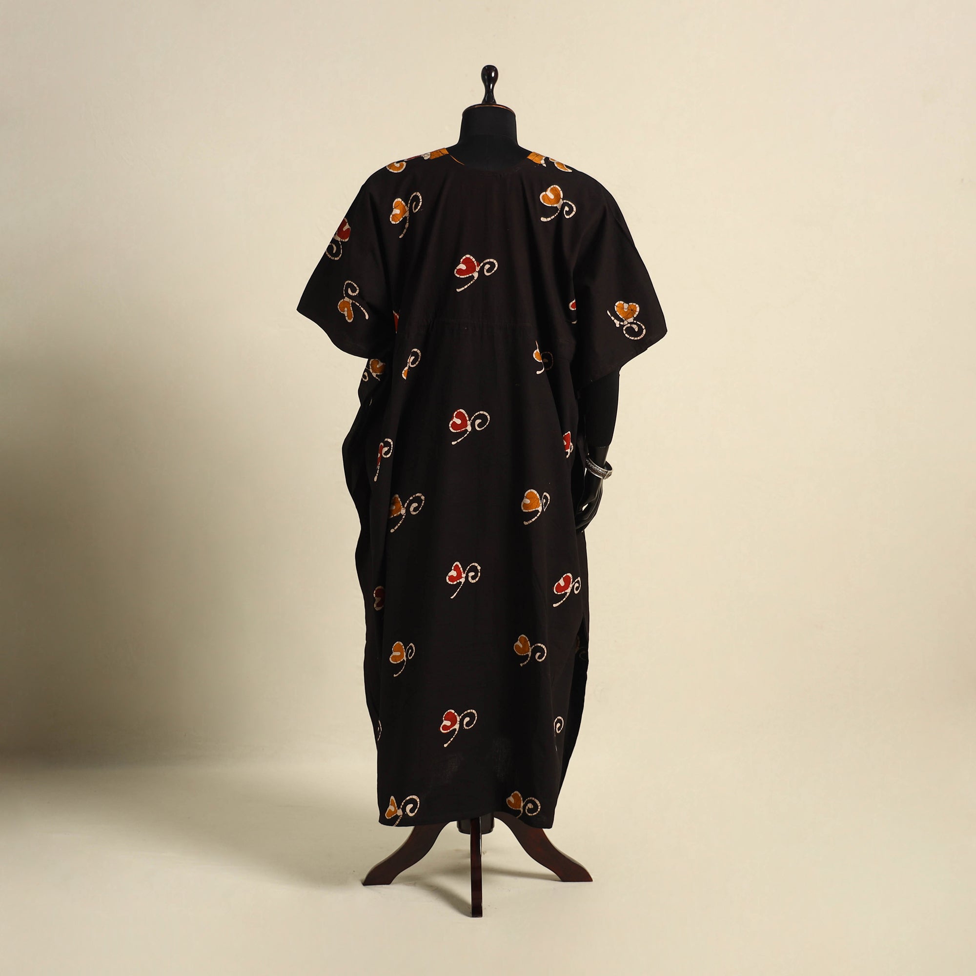 This black cotton long kaftan features batik block print, created with the traditional wax-resist dyeing technique. Designed with flowing sleeves and an adjustable drawstring waist, it combines comfort with timeless style. The loose fit allows easy movement, while the soft cotton fabric keeps it breathable and lightweight. A perfect blend of tradition and ease, this kaftan is ideal for relaxed wear, offering a customized fit and a graceful look.