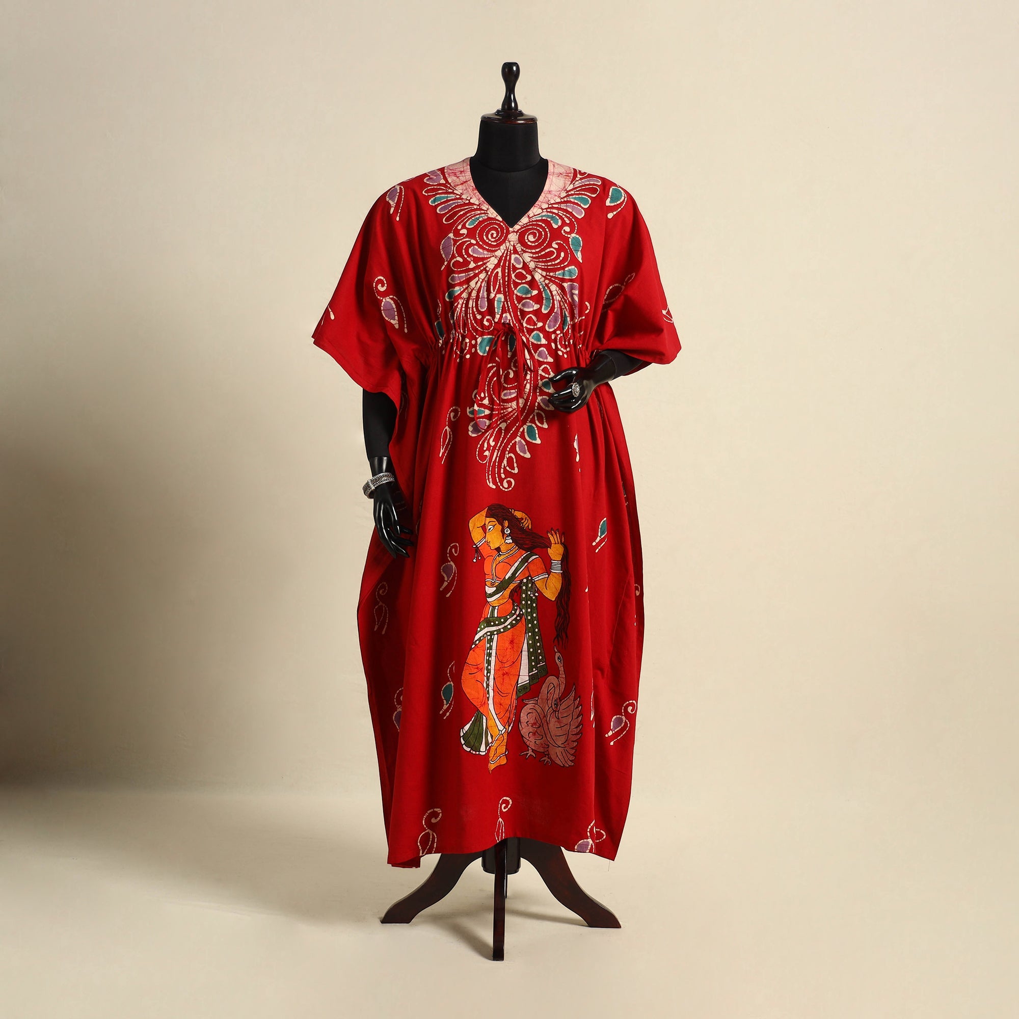 This red cotton long kaftan features batik block print, created with the traditional wax-resist dyeing technique. Designed with flowing sleeves and an adjustable drawstring waist, it combines comfort with timeless style. The loose fit allows easy movement, while the soft cotton fabric keeps it breathable and lightweight. A perfect blend of tradition and ease, this kaftan is ideal for relaxed wear, offering a customized fit and a graceful look.