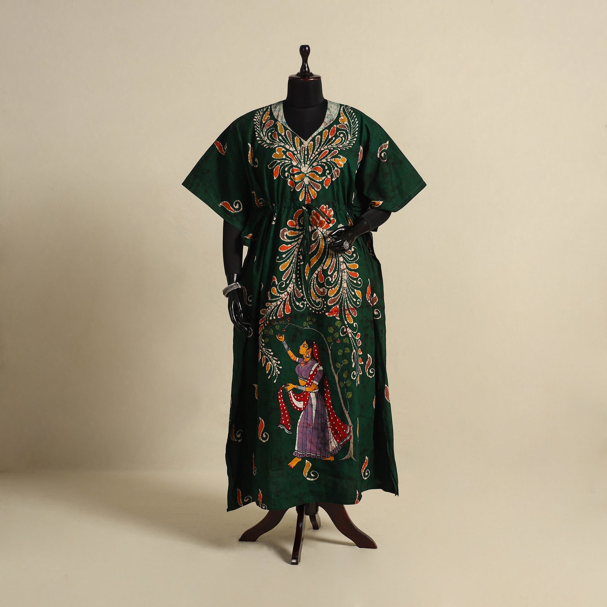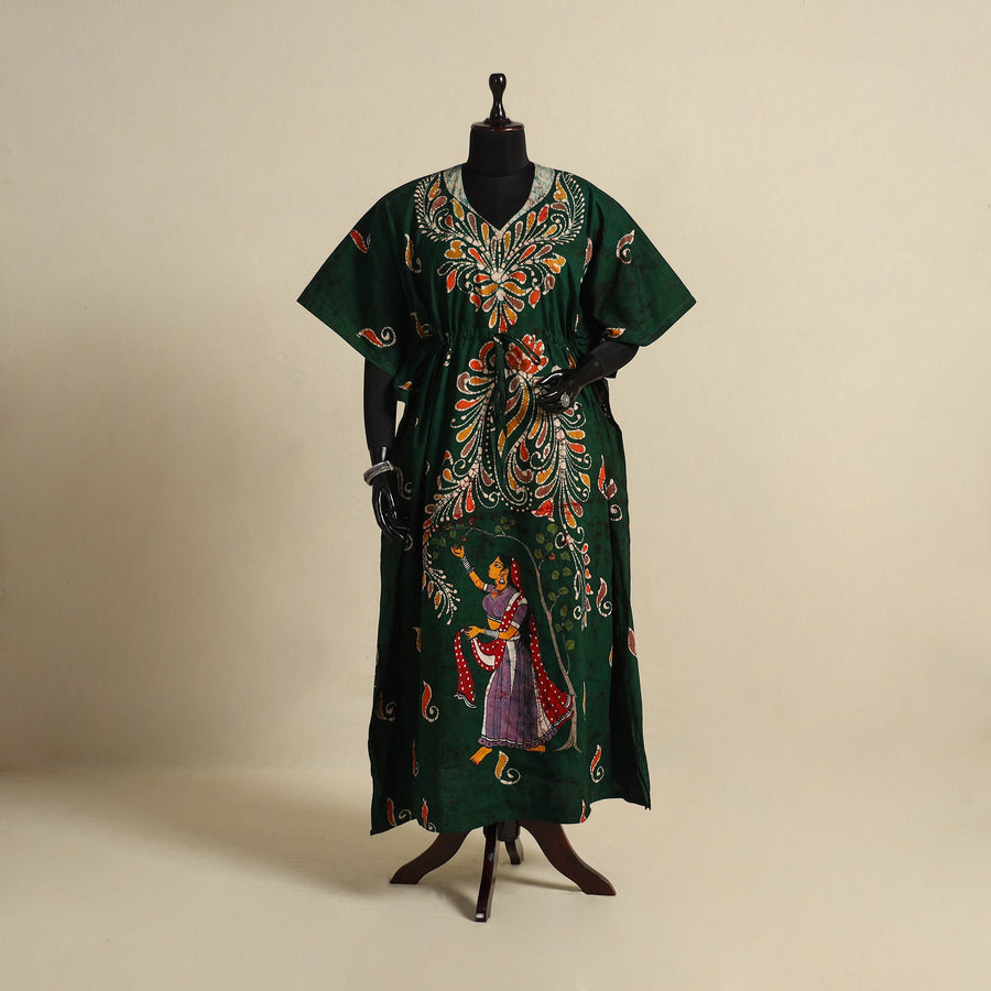 This green cotton long kaftan features batik block print, created with the traditional wax-resist dyeing technique. Designed with flowing sleeves and an adjustable drawstring waist, it combines comfort with timeless style. The loose fit allows easy movement, while the soft cotton fabric keeps it breathable and lightweight. A perfect blend of tradition and ease, this kaftan is ideal for relaxed wear, offering a customized fit and a graceful look.