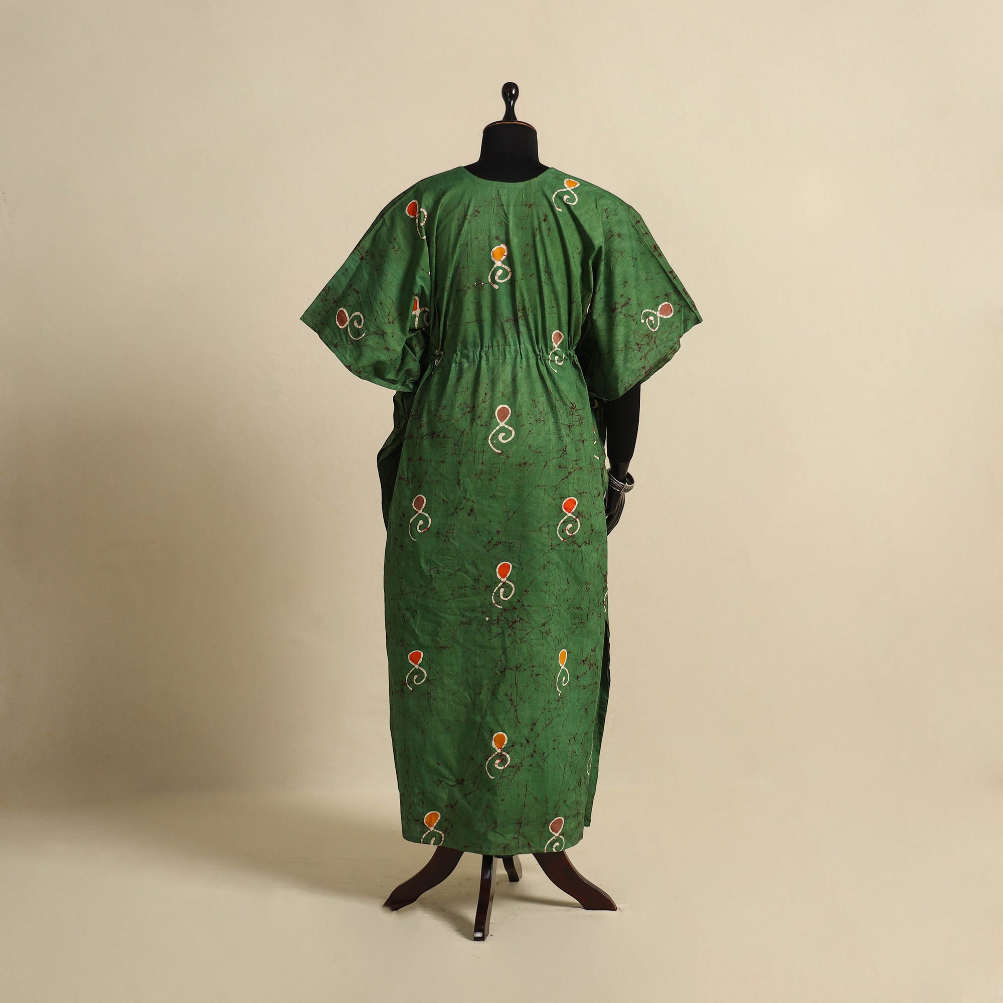 This green cotton long kaftan features batik block print, created with the traditional wax-resist dyeing technique. Designed with flowing sleeves and an adjustable drawstring waist, it combines comfort with timeless style. The loose fit allows easy movement, while the soft cotton fabric keeps it breathable and lightweight. A perfect blend of tradition and ease, this kaftan is ideal for relaxed wear, offering a customized fit and a graceful look.