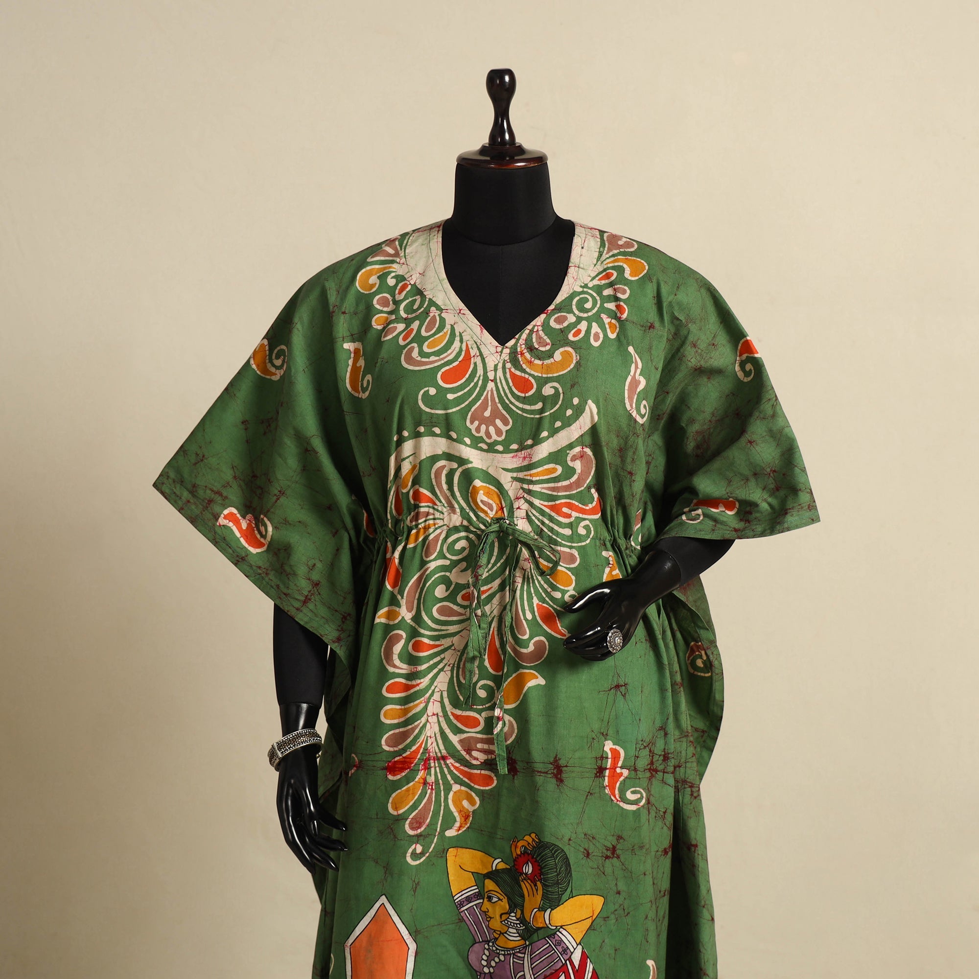 This green cotton long kaftan features batik block print, created with the traditional wax-resist dyeing technique. Designed with flowing sleeves and an adjustable drawstring waist, it combines comfort with timeless style. The loose fit allows easy movement, while the soft cotton fabric keeps it breathable and lightweight. A perfect blend of tradition and ease, this kaftan is ideal for relaxed wear, offering a customized fit and a graceful look.
