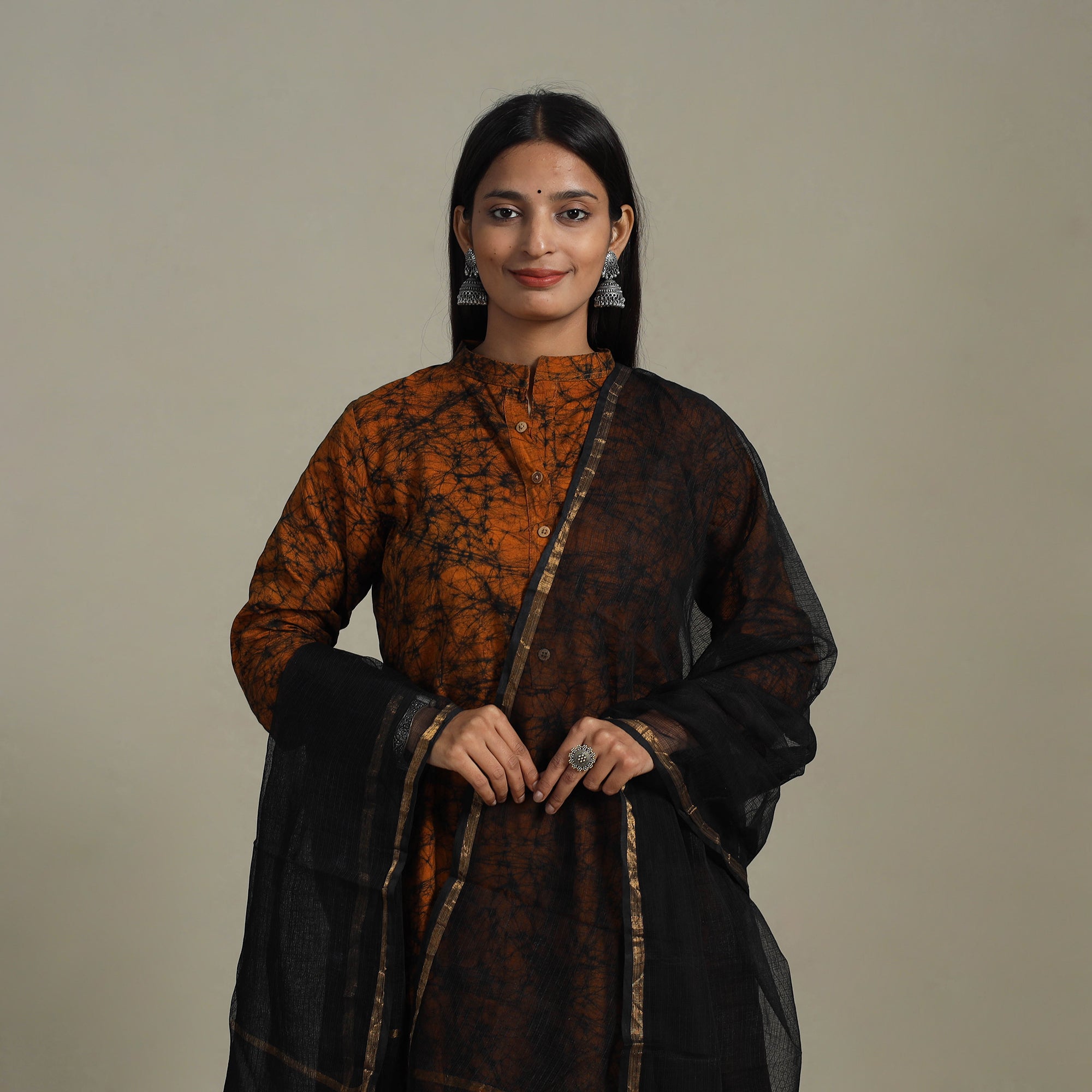 A perfect blend of everyday elegance and heritage craft, this orange cotton kurta set features intricate batik block prints. Created using the traditional wax-resist dyeing technique, the set includes an A-line kurta with a handy side pocket, plain cotton palazzo pants with two utility pockets, and a lightweight kota doria dupatta that lends a breezy, graceful finish. Designed for breathable comfort and artisanal charm, this ensemble suits both festive sparkle and everyday ease.