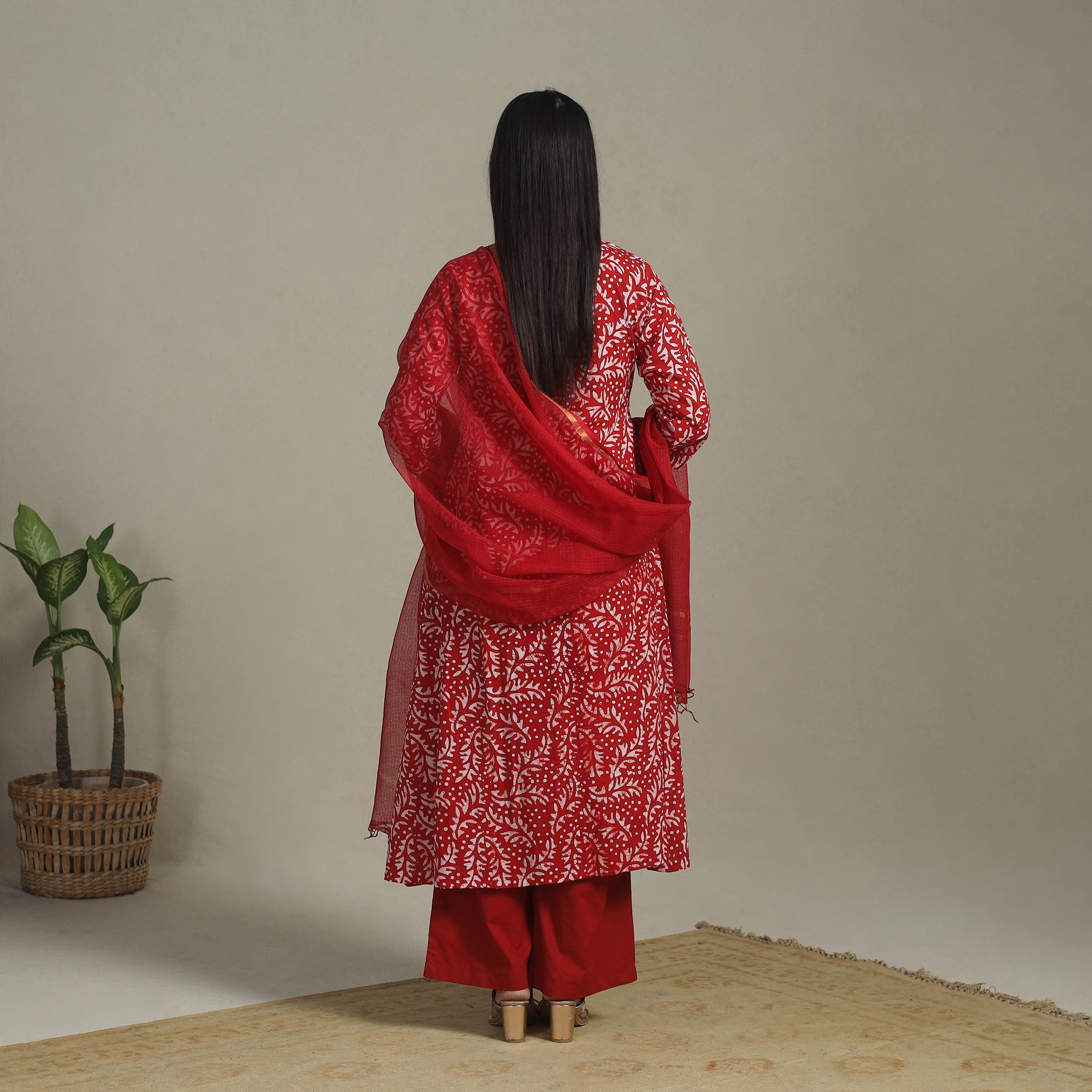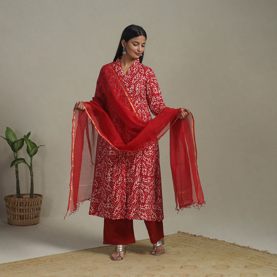 A perfect blend of everyday elegance and heritage craft, this red cotton kurta set features intricate batik block prints. Created using the traditional wax-resist dyeing technique, the set includes an A-line kurta with a handy side pocket, plain cotton palazzo pants with two utility pockets, and a lightweight kota doria dupatta that lends a breezy, graceful finish. Designed for breathable comfort and artisanal charm, this ensemble suits both festive sparkle and everyday ease.