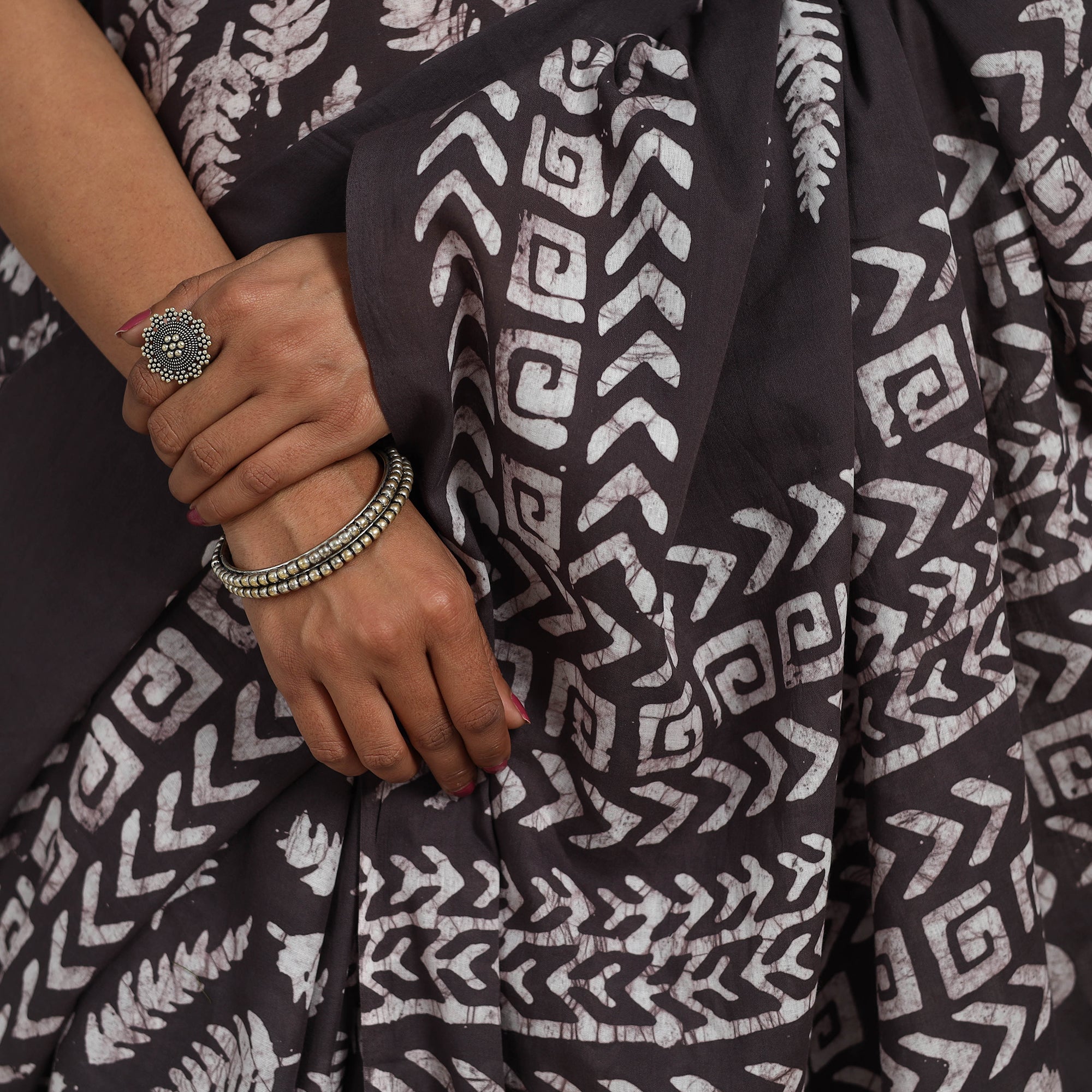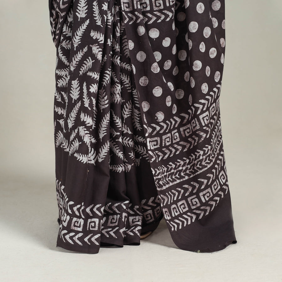Wrap yourself in heritage with exquisite cotton brown hand batik block print saree, crafted using the age-old wax-resist dyeing technique. The intricate cracks in the wax form unique textures, making each piece truly one of a kind. Made from soft, breathable cotton, it offers all-day comfort. Whether for casual elegance or cultural celebrations, this saree is a timeless addition to your wardrobe.