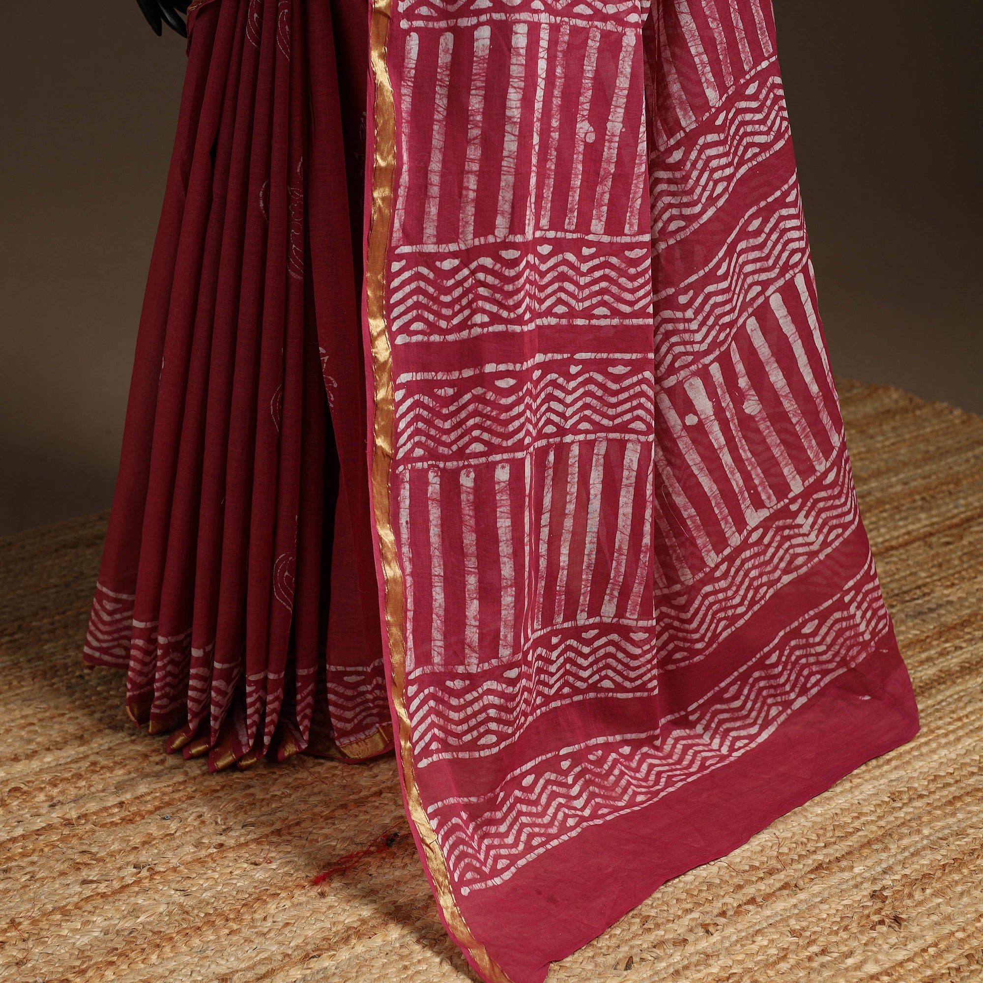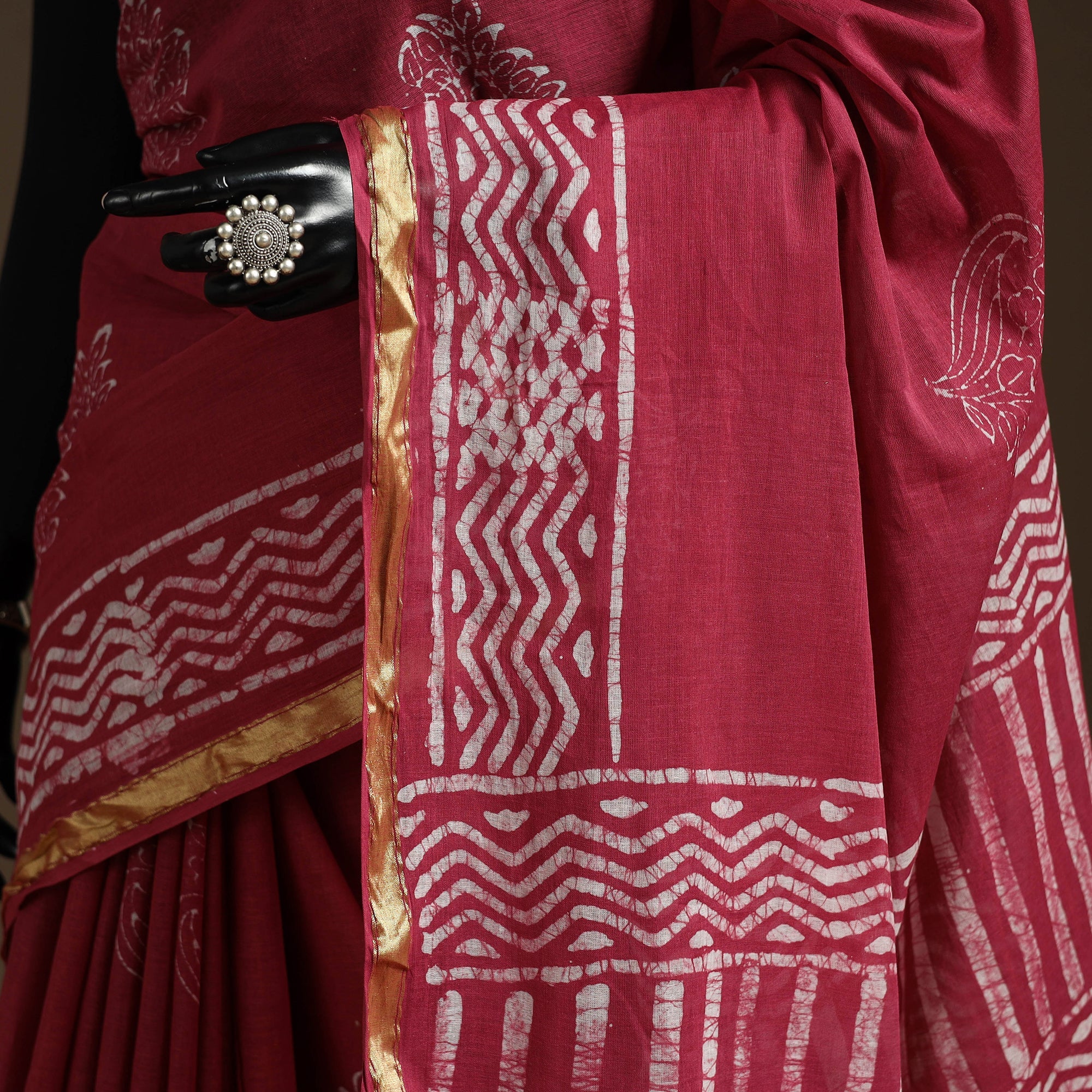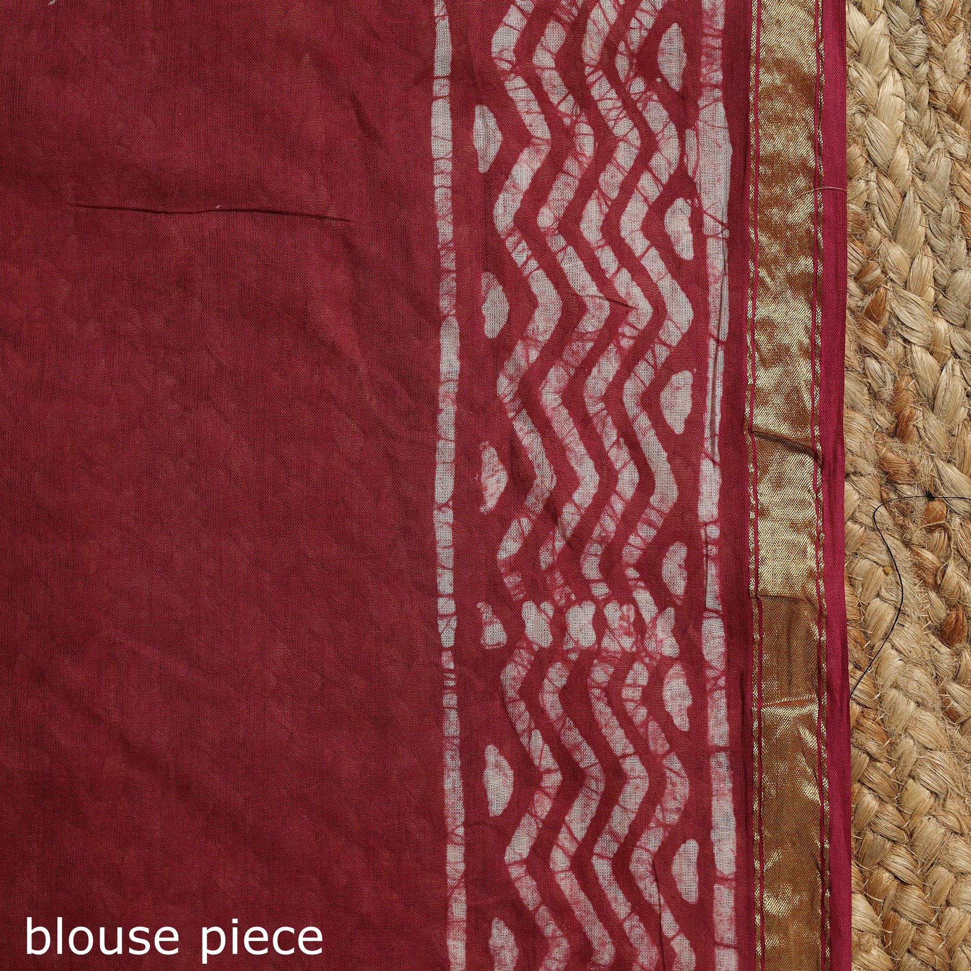 Step into timeless elegance with this red cotton batik saree adorned with a classic zari border. Created using the intricate wax-resist batik method, the fabric breathes effortlessly for day-long comfort. Paired with a matching blouse piece, it suits festive occasions, cultural events, or everyday graceful dressing.