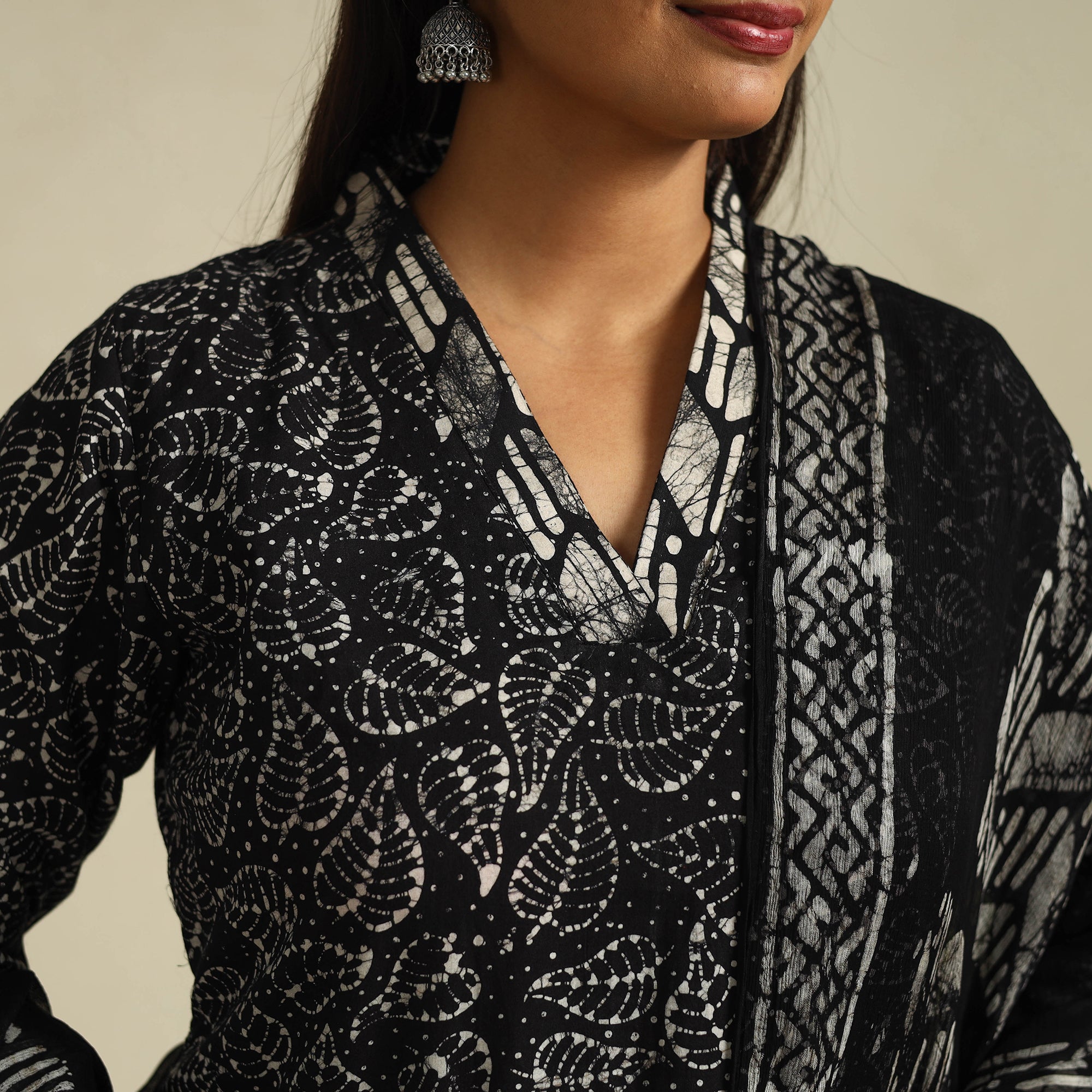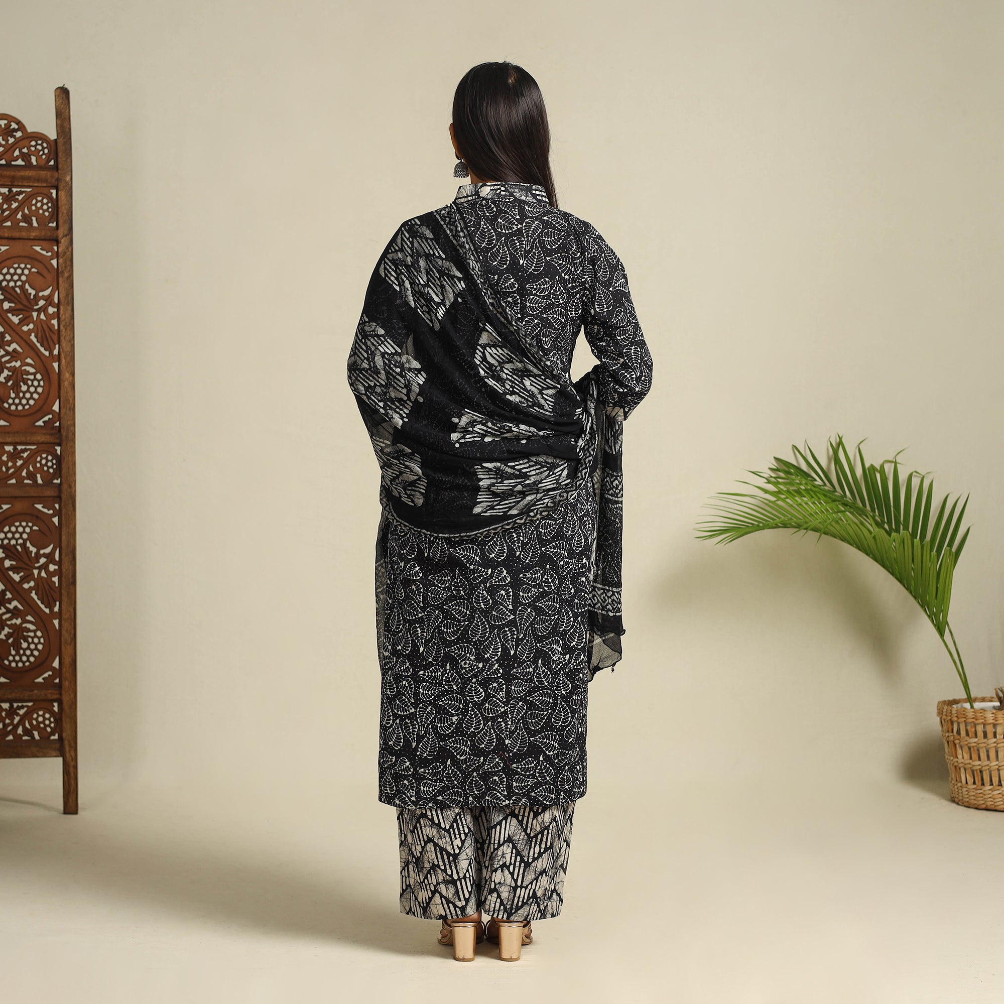 Celebrate the charm of black batik with this hand-printed cotton suit set. Crafted using the traditional wax-resist dyeing technique, it includes a kurta with a side pocket, an elasticated waist palazzo with two pockets, and a chiffon dupatta. Comfortable, breathable, and artistically rich, this set is ideal for festive gatherings or effortless everyday styling.