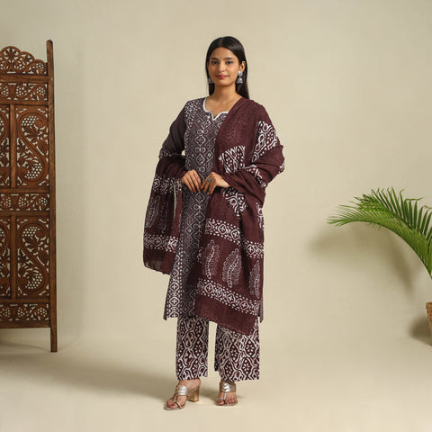 Celebrate the charm of brown batik with this hand-printed cotton suit set. Crafted using the traditional wax-resist dyeing technique, the kurta features batik prints enhanced with delicate kantha stitching and includes a side pocket. Paired with an elasticated waist palazzo with two pockets and a soft mul cotton dupatta, this set is comfortable, breathable, and rich in artistry perfect for festive gatherings or everyday styling.