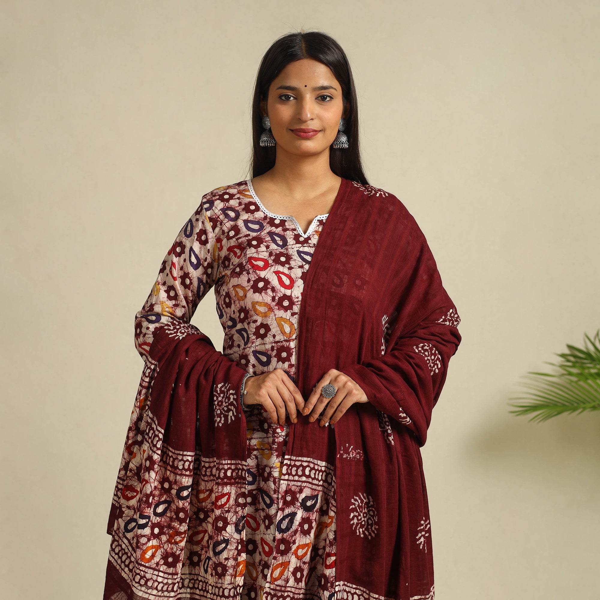 Celebrate the charm of brown batik with this hand-printed cotton suit set. Crafted using the traditional wax-resist dyeing technique, it includes a kurta with a side pocket, an elasticated waist palazzo with two pockets, and a mul cotton dupatta. Comfortable, breathable, and rich in artistry, this set is perfect for festive gatherings or everyday styling.